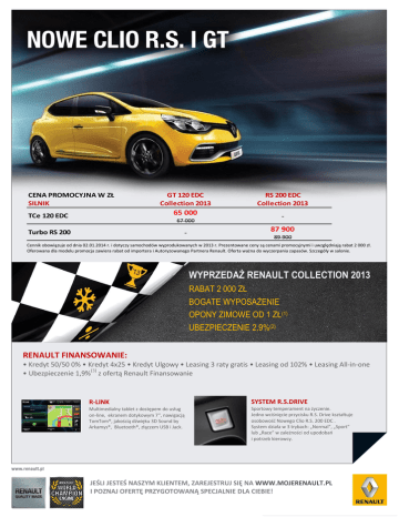 CENA PROMOCYJNA W ZŁ SILNIK GT 120 EDC Collection 2013 TCe 120 EDC 65 000 Turbo RS 200 - 67 000 RS 200 EDC Collection 2013 87 900 89 900 Cennik obowiązuje od dnia 02.01.2014 r. i dotyczy samochodów wyprodukowanych w 2013 r. Prezentowane ceny są cenami promocyjnymi i uwzględniają rabat 2 000 zł. Oferowana dla modelu promocja zawiera rabat od importera i Autoryzowanego Partnera Renault. Oferta ważna do wyczerpania zapasów. Szczegóły w salonie. WYPRZEDAŻ RENAULT COLLECTION 2013 RABAT 2 000 ZŁ BOGATE WYPOSAŻENIE OPONY ZIMOWE OD 1 ZŁ(1) UBEZPIECZENIE 2,9%(2) RENAULT FINANSOWANIE: • Kredyt 50/50 0% • Kredyt 4x25 • Kredyt Ulgowy • Leasing 3 raty gratis • Leasing od 102% • Leasing All-in-one • Ubezpieczenie 1,9%(3) z ofertą Renault Finansowanie R-LINK SYSTEM R.S.DRIVE Multimedialny tablet z dostępem do usług on-line, ekranem dotykowym 7'', nawigacją TomTom®, jakością dźwięku 3D Sound by Arkamys®, Bluetooth®, złączem USB i Jack. Sportowy temperament na życzenie. Jedno wciśnięcie przycisku R.S. Drive kształtuje osobowość Nowego Clio R.S. 200 EDC . System działa w 3 trybach: „Normal”, „Sport” lub „Race” w zależności od upodobań i potrzeb kierowcy. JEŚLI JESTEŚ NASZYM KLIENTEM, ZAREJESTRUJ SIĘ NA WWW.MOJERENAULT.PL I POZNAJ OFERTĘ PRZYGOTOWANĄ SPECJALNIE DLA CIEBIE! WYPOSAŻENIE GT 120 EDC Collection 2013 R.S. 200 EDC Collection 2013 ABS z s ys temem ws poma ga ni a na głego ha mowa ni a Przedni e podus zki powi etrzne ki erowcy i pa s a żera Deza ktywa cja podus zki powi etrznej pa s a żera z przodu Boczne podus zki powi etrzne Regul a tor - ogra ni czni k prędkoś ci Sys tem ws poma ga ni a rus za ni a pod górę (Hi l l Sta rt As s i s t) Sys tem dyna mi cznej kontrol i toru ja zdy (ESC) z funkcją za pobi ega ni a poś l i zgowi kół pędnych przy rus za ni u (ASR) - możl i wy do wyłączeni a w wers ji RS ● ● ● ● ● ● ● ● ● ● ● ● ● ● Sygna ł ni eza pi ętych pa s ów bezpi eczeńs twa (na ws zys tki ch mi ejs ca ch) ● ● ● ● ● ● ● ● Za wi es zeni e Sport typowe dl a wers ji GT ● - Za wi es zeni e Sport typowe dl a wers ji RS - ● Za wi es zeni e CUP - P Czerwone za ci s ki ta rcz ha mul cowych - P Logo Rena ul t z ozna czeni em GT (wers ja GT) l ub RS (wers ja RS) ● ● Przedni zderza k z a erodyna mi czna l i s twą przedni ą w kol orze s za rym i ś wi a tła mi LED - ● Przedni zderza k ze ś wi a tła mi LED ● - Boczne l i s twy ochronne w kol orze na dwozi a z ws ta wka mi w kol orze s za rym ● ● Dyfuzor w kol orze s za rym z wbudowa nymi po boka ch końcówka mi rury wydechowej - ● ● - ● - Obudowy l us terek bocznych w kol orze l ś ni ącej czerni - ● Przedni e zewnętrzne kl a mki drzwi w kol orze na dwozi a ● ● Tyl ne zewnętrzne kl a mki drzwi ukryte przy tyl nym s łupku Tyl ny s pojl er da chowy Szyby tyl ne boczne i tyl na przyci emni a ne Obręcze kół ze s topu meta l i l ekki ch 17" GT ci emnos za re ● ● ● ● ● ● ● - Obręcze kół ze s topu meta l i l ekki ch 17" RS - ● 1900/2100/2300 0 P 1900/2100/6000 0/650 Tona cja gra fi towa wnętrza Ta pi cerka gra fi towa z czerwonymi el ementa mi Ta pi cerka s kórza na Ta pi cerka gra fi towo- s za ra , z el ementa mi s kóry ekol ogi cznej Al umi ni owe peda ły Li s twy progowe z na pi s em Rena ul t Sport Ki erowni ca s kórza na z łopa tka mi s terującymi s krzyni ą bi egów ● ● ● ● ● ● ● 5000 ● ● ● Des ka rozdzi el cza z ozna czeni em Rena ul t Sport ● ● Wewnętrzne el ementy ozdobne w kol orze czerwonym - ● Wewnętrzne el ementy ozdobne w kol orze s za rym ● ● ● Świ a tła do ja zdy dzi ennej z di oda mi LED Czujni k ś wi a tła i des zczu ● ● ● ● Lus terka boczne s kła da ne el ektryczni e, podgrzewa ne, z czujni ki em tempera tury zewnętrznej ● ● BEZPIECZEŃSTWO CZYNNE I BIERNE Przedni e pa s y bezpi eczeńs twa z regul a cją wys okoś ci , ogra ni czni ki em na pi ęci a i na pi na czem Tyl ne pa s y bezpi eczeńs twa : 3-punktowe, z ogra ni czni ka mi na pi ęci a na bocznych mi ejs ca ch Sys tem mocowa ni a fotel i ków dl a dzi ecka Is ofi x na bocznych mi ejs ca ch z tyłu i mi ejs ca pa s a żera z przodu (tyłem do ki erunku ja zdy) WYGLĄD ZEWNĘTRZNY Tyl ny zderza k z ozdobną l i s twą w kol orze s za rym i chromowa ną, podwójną rurą wydechu (ozdobna l i s twa w przypa dku za mówi eni a ka mery cofa ni a ) Obudowy l us terek bocznych w kol orze s za rym Obręcze kół ze s topu meta l i l ekki ch 18" Ra di ca l e w kol orze cza rnym La ki er meta l i zowa ny/ meta l i zowa ny s pecja l ny/ meta l i zowa ny s pecja l ny GT l ub RS La ki er ni emeta l i zowa ny/ ni emeta l i zowa ny s pecja l ny WYGLĄD WNĘTRZA Wewnętrzne kl a mki drzwi chromowa ne WIDOCZNOŚĆ I OŚWIETLENIE GT 120 EDC Collection 2013 R.S. 200 EDC Collection 2013 ● ● 300 ● - ● ● 300 ● 1000 1500 1500 ● ● ● ● ● ● ● 0 ● ● 1000 1000 - ● - ● ● ● ● ● - Klimatyzacja automatyczna ● ● Szyby przednie regulowane elektrycznie ( włącznik impulsowy po stronie kierowcy) ● ● Szyby tylne regulowane elektrycznie Osłona przeciwsłoneczna z zamykanym lusterkiem po stronie kierowcy Osłona przeciwsłoneczna po stronie pasażera bez lusterka/z lusterkiem Uchwyt po stronie pasażera z przodu i na dwóch bocznych miejscach z tyłu Fotel kierowcy z regulacją wysokości Zagłówki przednie z regulacją wysokości Tylna kanapa dzielona w układzie 1/3-2/3 (oparcie) z 3 zagłówkami z regulacją wysokości ● ● ● ● ● ● ● ● ● ● ● ● ● ● Fotele przednie podgrzewane - 1000 System Renault BASS REFLEX ● ● Renault R-Sound Effect - aplikacja dostępna z R-link , zmieniająca dźwięk silnika słyszalny we wnętrzu ● PROWADZENIE POJAZDU i URZĄDZENIA KONTROLNE Karta Renault hands free Elektryczne, zmienne wpomaganie układu kierowniczego Instalacja do montażu alarmu Kierownica z regulacj