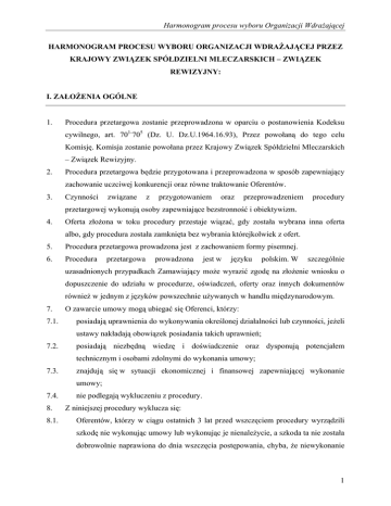 Harmonogram procesu wyboru Organizacji Wdrażającej HARMONOGRAM PROCESU WYBORU ORGANIZACJI WDRAŻAJĄCEJ PRZEZ KRAJOWY ZWIĄZEK SPÓŁDZIELNI MLECZARSKICH – ZWIĄZEK REWIZYJNY: I. ZAŁOŻENIA OGÓLNE 1. Procedura przetargowa zostanie przeprowadzona w oparciu o postanowienia Kodeksu cywilnego, art. 701-705 (Dz. U. Dz.U.1964.16.93), Przez powołaną do tego celu Komisję. Komisja zostanie powołana przez Krajowy Związek Spółdzielni Mleczarskich – Związek Rewizyjny. 2. Procedura przetargowa będzie przygotowana i przeprowadzona w sposób zapewniający zachowanie uczciwej konkurencji oraz równe traktowanie Oferentów. 3. Czynności związane z przygotowaniem oraz przeprowadzeniem procedury przetargowej wykonują osoby zapewniające bezstronność i obiektywizm. 4. Oferta złożona w toku procedury przestaje wiązać, gdy została wybrana inna oferta albo, gdy procedura została zamknięta bez wybrania którejkolwiek z ofert. 5. Procedura przetargowa prowadzona jest z zachowaniem formy pisemnej. 6. Procedura przetargowa prowadzona jest w języku polskim. W szczególnie uzasadnionych przypadkach Zamawiający może wyrazić zgodę na złożenie wniosku o dopuszczenie do udziału w procedurze, oświadczeń, oferty oraz innych dokumentów również w jednym z języków powszechnie używanych w handlu międzynarodowym. 7. 7.1. O zawarcie umowy mogą ubiegać się Oferenci, którzy: posiadają uprawnienia do wykonywania określonej działalności lub czynności, jeżeli ustawy nakładają obowiązek posiadania takich uprawnień; 7.2. posiadają niezbędną wiedzę i doświadczenie oraz dysponują potencjałem technicznym i osobami zdolnymi do wykonania umowy; 7.3. znajdują się w sytuacji ekonomicznej i finansowej zapewniającej wykonanie umowy; 7.4. 8. 8.1. nie podlegają wykluczeniu z procedury. Z niniejszej procedury wyklucza się: Oferentów, którzy w ciągu ostatnich 3 lat przed wszczęciem procedury wyrządzili szkodę nie wykonując umowy lub wykonując je nienależycie, a szkoda ta nie została dobrowolnie naprawiona do dnia wszczęcia postępowania, chyba, że niewykonanie 1 Harmonogram procesu wyboru Organizacji Wdrażającej lub nienależyte wykonanie jest następstwem okoliczności, za które Oferent nie ponosi odpowiedzialności; 8.2. Oferentów, w stosunku, do których otwarto likwidację lub, których upadłość ogłoszono, z wyjątkiem Oferentów, którzy po ogłoszeniu upadłości zawarli układ zatwierdzony prawomocnym postanowieniem sądu, jeżeli układ nie przewiduje zaspokojenia wierzycieli poprzez likwidację majątku upadłego; 8.3. Oferentów, którzy zalegają z uiszczeniem podatków, opłat lub składek na ubezpieczenia społeczne lub zdrowotne, z wyjątkiem przypadków, gdy uzyskali oni przewidziane prawem zwolnienie, odroczenie, rozłożenie na raty zaległych płatności lub wstrzymanie w całości wykonania decyzji właściwego organu; 8.4. Oferentów, którzy nie spełniają warunków udziału w postępowaniu, o których mowa w ust.7 8.5. 8.5.1. Z procedury wyklucza się również Oferentów, którzy: Wykonywali bezpośrednio czynności związane z przygotowaniem prowadzonej procedury lub posługiwali się w celu sporządzenia oferty osobami uczestniczącymi w dokonywaniu tych czynności; 8.5.2. Oferentów, którzy mieli możliwość zapoznania się z warunkami merytorycznymi procedury sposób inny niż opisany w pkt 8.5.1 przed dniem wszczęcia procedury i ogłoszenia zaproszenia do składania wniosków o dopuszczenie do udziału w procedurze; 8.5.3. Złożyli nieprawdziwe informacje mające wpływ na wynik prowadzonego postępowania; 8.5.4. Nie złożyli oświadczenia o spełnianiu warunków udziału w postępowaniu lub dokumentów potwierdzających spełnianie tych warunków lub złożone dokumenty zawierają błędy 8.6. Wniosek o dopuszczenie do udziału w procedurze lub ofertę Oferenta wykluczonego uznaje się za odrzucone. 2 Harmonogram procesu wyboru Organizacji Wdrażającej II. PRZEBIEG PROCEDURY ETAP I – preselekcja 1. 11 czerwca 2007- Zawieszenie na stronach www i w siedzibie Krajowego Związku Spółdzielni Mleczarskich informacji o rozpoczęciu preselekcji we wszczętej procedurze wyboru Organizacji Wdrażającej i zaproszenie Oferentów do przesyłania wniosków o dopuszczenie do udziału w II etapie procedury wraz z następującymi dokumentami: a) Wniosek o dopuszczenie do udziału w procedurze-na załączonym wzorze nr 1 wraz z opisem działalności firmy, w tym zakres świadczonych usług i okres działalności firmy; b) Oświadczenie o braku przeciwwskazań do uczestnictwa w procedurze c) Aktualny odpis z właściwego rejestru albo aktualne zaświadczenia o wpisie do ewidencji działalności gospodarczej, wystawionego nie wcześniej niż 6 miesięcy przed upływem terminu składania wniosków o dopuszczenie do udziału w procedurze d) Wykaz wykonanych, w przeciągu trzech ostatnich lat, a w przypadku świadczeń okresowych lub ciągłych również wykonywanych, usług odpowiadających swoim rodzajem usługom stanowiącym przedmiot procedury; Wartość każdej w wykazanych usług musi wynosić co najmniej 1 mln PLN, oferent powinien przedstawić co najmniej dwie przeprowadzone usługi (należy podać wartość, przedmiot, daty wykonania usług i odbiorców); Oferent jest obowiązany załączyć dokumenty potwierdzające, że te usługi zostały wykonane należycie; e) Sprawozdanie finansowe, a jeżeli podlega ono badaniu przez biegłego rewidenta zgodnie z przepisami o rachunkowości również z opinią odpowiednio o badanym sprawozdaniu albo jego części, a w przypadku Oferentów nie zobowiązanych do sporządzania sprawozdania finansowego innych dokumentów określających obroty oraz zobowiązania i należności - za okres nie dłuższy niż ostatnie trzy lata obrotowe, a jeżeli okres prowadzenia działalności jest krótszy - za ten okres; f) polisę, a w przypadku jej braku innego dokumentu potwierdzającego, że Oferent jest 