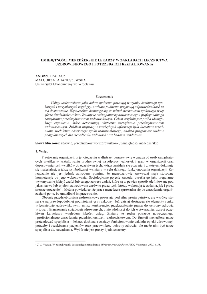 UMIEJTNOCI MENEDERSKIE LEKARZY W ZAKŁADACH LECZNICTWA UZDROWISKOWEGO I POTRZEBA ICH KSZTAŁTOWANIA ANDRZEJ RAPACZ MAŁGORZATA JANUSZEWSKA Uniwersytet Ekonomiczny we Wrocławiu Streszczenie Usługi uzdrowiskowe jako dobra społeczne powstaj w wyniku kombinacji rynkowych i nierynkowych reguł gry, a władze publiczne przyjmuj odpowiedzialno za ich dostarczanie. Współczenie dostrzega si, e udział mechanizmu rynkowego w tej sferze działalnoci ronie. Zmiany te rodz potrzeb nowoczesnego i profesjonalnego zarzdzania przedsibiorstwem uzdrowiskowym. Celem artykułu jest próba identyfikacji czynników, które determinuj skuteczne zarzdzanie przedsibiorstwem uzdrowiskowym. -ródłem inspiracji i niezbdnych informacji była literatura przedmiotu, wieloletnie obserwacje rynku uzdrowiskowego, analiza programów studiów podyplomowych dla menederów uzdrowisk oraz badania sondaowe. Słowa kluczowe: zdrowie, przedsibiorstwo uzdrowiskowe, umiejtnoci menederskie 1. Wstp Przetrwanie organizacji w jej otoczeniu w dłuszej perspektywie wymaga od osób zarzdzajcych wysiłku w kształtowaniu produktywnej współpracy jednostek i grup w organizacji oraz dopasowania tych wysiłków do oczekiwa tych, którzy znajduj si poza ni, i z którymi dokonuje si materialnej, a take symbolicznej wymiany w celu dalszego funkcjonowania organizacji. Zarzdzanie nie jest jednak zawodem, pomimo e menederowie zazwyczaj maj stosowne kompetencje do jego wykonywania. Socjologiczne pojcie zawodu, okrela go jako „regularne wykonywanie jakiej czci lub całego zakresu zada, które s w pewien sposób zdefiniowane pod jak nazw lub tytułem zawodowym zarówno przez tych, którzy wykonuj te zadania, jak i przez szersze otoczenie”1. Mona powiedzie, e praca menedera sprowadza si do zarzdzania organizacjami po to, by umoliwi im przetrwanie. Obecnie przedsibiorstwa uzdrowiskowe pozostaj pod siln presj pastwa, ale wkrótce stan si najprawdopodobniej podmiotami gry rynkowej. Ju dzisiaj dostrzega si elementy rynku w lecznictwie uzdrowiskowym, m.in.: konkurencj, przekształcanie prawa do ochrony zdrowia w towar, finansowanie wiadcze zdrowotnych, a nie zdolnoci do ich wytwarzania, wzrost oczekiwa kuracjuszy wzgldem jakoci usług. Zmiany te rodz potrzeb nowoczesnego i profesjonalnego zarzdzania przedsibiorstwem uzdrowiskowym. Do funkcji menedera moe pretendowa specjalista – lekarz, doskonale znajcy funkcjonowanie zakładu opieki zdrowotnej, potrzeby i oczekiwania pacjentów oraz pracowników ochrony zdrowia, ale moe nim by take specjalista ds. zarzdzania. Wybór nie jest prosty i jednoznaczny. 1 T. J. Watson, W poszukiwaniu doskonałego zarzdzania, Wydawnictwo Naukowe PWN, Warszawa 2001, s. 38. 224 Andrzej Rapacz, Małgorzata Januszewska Umiejtnoci menederskie lekarzy w zakładach lecznictwa uzdrowiskowego i potrzeba ich kształtowania Celem artykułu jest próba identyfikacji czynników, które determinuj skuteczne zarzdzanie przedsibiorstwem uzdrowiskowym. ródłem inspiracji i niezbdnych informacji była literatura przedmiotu, wieloletnie obserwacje rynku uzdrowiskowego, analiza programów studiów podyplomowych dla menederów uzdrowisk oraz badania sondaowe. 2. Funkcjonowanie przedsibiorstw uzdrowiskowych w warunkach rynkowych Przedsibiorstwa uzdrowiskowe rozumiane jako jednostki organizacyjne prowadzce działalno gospodarcz, polegajc na wiadczeniu usług uczestnikom ruchu turystyki uzdrowiskowej, składaj si z wielu jednostek organizacyjnych2. Jedn z nich jest zakład lecznictwa uzdrowiskowego (dalej zwany ZLU). ZLU, to zgodnie z ustaw3, zakład opieki zdrowotnej działajcy na obszarze uzdrowiska, utworzony w celu udzielania wiadcze zdrowotnych z zakresu lecznictwa uzdrowiskowego, w ramach kierunków leczniczych i przeciwwskaza ustalonych dla danego uzdrowiska, w szczególnoci wykorzystujcy warunki naturalne przy udzielaniu wiadcze zdrowotnych. Na proces zarzdzania przedsibiorstwem uzdrowiskowym wpływa specyfika działalnoci uzdrowiskowej. Kady z zaprezentowanych w tabeli 1 atrybutów oddziałuje na metody zarzdzania, strategi rozwoju, oczekiwania wzgldem kompetencji pracowników, sposoby finansowania rozwoju, itp. Tabela 1. Cechy przedsibiorstwa uzdrowiskowego (odróniajce go od przecitnego ZOZ i przedsibiorstwa turystycznego) Cechy połoenie finansowanie usług kadra pozostałe zasoby oczekiwania klientów usługi dystrybucja usług 2 Rónice zawsze w miejscowoci o statusie uzdrowiska łczenie finansowania ze rodków publicznych (głównie za wiadczenia zdrowotne z powszechnego ubezpieczenia zdrowotnego, ubezpieczenia społecznego i systemu podatkowego) z samofinansowaniem kuracjusza (opłaty bytowe, za transport, opłaty lokalne). specyfika produktu wymaga specjalistów o zrónicowanych kwalifikacjach i umiejtnociach – głównie z zakresu medycyny, turystyki, zarzdzania i marketingu; pracowników zorientowanych na systematyczne uczenie si, doskonalcych proces obsługi klienta, otwartych na zmiany, przedsibiorczych. łczenie tradycyjnych zasobów (wody lecznicze, borowiny) z nowoczesnymi technologiami i wiedz. coraz wysze oczekiwania kuracjuszy wzgldem jakoci i zrónicowania produktu; coraz bardziej zrónicowani nabywcy – kuracjusze, turyci, odwiedzajcy. usługi lecznicze, usługi odnowy biologicznej i inne usługi o charakterze turystycznym (noclegowe, ywieniowe, transportowe, organizacji i porednictwa w turystyce). za porednictwem instytucji finansujcych wiadczenia uzdrowiskowe, Wicej na ten temat: A. Rapacz, Przedsibiorstwo turystyczne. Podstawy i zasady działania, PWN, Warszawa 1994. Ustawa o lecznictwie uzdrowiskowym, uzdrowiskach i obszarach ochrony uzdrowiskowej oraz o gminach uzdrowiskowych z dnia 28 lipca 2005 r. (Dz.U.2005 nr 167 poz. 1399). 3 POLSKIE STOWARZYSZENIE ZARZDZANIA WIEDZ Seria: Studia i Materiały, nr 25, 2010 Cechy cel działalnoci 225 Rónice za porednictwem biur podróy, portali internetowych i HRS (Hotels Reservation System), bezporednio. zaspakajanie potrzeb zdrowotnych i wypoczynkowych kuracjuszy or