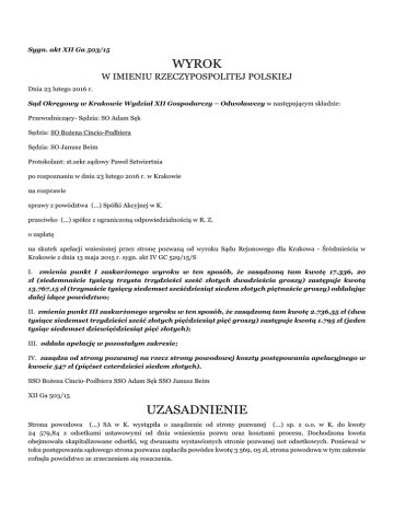 Sygn. akt XII Ga 503/15 WYROK W IMIENIU RZECZYPOSPOLITEJ POLSKIEJ Dnia 23 lutego 2016 r. Sąd Okręgowy w Krakowie Wydział XII Gospodarczy – Odwoławczy w następującym składzie: Przewodniczący- Sędzia: SO Adam Sęk Sędzia: SO Bożena Cincio-Podbiera Sędzia: SO Janusz Beim Protokolant: st.sekr.sądowy Paweł Sztwiertnia po rozpoznaniu w dniu 23 lutego 2016 r. w Krakowie na rozprawie sprawy z powództwa (...) Spółki Akcyjnej w K. przeciwko (...) spółce z ograniczoną odpowiedzialnością w R. Z. o zapłatę na skutek apelacji wniesionej przez stronę pozwaną od wyroku Sądu Rejonowego dla Krakowa - Śródmieścia w Krakowie z dnia 13 maja 2015 r. sygn. akt IV GC 529/15/S I. zmienia punkt I zaskarżonego wyroku w ten sposób, że zasądzoną tam kwotę 17.336, 20 zł (siedemnaście tysięcy trzysta trzydzieści sześć złotych dwadzieścia groszy) zastępuje kwotą 13.767,15 zł (trzynaście tysięcy siedemset sześćdziesiąt siedem złotych piętnaście groszy) oddalając dalej idące powództwo; II. zmienia punkt III zaskarżonego wyroku w ten sposób, że zasądzoną tam kwotę 2.736,55 zł (dwa tysiące siedemset trzydzieści sześć złotych pięćdziesiąt pięć groszy) zastępuje kwotą 1.795 zł (jeden tysiąc siedemset dziewięćdziesiąt pięć złotych); III. oddala apelację w pozostałym zakresie; IV. zasądza od strony pozwanej na rzecz strony powodowej koszty postępowania apelacyjnego w kwocie 547 zł (pięćset czterdzieści siedem złotych). SSO Bożena Cincio-Podbiera SSO Adam Sęk SSO Janusz Beim XII Ga 503/15 UZASADNIENIE Strona powodowa (...) SA w K. wystąpiła o zasądzenie od strony pozwanej (...) sp. z o.o. w K. do kwoty 24 579,84 z odsetkami ustawowymi od dnia wniesienia pozwu oraz kosztami procesu. Dochodzona kwota obejmowała skapitalizowane odsetki, wg dwunastu wystawionych stronie pozwanej not odsetkowych. Ponieważ w toku postępowania sądowego strona pozwana zapłaciła powódce kwotę 3 569, 05 zł, strona powodowa w tym zakresie cofnęła powództwo ze zrzeczeniem się roszczenia. W odpowiedzi na pozew strona pozwana domagała się oddalenia powództwa, poza kwotą 3 569,05 zł, którą uiściła, uzasadniając swoje stanowisko przedawnieniem roszczenia. Sąd Rejonowy ustalił, iż strony prowadziły współpracę gospodarczą co m.in. zaowocowało wystawieniem przez stronę powodową określonych faktur, a następnie, wobec opóźnień w realizowaniu zapłaty, dwunastu not odsetkowych. Wobec charakteru zarzutu podniesionego przez stronę pozwaną Sąd Rejonowy zważył, iż strona pozwana nie negowała swojego zadłużenia względem strony powodowej, ani co do zasady, ani co do wysokości. Wywodziła natomiast, że roszczenia z tytułu sprzedaży, bowiem umowa o tym charakterze łączyła strony, ulega przedawnieniu w okresie dwóch lat, a zatem w tym samym terminie przedawnieniu ulegają roszczenia o zapłatę odsetek za opóźnienia w uiszczeniu ceny sprzedaży. Sąd Rejonowy zważył, iż ustanowiony w art. 118 kc termin przedawnienia roszczeń o świadczenia okresowe stosuje się do roszczeń o odsetki za opóźnienie także wtedy, gdy roszczenie ulega przedawnieniu w terminie określonym w art. 554 kc. Pogląd ten, wyrażony przez Sąd Najwyższy, Sąd Rejonowy akceptował , uznając że termin przedawnienia wynosi trzy lata od dnia wymagalności. Sąd Rejonowy wskazał, że skoro pozew wniesiono w dniu 12 lutego 2015 roku to przedawnieniu nie uległo roszczenie o odsetki, które stały się wymagalne po dniu 12 lutego 2012 roku. Suma tych odsetek zamyka się kwotą 13 167,15 zł., zaś zarzut przedawnienia pozostaje uzasadniony w odniesieniu do kwoty 7 243,74 zł. Tu Sąd Rejonowy wskazał, że nakaz zapłaty z uwagi na zakres zaskarżenia uprawomocnił się co do kwoty 3 569,05 zł, zapłaconej przez stronę pozwaną w toku procesu. Łącznie zatem na rzecz strony powodowej przypada kwota 17 336,20 zł. , nie zaś kwota 20 905,25 zł. Sąd Rejonowy wskazał, iż skutek własnej omyłki rachunkowej właściwej kwoty w wyroku z dnia 13 maja 2015 roku zasądził kwotę 17 336,20 zł , co wraz z kwotą wynikającą z prawomocnego nakazu zapłaty, daje kwotę 20 905,25 zł. O kosztach procesu Sąd Rejonowy orzekł w oparciu o art. 100 kpc, mając na uwadze to, iż strona powodowa wygrała proces w osiemdziesięciu pięciu procentach. W apelacji od tego wyroku strona pozwana zarzuciła Sądowi Rejonowemu naruszenie art. 118 kc oraz art. 554 kc przez uznanie, iż ustanowiony w art. 118 kc termin przedawnienia roszczenia o świadczenia okresowe stosuje się do roszczeń o odsetki za opóźnienie także wtedy, gdy roszczenie główne ulega przedawnieniu w terminie określonym w art. 554 kc. Ewentualnie, strona pozwana wskazała na niewłaściwe zastosowanie art. 118 kc przez zasądzenie kwoty 17 336,20 zł podczas gdy przy przyjęciu trzyletniego terminu przedawnienia, przedawnieniu nie uległy roszczenia wynikające z not odsetkowych na łączną kwotę 13 767,15 zł. Wnosząc o zmianę zaskarżonego wyroku poprzez oddalenie powództwa w całości i zasądzenie kosztów postępowania za obie instancje strona pozwana podnosiła, iż stanowisko Sądu prowadzi do sytuacji, gdzie podmiot nie spłacając roszczenia głównego w nadziei na jego przedawnienie jest nagradzany przedawnieniem się odsetek za zwłokę w spełnieniu roszczenia głównego w terminie przedawnienia tego roszczenia, podczas gdy podmiot spełniający roszczenie główne w efekcie wydłuża okres przedawnienia odsetek, które rzekomo oderwane od roszczenia głównego przedawniają się wtedy w terminie trzech lat. Zdaniem strony skarżącej, przedmiotowe odsetki przedawniają się w dwuletnim terminie określonym w art. 554 kc jako roszczenia o odsetki za opóźnienie zapłaty w zapłacie ceny wynikającej z umowy sprzedaży. Skarżąca odwołała się też do treści art. 56 kc, wskazując, iż treść stosunku obligacyjnego wykreowanego zawarciem umowy sprzedaży może 