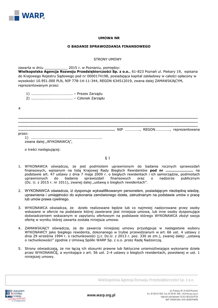 UMOWA NR O BADANIE SPRAWOZDANIA FINANSOWEGO STRONY UMOWY zawarta w dniu ___________ 2015 r. w Poznaniu, pomiędzy: Wielkopolska Agencja Rozwoju Przedsiębiorczości Sp. z o.o., 61-823 Poznań ul. Piekary 19, wpisana do Krajowego Rejestru Sądowego pod nr 0000174198, posiadająca kapitał zakładowy w całości opłacony w wysokości 10.951.000 PLN, NIP 778-14-11-344, REGON 634512019, zwana dalej ZAMAWIAJĄCYM, reprezentowanym przez: 1) ………………………………………. – Prezes Zarządu 2) ………………………………………. – Członek Zarządu a ………………………………………………………………………………………………………………………………………… ………………………………………………………………………………………………………………………………………… ………………………………………………………………………………………………………………………………………… ………………………………………………………………………… NIP ……………., REGON……………., reprezentowana przez: 1) ……………………………………………………………………. zwana dalej „WYKONAWCĄ”, o treści następującej: §1 1. WYKONAWCA oświadcza, że jest podmiotem uprawnionym do badania rocznych sprawozdań finansowych, wpisanym na listę Krajowej Rady Biegłych Rewidentów pod nr …………………… na podstawie art. 47 ustawy z dnia 7 maja 2009 r. o biegłych rewidentach i ich samorządzie, podmiotach uprawnionych do badania sprawozdań finansowych oraz o nadzorze publicznym (Dz. U. z 2015 r. nr 1011), zwanej dalej „ustawą o biegłych rewidentach”. 2. WYKONAWCA oświadcza, iż dysponuje wykwalifikowanym personelem, posiadającym niezbędną wiedzę, uprawnienia i umiejętności do wykonania zamówionego dzieła, zatrudnianym na podstawie umów o pracę lub umów prawa cywilnego. 3. WYKONAWCA oświadcza, że dzieło realizowane będzie lub co najmniej nadzorowane przez osoby wskazane w ofercie na podstawie której zawierane jest niniejsza umowa, lub inne osoby dysponujące doświadczeniem wskazanym w zapytaniu ofertowym na podstawie którego WYKONAWCA złożył swoja ofertę w wyniku której zawarta została niniejsza umowa. 4. ZAMAWIAJĄCY oświadcza, że do zawarcia niniejszej umowy przystępuje w następstwie wyboru WYKONAWCY jako biegłego rewidenta, dokonanego w trybie przewidzianym w art. 66 ust. 4 ustawy z dnia 29 września 1994 r. o rachunkowości (j.t. Dz.U. z 2013 r. poz. 330 ze zm.), zwanej dalej: „ustawą o rachunkowości” zgodnie z Umową Spółki WARP Sp. z o.o. przez Radę Nadzorczą. 5. Strony oświadczają, że nie łączą ich stosunki prawne lub faktyczne uniemożliwiające wykonanie dzieła przez WYKONAWCĘ, a wynikające z art. 56 ust. 2-4 ustawy o biegłych rewidentach, powołanej w ust. 1 niniejszej umowy. PRZEDMIOT UMOWY §2 1. WYKONAWCA zobowiązuje się do przeprowadzenia badania sprawozdania finansowego ZAMAWIAJĄCEGO za rok obrotowy obejmujący okres od 01.01.2015 do 31.12.2015 r. 2. Przeprowadzając badanie sprawozdania finansowego, o którym mowa w ust. 1, za kryterium oceny przyjęte zostaną postanowienia ustawy o rachunkowości, umowy lub statutu Spółki, obowiązujące standardy rachunkowości. 3. Badanie, o którym mowa w ust.1 zostanie przeprowadzone w trybie i na zasadach określonych ustawą o biegłych rewidentach, ustawą o rachunkowości, zgodnie z obowiązującymi standardami rewizji finansowej. ZAKRES BADANIA SPRAWOZDANIA FINANSOWEGO §3 1. Badanie sprawozdania finansowego zostanie przez WYKONAWCĘ przeprowadzone w siedzibie Zamawiającego i na tak dobranych próbach operacji gospodarczych, wynikających z ksiąg rachunkowych i dowodów księgowych, aby dokumentacja rewizyjna stanowiła wystarczającą podstawę do sformułowania opinii o badanym sprawozdaniu finansowym. 2. Dobór prób operacji gospodarczych, o których mowa w ust. 1 zostanie poprzedzony wszechstronnym przeglądem funkcjonowania u ZAMAWIAJĄCEGO systemów: organizacyjnego, rachunkowości i kontroli wewnętrznej, w zakresie, jaki WYKONAWCA uzna za konieczny do należytego wykonania umowy. WYNIKI PRAC §4 W wyniku prac określonych w § 2, WYKONAWCA przekaże ZAMAWIAJĄCEMU po cztery egzemplarze: a. opinii o prawidłowości i rzetelności sprawozdania finansowego ZAMAWIAJĄCEGO za rok badany, o którym mowa w § 2 ust. 1, zwanej dalej „opinią”, b. raportu biegłego rewidenta z badania sprawozdania finansowego, zwanego dalej „raportem”. §5 1. Opinia i raport biegłego rewidenta, o którym mowa w § 4, będzie w szczególności zawierać stwierdzenia wymagane przepisami ustawy o rachunkowości, zgodnie z obowiązującymi standardami rewizji finansowej także inne niezbędne ustalenia WYKONAWCY dla prawidłowej oceny działalności finansowej ZAMAWIAJĄCEGO. Raport biegłego rewidenta zawierać będzie co najmniej ocenę stosowanych przez spółkę zasad i polityki tworzenia odpisów aktualizacyjnych na należności z tytułu udzielonych pożyczek oraz tworzenie rezerw. 2. Zgodnie z art. 65 ust. 4 ustawy o rachunkowości, opinia powinna w sposób jednoznaczny wskazywać powody wyrażenia zastrzeżeń do sprawozdania finansowego lub wyrażenia opinii negatywnej. Zastrzeżenia należy wyrazić w sposób wskazujący na ich zasięg. W przypadku odmowy wyrażenia opinii wydane stanowisko w sposób jednoznaczny powinno wskazywać okoliczności uniemożliwiające jej sformułowanie. OBOWIĄZUJĄCE TERMINY §6 1. Przekazanie ZAMAWIAJĄCEMU ostatecznej wersji opinii i raportu nastąpi do dnia 30 maja 2016 r., pod warunkiem udostępnienia Wykonawcy niezbędnych do badania dokumentów, danych i informacji, a w szczególności sprawozdania finansowego, o którym mowa w § 7 ust. 1, ksiąg rachunkowych i dowodów księgowych nie później niż na trzy tygodnie przed