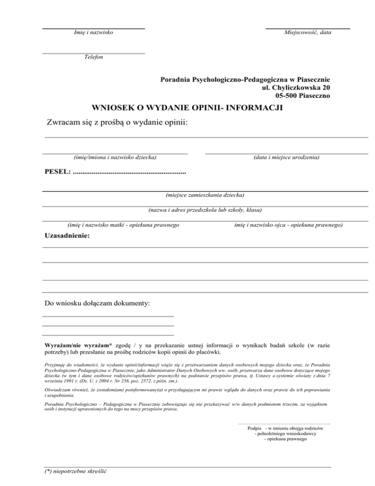 Imię i nazwisko Miejscowość, data Telefon Poradnia Psychologiczno-Pedagogiczna w Piasecznie ul. Chyliczkowska 20 05-500 Piaseczno WNIOSEK O WYDANIE OPINII- INFORMACJI Zwracam się z prośbą o wydanie opinii: (imię/imiona i nazwisko dziecka) (data i miejsce urodzenia) PESEL: ............................................................ (miejsce zamieszkania dziecka) (nazwa i adres przedszkola lub szkoły, klasa) (imię i nazwisko matki - opiekuna prawnego imię i nazwisko ojca - opiekuna prawnego) Uzasadnienie: Do wniosku dołączam dokumenty: Wyrażam/nie wyrażam* zgodę / y na przekazanie ustnej informacji o wynikach badań szkole (w razie potrzeby) lub przesłanie na prośbę rodziców kopii opinii do placówki. Przyjmuję do wiadomości, że wydanie opinii/informacji wiąże się z przetwarzaniem danych osobowych mojego dziecka oraz, że Poradnia Psychologiczno-Pedagogiczna w Piasecznie, jako Administrator Danych Osobowych ww. osób, przetwarza dane osobowe dotyczące mojego dziecka (w tym i dane osobowe rodziców/opiekunów prawnych) na podstawie przepisów prawa, tj. Ustawy o systemie oświaty z dnia 7 września 1991 r. (Dz. U. z 2004 r. Nr 256, poz. 2572, z późn. zm.). Oświadczam również, że zostałem(am) poinformowany(a) o przysługującym mi prawie wglądu do danych oraz prawie do ich poprawiania i uzupełniania. Poradnia Psychologiczno – Pedagogiczna w Piasecznie zobowiązuje się nie przekazywać w/w danych podmiotom trzecim, za wyjątkiem osób i instytucji uprawnionych do tego na mocy przepisów prawa. ………………………………………………. Podpis - w imieniu obojga rodziców - pełnoletniego wnioskodawcy - opiekuna prawnego (*) niepotrzebne skreślić