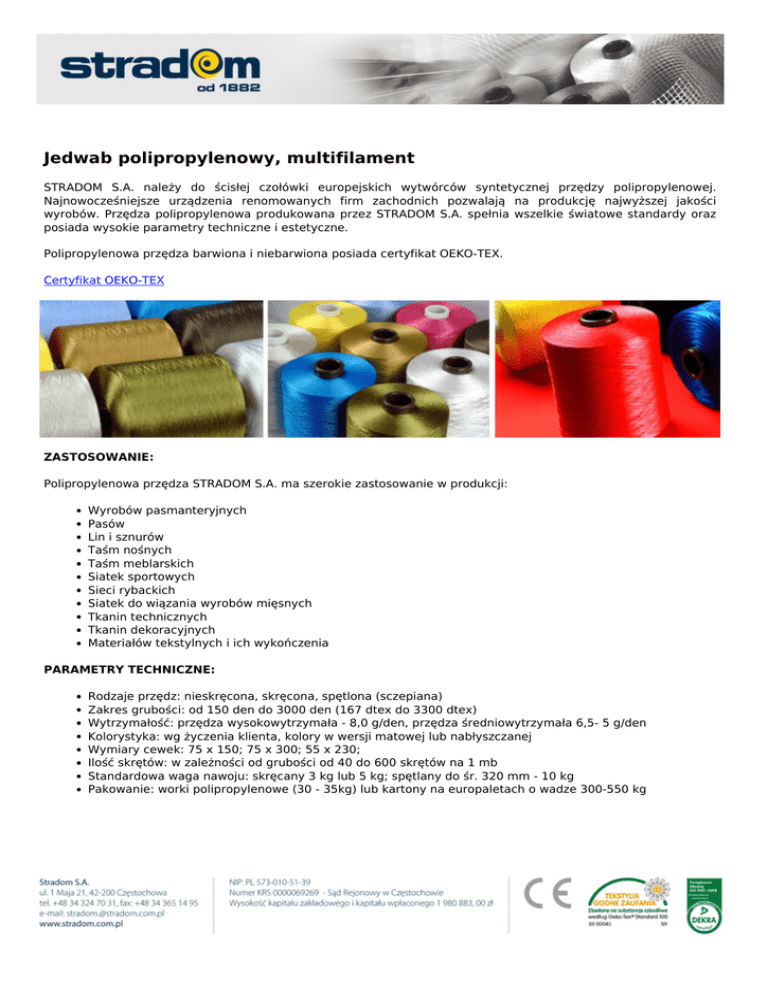 Jedwab polipropylenowy, multifilament STRADOM S.A. należy do ścisłej czołówki europejskich wytwórców syntetycznej przędzy polipropylenowej. Najnowocześniejsze urządzenia renomowanych firm zachodnich pozwalają na produkcję najwyższej jakości wyrobów. Przędza polipropylenowa produkowana przez STRADOM S.A. spełnia wszelkie światowe standardy oraz posiada wysokie parametry techniczne i estetyczne. Polipropylenowa przędza barwiona i niebarwiona posiada certyfikat OEKO-TEX. Certyfikat OEKO-TEX ZASTOSOWANIE: Polipropylenowa przędza STRADOM S.A. ma szerokie zastosowanie w produkcji: Wyrobów pasmanteryjnych Pasów Lin i sznurów Taśm nośnych Taśm meblarskich Siatek sportowych Sieci rybackich Siatek do wiązania wyrobów mięsnych Tkanin technicznych Tkanin dekoracyjnych Materiałów tekstylnych i ich wykończenia PARAMETRY TECHNICZNE: Rodzaje przędz: nieskręcona, skręcona, spętlona (sczepiana) Zakres grubości: od 150 den do 3000 den (167 dtex do 3300 dtex) Wytrzymałość: przędza wysokowytrzymała - 8,0 g/den, przędza średniowytrzymała 6,5- 5 g/den Kolorystyka: wg życzenia klienta, kolory w wersji matowej lub nabłyszczanej Wymiary cewek: 75 x 150; 75 x 300; 55 x 230; Ilość skrętów: w zależności od grubości od 40 do 600 skrętów na 1 mb Standardowa waga nawoju: skręcany 3 kg lub 5 kg; spętlany do śr. 320 mm - 10 kg Pakowanie: worki polipropylenowe (30 - 35kg) lub kartony na europaletach o wadze 300-550 kg Powered by TCPDF (www.tcpdf.org)