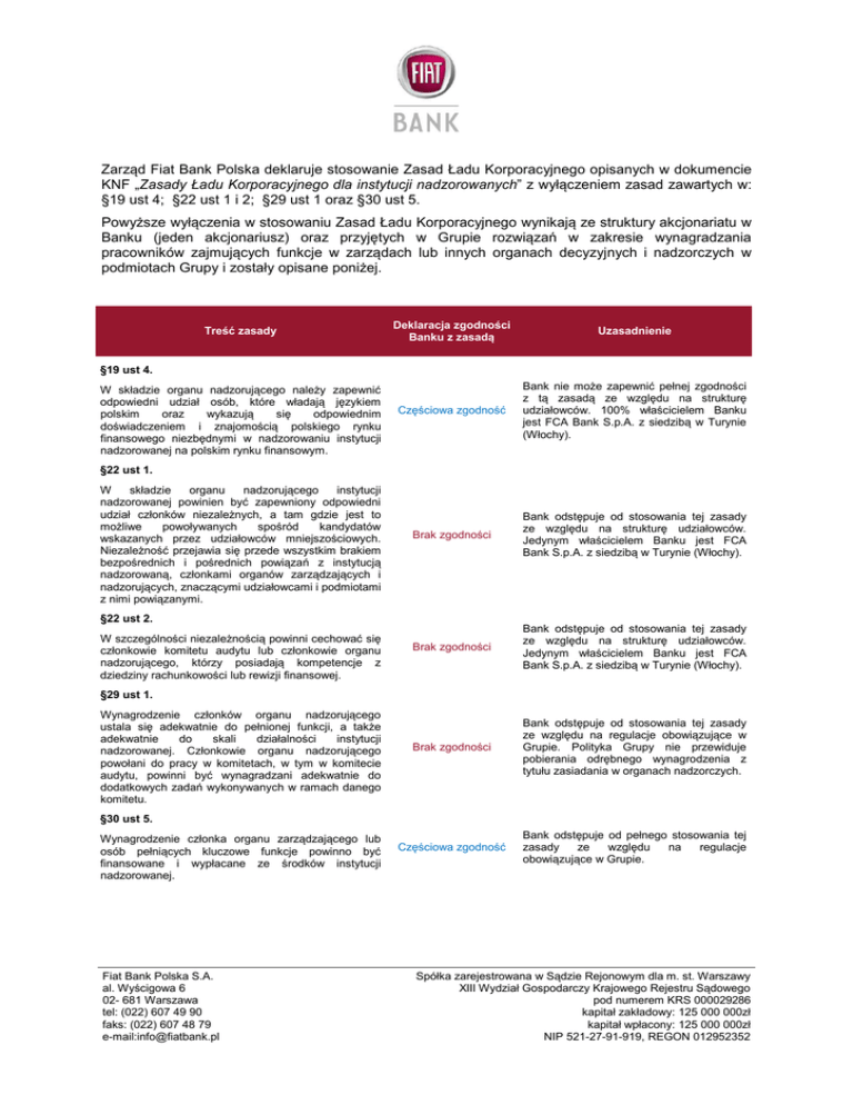 Zarząd Fiat Bank Polska deklaruje stosowanie Zasad Ładu Korporacyjnego opisanych w dokumencie KNF „Zasady Ładu Korporacyjnego dla instytucji nadzorowanych” z wyłączeniem zasad zawartych w: §19 ust 4; §22 ust 1 i 2; §29 ust 1 oraz §30 ust 5. Powyższe wyłączenia w stosowaniu Zasad Ładu Korporacyjnego wynikają ze struktury akcjonariatu w Banku (jeden akcjonariusz) oraz przyjętych w Grupie rozwiązań w zakresie wynagradzania pracowników zajmujących funkcje w zarządach lub innych organach decyzyjnych i nadzorczych w podmiotach Grupy i zostały opisane poniżej. Treść zasady Deklaracja zgodności Banku z zasadą Uzasadnienie Częściowa zgodność Bank nie może zapewnić pełnej zgodności z tą zasadą ze względu na strukturę udziałowców. 100% właścicielem Banku jest FCA Bank S.p.A. z siedzibą w Turynie (Włochy). Brak zgodności Bank odstępuje od stosowania tej zasady ze względu na strukturę udziałowców. Jedynym właścicielem Banku jest FCA Bank S.p.A. z siedzibą w Turynie (Włochy). Brak zgodności Bank odstępuje od stosowania tej zasady ze względu na strukturę udziałowców. Jedynym właścicielem Banku jest FCA Bank S.p.A. z siedzibą w Turynie (Włochy). Brak zgodności Bank odstępuje od stosowania tej zasady ze względu na regulacje obowiązujące w Grupie. Polityka Grupy nie przewiduje pobierania odrębnego wynagrodzenia z tytułu zasiadania w organach nadzorczych. Częściowa zgodność Bank odstępuje od pełnego stosowania tej zasady ze względu na regulacje obowiązujące w Grupie. §19 ust 4. W składzie organu nadzorującego należy zapewnić odpowiedni udział osób, które władają językiem polskim oraz wykazują się odpowiednim doświadczeniem i znajomością polskiego rynku finansowego niezbędnymi w nadzorowaniu instytucji nadzorowanej na polskim rynku finansowym. §22 ust 1. W składzie organu nadzorującego instytucji nadzorowanej powinien być zapewniony odpowiedni udział członków niezależnych, a tam gdzie jest to możliwe powoływanych spośród kandydatów wskazanych przez udziałowców mniejszościowych. Niezależność przejawia się przede wszystkim brakiem bezpośrednich i pośrednich powiązań z instytucją nadzorowaną, członkami organów zarządzających i nadzorujących, znaczącymi udziałowcami i podmiotami z nimi powiązanymi. §22 ust 2. W szczególności niezależnością powinni cechować się członkowie komitetu audytu lub członkowie organu nadzorującego, którzy posiadają kompetencje z dziedziny rachunkowości lub rewizji finansowej. §29 ust 1. Wynagrodzenie członków organu nadzorującego ustala się adekwatnie do pełnionej funkcji, a także adekwatnie do skali działalności instytucji nadzorowanej. Członkowie organu nadzorującego powołani do pracy w komitetach, w tym w komitecie audytu, powinni być wynagradzani adekwatnie do dodatkowych zadań wykonywanych w ramach danego komitetu. §30 ust 5. Wynagrodzenie członka organu zarządzającego lub osób pełniących kluczowe funkcje powinno być finansowane i wypłacane ze środków instytucji nadzorowanej. Fiat Bank Polska S.A. al. Wyścigowa 6 02- 681 Warszawa tel: (022) 607 49 90 faks: (022) 607 48 79 e-mail:[email protected] Spółka zarejestrowana w Sądzie Rejonowym dla m. st. Warszawy XIII Wydział Gospodarczy Krajowego Rejestru Sądowego pod numerem KRS 000029286 kapitał zakładowy: 125 000 000zł kapitał wpłacony: 125 000 000zł NIP 521-27-91-919, REGON 012952352
