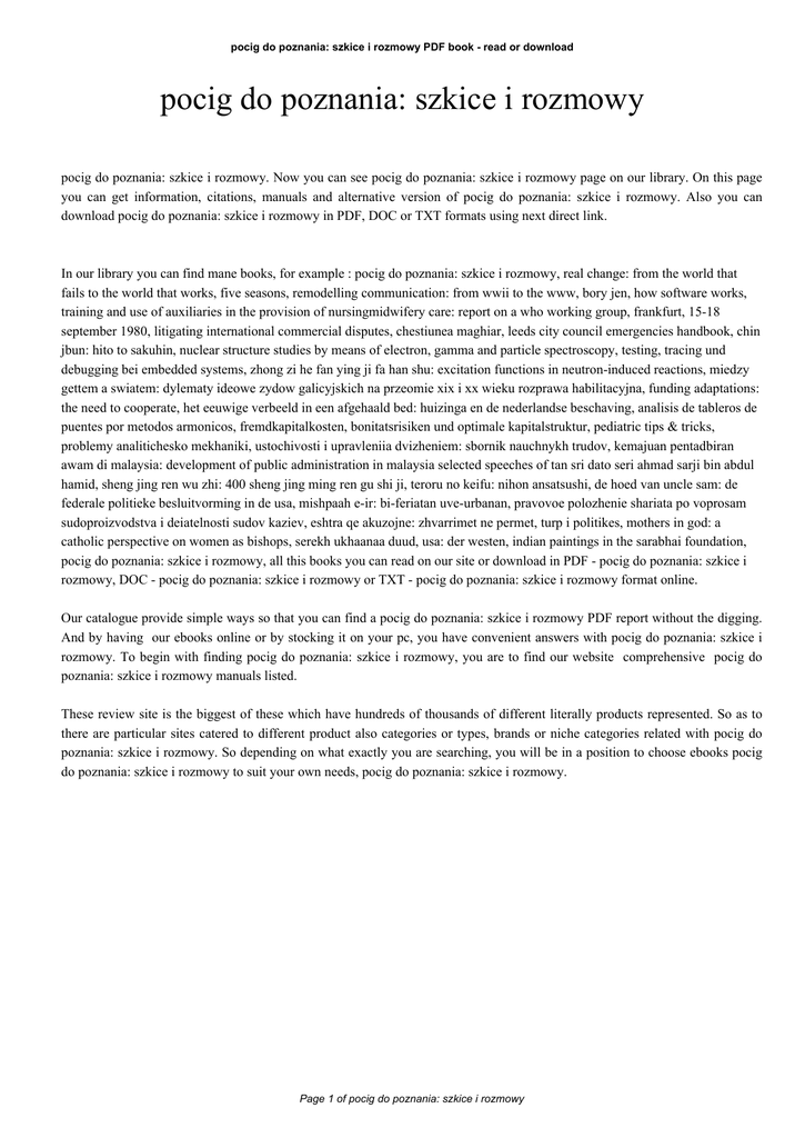 pocig do poznania: szkice i rozmowy PDF book - read or download pocig do poznania: szkice i rozmowy pocig do poznania: szkice i rozmowy. Now you can see pocig do poznania: szkice i rozmowy page on our library. On this page you can get information, citations, manuals and alternative version of pocig do poznania: szkice i rozmowy. Also you can download pocig do poznania: szkice i rozmowy in PDF, DOC or TXT formats using next direct link. In our library you can find mane books, for example : pocig do poznania: szkice i rozmowy, real change: from the world that fails to the world that works, five seasons, remodelling communication: from wwii to the www, bory jen, how software works, training and use of auxiliaries in the provision of nursingmidwifery care: report on a who working group, frankfurt, 15-18 september 1980, litigating international commercial disputes, chestiunea maghiar, leeds city council emergencies handbook, chin jbun: hito to sakuhin, nuclear structure studies by means of electron, gamma and particle spectroscopy, testing, tracing und debugging bei embedded systems, zhong zi he fan ying ji fa han shu: excitation functions in neutron-induced reactions, miedzy gettem a swiatem: dylematy ideowe zydow galicyjskich na przeomie xix i xx wieku rozprawa habilitacyjna, funding adaptations: the need to cooperate, het eeuwige verbeeld in een afgehaald bed: huizinga en de nederlandse beschaving, analisis de tableros de puentes por metodos armonicos, fremdkapitalkosten, bonitatsrisiken und optimale kapitalstruktur, pediatric tips & tricks, problemy analitichesko mekhaniki, ustochivosti i upravleniia dvizheniem: sbornik nauchnykh trudov, kemajuan pentadbiran awam di malaysia: development of public administration in malaysia selected speeches of tan sri dato seri ahmad sarji bin abdul hamid, sheng jing ren wu zhi: 400 sheng jing ming ren gu shi ji, teroru no keifu: nihon ansatsushi, de hoed van uncle sam: de federale politieke besluitvorming in de usa, mishpaah e-ir: bi-feriatan uve-urbanan, pravovoe polozhenie shariata po voprosam sudoproizvodstva i deiatelnosti sudov kaziev, eshtra qe akuzojne: zhvarrimet ne permet, turp i politikes, mothers in god: a catholic perspective on women as bishops, serekh ukhaanaa duud, usa: der westen, indian paintings in the sarabhai foundation, pocig do poznania: szkice i rozmowy, all this books you can read on our site or download in PDF - pocig do poznania: szkice i rozmowy, DOC - pocig do poznania: szkice i rozmowy or TXT - pocig do poznania: szkice i rozmowy format online. Our catalogue provide simple ways so that you can find a pocig do poznania: szkice i rozmowy PDF report without the digging. And by having our ebooks online or by stocking it on your pc, you have convenient answers with pocig do poznania: szkice i rozmowy. To begin with finding pocig do poznania: szkice i rozmowy, you are to find our website comprehensive pocig do poznania: szkice i rozmowy manuals listed. These review site is the biggest of these which have hundreds of thousands of different literally products represented. So as to there are particular sites catered to different product also categories or types, brands or niche categories related with pocig do poznania: szkice i rozmowy. So depending on what exactly you are searching, you will be in a position to choose ebooks pocig do poznania: szkice i rozmowy to suit your own needs, pocig do poznania: szkice i rozmowy. Page 1 of pocig do poznania: szkice i rozmowy
