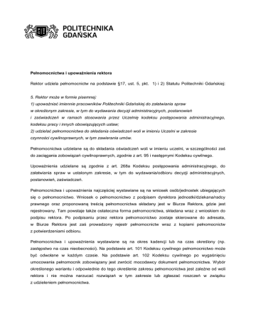 Pełnomocnictwa i upoważnienia rektora Rektor udziela pełnomocnictw na podstawie §17, ust. 5, pkt. 1) i 2) Statutu Politechniki Gdańskiej: 5. Rektor może w formie pisemnej: 1) upoważniać imiennie pracowników Politechniki Gdańskiej do załatwiania spraw w określonym zakresie, w tym do wydawania decyzji administracyjnych, postanowień i zaświadczeń w ramach stosowania przez Uczelnię kodeksu postępowania administracyjnego, kodeksu pracy i innych obowiązujących ustaw; 2) udzielać pełnomocnictwa do składania oświadczeń woli w imieniu Uczelni w zakresie czynności cywilnoprawnych, w tym zawierania umów. Pełnomocnictwa udzielane są do składania oświadczeń woli w imieniu uczelni, w szczególności zaś do zaciągania zobowiązań cywilnoprawnych, zgodnie z art. 95 i następnymi Kodeksu cywilnego. Upoważnienia udzielane są zgodnie z art. 268a Kodeksu postępowania administracyjnego, do załatwiania spraw w ustalonym zakresie, w tym do wydawania/odbioru decyzji administracyjnych, postanowień, zaświadczeń. Pełnomocnictwa i upoważnienia najczęściej wystawiane są na wniosek osób/jednostek ubiegających się o pełnomocnictwo. Wniosek o pełnomocnictwo z podpisem dyrektora jednostki/dziekana/radcy prawnego oraz proponowaną treścią pełnomocnictwa składany jest w Biurze Rektora, gdzie jest rejestrowany. Tam powstaje także ostateczna forma pełnomocnictwa, składana wraz z wnioskiem do podpisu rektora. Po podpisaniu przez rektora pełnomocnictwo zostaje skierowane do adresata, w Biurze Rektora jest zaś prowadzony rejestr pełnomocnictw wraz z kopiami pełnomocnictw z potwierdzeniami odbioru. Pełnomocnictwa i upoważnienia wystawiane są na okres kadencji lub na czas określony (np. zastępstwo na czas nieobecności). Na podstawie art. 101 Kodeksu cywilnego pełnomocnictwo może być odwołane w każdym czasie. Na podstawie art. 102 Kodeksu cywilnego po wygaśnięciu umocowania pełnomocnik zobowiązany jest zwrócić mocodawcy dokument pełnomocnictwa. Wybór określonego wariantu i odpowiednie do tego określenie zakresu pełnomocnictwa jest zależne od woli rektora i nie można narzucać rozwiązań w tym zakresie lub zgłaszać roszczeń w związku z udzieleniem pełnomocnictwa.