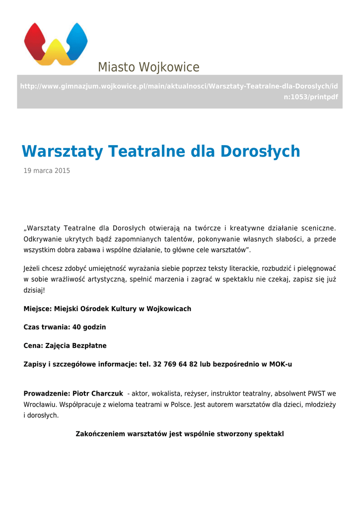 Miasto Wojkowice http://www.gimnazjum.wojkowice.pl/main/aktualnosci/Warsztaty-Teatralne-dla-Doroslych/id n:1053/printpdf Warsztaty Teatralne dla Dorosłych 19 marca 2015 kategoria: Wojkowice „Warsztaty Teatralne dla Dorosłych otwierają na twórcze i kreatywne działanie sceniczne. Odkrywanie ukrytych bądź zapomnianych talentów, pokonywanie własnych słabości, a przede wszystkim dobra zabawa i wspólne działanie, to główne cele warsztatów”. Jeżeli chcesz zdobyć umiejętność wyrażania siebie poprzez teksty literackie, rozbudzić i pielęgnować w sobie wrażliwość artystyczną, spełnić marzenia i zagrać w spektaklu nie czekaj, zapisz się już dzisiaj! Miejsce: Miejski Ośrodek Kultury w Wojkowicach Czas trwania: 40 godzin Cena: Zajęcia Bezpłatne Zapisy i szczegółowe informacje: tel. 32 769 64 82 lub bezpośrednio w MOK-u Prowadzenie: Piotr Charczuk - aktor, wokalista, reżyser, instruktor teatralny, absolwent PWST we Wrocławiu. Współpracuje z wieloma teatrami w Polsce. Jest autorem warsztatów dla dzieci, młodzieży i dorosłych. Zakończeniem warsztatów jest wspólnie stworzony spektakl
