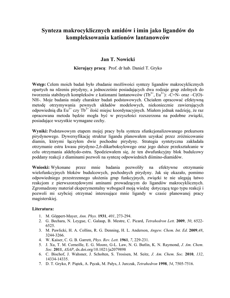 Synteza makrocyklicznych amidów i imin jako ligandów do kompleksowania kationów lantanowców Jan T. Nowicki Kierujący pracą: Prof. dr hab. Daniel T. Gryko Wstęp: Celem moich badań było zbadanie możliwości syntezy ligandów makrocyklicznych opartych na rdzeniu pirydyny, a jednocześnie posiadających dwa rodzaje grup zdolnych do tworzenia stabilnych kompleksów z kationami lantanowców (Tb3+, Eu3+): -C=N- oraz –C(O)NH-. Moje badania miały charakter badań podstawowych. Chciałem opracować efektywną metodę otrzymywania pewnych układów modelowych, niekoniecznie zawierających odpowiednią dla Eu3+ czy Tb3+ ilość miejsc koordynacyjnych. Miałem jednak nadzieję, że raz opracowana metoda będzie mogła być w przyszłości rozszerzona na podobne związki, posiadające wszystkie wymagane cechy. Wyniki: Podstawowym etapem mojej pracy była synteza sfunkcjonalizowanego prekursora pirydynowego. Dywersyfikację struktur ligandu planowałem uzyskać przez zróżnicowanie diamin, którymi łączyłem dwie pochodne pirydyny. Strategia syntetyczna zakładała otrzymanie estru kwasu pirydyno-2,6-dikarboksylowego oraz jego dalsze przekształcanie w celu otrzymania aldehydo-estru. Spodziewałem się, że ten dwufunkcyjny blok budulcowy poddany reakcji z diaminami pozwoli na syntezę odpowiednich diimino-diamidów. Wnioski: Wykonane przez mnie badania pozwoliły na efektywne otrzymanie wielofunkcyjnych bloków budulcowych, pochodnych pirydyny. Jak się okazało, pomimo odpowiedniego przestrzennego ułożenia grup funkcyjnych, związki te nie ulegają łatwo reakcjom z pierwszorzędowymi aminami prowadzącym do ligandów makrocyklicznych. Zgromadzony materiał eksperymentalny wzbogacił moją wiedzę dotyczącą tego typu reakcji i pozwoli mi szybciej otrzymać interesujące mnie ligandy w czasie planowanej pracy magisterskiej. Literatura: 1. M. Göppert-Mayer, Ann. Phys. 1931, 401, 273-294. 2. G. Bechara, N. Leygue, C. Galaup, B. Mestre, C. Picard, Tetrahedron Lett. 2009, 50, 65226525. 3. M. Pawlicki, H. A. Collins, R. G. Denning, H. L. Anderson, Angew. Chem. Int. Ed. 2009,48, 3244-3266. 4. W. Kaiser, C. G. B. Garrett, Phys. Rev. Lett. 1961, 7, 229-231. 5. J. Xu, T. M. Corneille, E. G. Moore, G-L. Law, N. G. Butlin, K. N. Raymond, J. Am. Chem. Soc. 2011, ASAP, dx.doi.org/10.1021/ja2079898 6. C. Bischof, J. Wahsner, J. Scholten, S. Trosisen, M. Seitz, J. Am. Chem. Soc. 2010, 132, 14334-14335. 7. D. T. Gryko, P. Piątek, A. Pęcak, M. Pałys, J. Jurczak, Tetrahedron 1998, 54, 7505-7516.