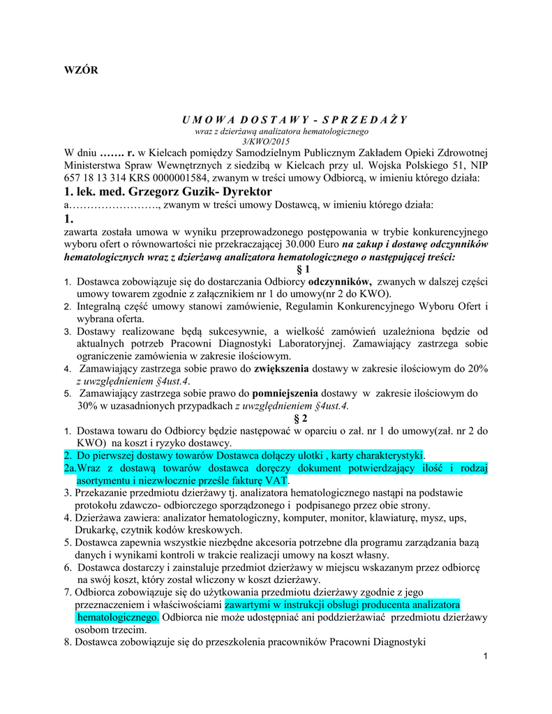 WZÓR UMOWA DOSTAWY - SPRZEDAŻY wraz z dzierżawą analizatora hematologicznego 3/KWO/2015 W dniu ……. r. w Kielcach pomiędzy Samodzielnym Publicznym Zakładem Opieki Zdrowotnej Ministerstwa Spraw Wewnętrznych z siedzibą w Kielcach przy ul. Wojska Polskiego 51, NIP 657 18 13 314 KRS 0000001584, zwanym w treści umowy Odbiorcą, w imieniu którego działa: 1. lek. med. Grzegorz Guzik- Dyrektor a……………………., zwanym w treści umowy Dostawcą, w imieniu którego działa: 1. zawarta została umowa w wyniku przeprowadzonego postępowania w trybie konkurencyjnego wyboru ofert o równowartości nie przekraczającej 30.000 Euro na zakup i dostawę odczynników hematologicznych wraz z dzierżawą analizatora hematologicznego o następującej treści: §1 1. Dostawca zobowiązuje się do dostarczania Odbiorcy odczynników, zwanych w dalszej części umowy towarem zgodnie z załącznikiem nr 1 do umowy(nr 2 do KWO). 2. Integralną część umowy stanowi zamówienie, Regulamin Konkurencyjnego Wyboru Ofert i wybrana oferta. 3. Dostawy realizowane będą sukcesywnie, a wielkość zamówień uzależniona będzie od aktualnych potrzeb Pracowni Diagnostyki Laboratoryjnej. Zamawiający zastrzega sobie ograniczenie zamówienia w zakresie ilościowym. 4. Zamawiający zastrzega sobie prawo do zwiększenia dostawy w zakresie ilościowym do 20% z uwzględnieniem §4ust.4. 5. Zamawiający zastrzega sobie prawo do pomniejszenia dostawy w zakresie ilościowym do 30% w uzasadnionych przypadkach z uwzględnieniem §4ust.4. §2 1. Dostawa towaru do Odbiorcy będzie następować w oparciu o zał. nr 1 do umowy(zał. nr 2 do KWO) na koszt i ryzyko dostawcy. 2. Do pierwszej dostawy towarów Dostawca dołączy ulotki , karty charakterystyki. 2a.Wraz z dostawą towarów dostawca doręczy dokument potwierdzający ilość i rodzaj asortymentu i niezwłocznie prześle fakturę VAT. 3. Przekazanie przedmiotu dzierżawy tj. analizatora hematologicznego nastąpi na podstawie protokołu zdawczo- odbiorczego sporządzonego i podpisanego przez obie strony. 4. Dzierżawa zawiera: analizator hematologiczny, komputer, monitor, klawiaturę, mysz, ups, Drukarkę, czytnik kodów kreskowych. 5. Dostawca zapewnia wszystkie niezbędne akcesoria potrzebne dla programu zarządzania bazą danych i wynikami kontroli w trakcie realizacji umowy na koszt własny. 6. Dostawca dostarczy i zainstaluje przedmiot dzierżawy w miejscu wskazanym przez odbiorcę na swój koszt, który został wliczony w koszt dzierżawy. 7. Odbiorca zobowiązuje się do użytkowania przedmiotu dzierżawy zgodnie z jego przeznaczeniem i właściwościami zawartymi w instrukcji obsługi producenta analizatora hematologicznego. Odbiorca nie może udostępniać ani poddzierżawiać przedmiotu dzierżawy osobom trzecim. 8. Dostawca zobowiązuje się do przeszkolenia pracowników Pracowni Diagnostyki 1 Laboratoryjnej na przedmiocie dzierżawy w ramach kosztów dzierżawy. 9. W czasie trwania umowy dostawca zobowiązany jest do usuwania wszelkich usterek w ciągu …. godzin od poinformowania przez odbiorcę telefonicznie, faksem, drogą elektroniczną. Koszty serwisowania, wymiana części, robocizna, dojazdy związane z naprawą analizatora oraz okresową konserwację wliczone są w koszt dzierżawy i ponosi je Dostawca, za wyjątkiem okoliczności, gdy konieczność napraw powstała z winy Odbiorcy na skutek nieprawidłowej eksploatacji przedmiotu dzierżawy. Wówczas koszty napraw i części zamiennych pokrywa Odbiorca. 10. W przypadku awarii przedmiotu dzierżawy wymagającej konieczności skierowania go do warsztatu serwisowego, Dostawca zobowiązany jest do wstawienia aparatu zastępczego. 11. Po zakończeniu okresu dzierżawy odbiorca zobowiązany jest do zwrotu przedmiotu dzierżawy w stanie nie pogorszonym ponad zużycie wynikającej z normalnej pracy. §3 Termin realizacji umowy –36 miesięcy od daty podpisania umowy. §4 1. Wartość umowy w tym należność za dostarczony towar(odczynniki) …. zł brutto + należność za dzierżawę ….. zł brutto= razem …. zł. brutto (słownie: …… 00/100). 2. Należność za dostarczony towar wyliczana będzie według cen jednostkowych netto określonych w formularzu cenowym stanowiącym załącznik nr 1 do umowy(zał. nr 2 do KWO) + należny podatek VAT. 3. Ceny wymienione w formularzu cenowym stanowiącym załącznik nr 1 do umowy obejmują koszty transportu wraz z rozładunkiem do magazynu Pracowni Diagnostyki Laboratoryjnej. 4. Oferowane przez dostawcę ceny podane w formularzu cenowym stanowiącym załącznik nr 1 do umowy(nr 2 do KWO) będą niezmiennie obowiązywać przez okres trwania umowy, z zastrzeżeniem ust. 5 i 6 niniejszego §. 5. Ceny towarów objętych umową mogą ulec zmianie tylko w przypadku zmiany cen urzędowych, zmiany stawek VAT na oferowane towary, Wprowadzenie zmiany obliguje Dostawcę do pisemnego poinformowania Odbiorcy o wprowadzonych zmianach. 6. Odbiorca zastrzega sobie prawo do cen promocyjnych, jeżeli takie będą miały miejsce w trakcie trwania umowy 7. Należność z tytułu dzierżawy urządzeń, o których mowa w § 2 ust.4 odbiorca będzie regulował za okresy miesięczne. Miesięczna kwota należności z tytułu dzierżawy wynosić będzie …….zł. brutto §5 Odbiorca zobowiązuje się dokonać zapłaty należności przelewem w ciągu 30 dni od dnia otrzymania faktury przez Odbiorcę, przy czym za dzień zapłaty uważa się dzień obciążenia rachunku bankowego Odbiorcy. §6 1. Ze strony Odbiorcy uprawniony do kontaktów z Dostawcą w sprawach realizacji umowy jest kierownik Pracowni Diagnostyki Laboratoryjnej mgr Zofia Kostkowska- Półtorak tel. 041 3493624 2 2. Przedmiot umowy dostarczany będzie według harmonogramu dostaw, ustalonego przez strony na okresy kwartalne a w sytuacjach awaryjnych w ciągu 48 godzin od chwili otrzymania zamówienia telefonicznie, faksem, pocztą elektroniczną. 3. Odbiorca ma prawo odmówić przyjęcia w całości lub 