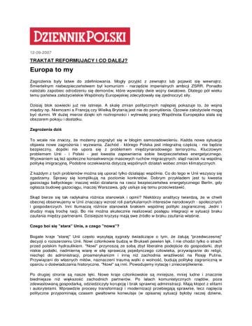 12-09-2007 TRAKTAT REFORMUJĄCY I CO DALEJ? Europa to my Zagrożenia były łatwe do zdefiniowania. Mogły przyjść z zewnątrz lub pojawić się wewnątrz. Śmiertelnym niebezpieczeństwem był komunizm - narzędzie imperialnych ambicji ZSRR. Ponadto należało zapobiec odrodzeniu się demonów, które wywołały dwie wojny światowe. Dlatego pół wieku temu państwa założycielskie Wspólnoty Europejskiej zdecydowały się zjednoczyć siły. Dzisiaj blok sowiecki już nie istnieje. A skalę zmian politycznych najlepiej pokazuje to, że wojna między np. Niemcami a Francją czy Wielką Brytanią jest nie do pomyślenia. Ojcowie założyciele mogą być dumni. W dużej mierze dzięki ich roztropności i wytrwałej pracy Wspólnota Europejska stała się obszarem pokoju i dostatku. Zagrożenia dziś To wcale nie znaczy, że możemy pogrążyć się w błogim samozadowoleniu. Każda nowa sytuacja objawia nowe zagrożenia i wyzwania. Zachód - którego Polska jest integralną częścią - nie będzie bezpieczny, dopóki nie upora się z problemem międzynarodowego terroryzmu. Kluczowym problemem Unii - i Polski - jest kwestia zapewnienia sobie bezpieczeństwa energetycznego. Wyzwaniem są też społeczne konsekwencje masowych ruchów migracyjnych: stąd nacisk na wspólną politykę imigracyjną. Podobne oczekiwania dotyczą wspólnych działań wobec zmian klimatycznych. Z każdym z tych problemów można się uporać tylko działając wspólnie. Co do tego w Unii wszyscy się zgadzamy. Sprawy się komplikują na poziomie konkretów. Dobrym przykładem jest tu kwestia gazociągu bałtyckiego: inaczej widzi działania na rzecz bezpieczeństwa energetycznego Berlin, gdy ogłasza budowę gazociągu, inaczej Warszawa, gdy usiłuje się temu przeciwstawić. Skąd bierze się tak radykalna różnica stanowisk i opinii? Niektórzy analitycy twierdzą, że w chwili obecnej obserwujemy w Unii znaczący wzrost roli partykularnych interesów narodowych - społecznych i gospodarczych. Inni tłumaczą różnice stanowisk brakiem wspólnej polityki zagranicznej. Jedni i drudzy mają trochę racji. Bo nie można skutecznie realizować postępu integracji w sytuacji braku zaufania między partnerami. Dzisiejsze kryzysy mają swe źródło w braku zaufania właśnie. Czego boi się "stara" Unia, a czego "nowa"? Bogate kraje "starej" Unii często wysyłają sygnały świadczące o tym, że żałują "przedwczesnej" decyzji o rozszerzeniu Unii. Nowi członkowie budzą w Brukseli pewien lęk. I nie chodzi tylko o strach przed polskim hydraulikiem. "Nowi" przynoszą ze sobą zbyt liberalne podejście do gospodarki, zbyt niskie podatki, nadmierną wiarę w siłę sprawczą pojedynczego człowieka, przywiązanie do religii, niechęć do administracji, proamerykanizm i inną niż zachodnia wrażliwość na Rosję Putina. Przywiązani do własnych mitów, naznaczeni traumą walki o wolność, budują politykę zagraniczną w oparciu o doświadczenia historyczne. "Nowi" są inni. Powodujemy irytację i zniecierpliwienie. Po drugiej stronie są nasze lęki. Nowe kraje członkowskie są mniejsze, mniej ludne i znacznie biedniejsze niż większość zachodnich partnerów. Po latach komunistycznych rządów, poza zdewastowaną gospodarką, odziedziczyły korupcję i brak sprawnej administracji. Mają kłopot z elitami i autorytetami. Wprawdzie procesy transformacji i modernizacji przebiegają sprawnie, lecz napięcia polityczne przypominają czasem gwałtowne konwulsje (w opisanej sytuacji byłoby raczej dziwne, gdyby napięć nie było). Jednak w żadnym z nowych państw Unii nie doszło do istotnego zakłócenia demokratycznego ładu. Niemniej "nowi" noszą w sobie obawę, że mogą w Unii zostać zepchnięci do roli członków drugiej kategorii. Obawiają się podporządkowania większym, bogatszym i silniejszym partnerom. Obawiają się, że staną się głównie dostarczycielem taniej i selektywnie dobieranej siły roboczej. Że ich interesy i tradycje będą lekceważone. Odbudować zaufanie Odpowiedzią na wzajemne lęki nie mogą być takie zmiany instytucjonalne, które mogłyby zostać zrozumiane jako próba nacisku lub zmniejszenia znaczenia. Urzędnicy Unii nie mogą forsować rozwiązań, do których społeczeństwa i narody nie są gotowe. Polityka, jeśli ma być skuteczna, musi uwzględniać czynnik czasu, bo obszarem działania polityki są nie tylko zapisy i przepisy, lecz również żywa materia - ludzie. Jacques Delors pisał: "Ojcowie Traktatów Rzymskich chcieli Europy politycznej. Wybrali jednak Wspólnotę ekonomiczną, ponieważ rozumieli, że Wspólnoty politycznej nie zbudują. (..) Zastanawiam się, czy wtedy droga polityczna nie powiodła się gdyż była przedwczesna, czy też nie zdążyła dojrzeć w świadomości narodów Europy". Ktoś odpowie, że wobec wyzwań, przed jakimi stoi dziś Europa, nie możemy tracić więcej czasu. Zgoda. Tylko że nie ma sporu o pryncypia. Jest oczywiste, że działanie w imię partykularnych interesów poszczególnych państw współczesnej Unii jest prowadzeniem krótkowzrocznej, XIXwiecznej polityki, uprawianej zresztą głównie na użytek wewnętrzny. Skuteczna obrona interesów narodowych musi być de facto obroną Unii Europejskiej - silnej, solidarnej wspólnoty opartej na partnerstwie. Cele są wspólne, dyskusja dotyczy metod. I znaczenia pojęć. Bogusław Sonik Poseł do Parlamentu Europejskiego