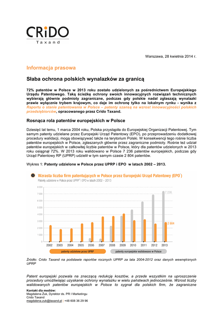 Warszawa, 28 kwietnia 2014 r. Informacja prasowa Słaba ochrona polskich wynalazków za granicą 72% patentów w Polsce w 2013 roku zostało udzielonych za pośrednictwem Europejskiego Urzędu Patentowego. Taką ścieżkę ochrony swoich innowacyjnych rozwiązań technicznych wybierają głównie podmioty zagraniczne, podczas gdy polskie nadal zgłaszają wynalazki prawie wyłącznie trybem krajowym, co daje im ochronę tylko na lokalnym rynku - wynika z Raportu o stanie patentowania w Polsce – patenty szansą na wzrost innowacyjności polskich przedsiębiorców, opracowanego przez Crido Taxand. Rosnąca rola patentów europejskich w Polsce Dziesięć lat temu, 1 marca 2004 roku, Polska przystąpiła do Europejskiej Organizacji Patentowej. Tym samym patenty udzielane przez Europejski Urząd Patentowy (EPO), po przeprowadzeniu dodatkowej procedury walidacji, mogą obowiązywać także na terytorium Polski. W konsekwencji tego rośnie liczba patentów europejskich w Polsce, zgłaszanych głównie przez zagraniczne podmioty. Rośnie też udział patentów europejskich w całkowitej liczbie patentów w Polsce, który dla patentów udzielonych w 2013 roku osiągnął 72%. W 2013 roku walidowano w Polsce 7 236 patentów europejskich, podczas gdy Urząd Patentowy RP (UPRP) udzielił w tym samym czasie 2 804 patentów. Wykres 1: Patenty udzielone w Polsce przez UPRP i EPO w latach 2002 – 2013. Źródło: Crido Taxand na podstawie raportów rocznych UPRP za lata 2004-2012 oraz danych wewnętrznych UPRP Patent europejski pozwala na znaczącą redukcję kosztów, a przede wszystkim na uproszczenie procedury umożliwiając uzyskanie ochrony wynalazku w wielu państwach jednocześnie. Wzrost liczby walidowanych patentów europejskich w Polsce to sygnał dla polskich firm, że zagraniczne Kontakt dla mediów: Magdalena Żuk, Dyrektor ds. PR I Marketingu Crido Taxand [email protected] | +48 608 36 29 96 przedsiębiorstwa doceniają Polskę jako ważny rynek zbytu i dbają u nas o ochronę swoich innowacji technicznych. W związku z tym, że patenty budują realną wartość dla biznesu, polskie firmy powinny spojrzeć na to jako na dobrą praktykę i również, zwłaszcza przy istotniejszych wynalazkach, zadbać o ich ochronę nie tylko w kraju, ale i na innych rynkach – komentuje Łukasz Czernicki, IP Counsel w Crido Taxand. Słaba ochrona polskich wynalazków na świecie Wynalazki o dużym znaczeniu ekonomicznym wymagają szerokiej ochrony patentowej na świecie. Międzynarodowe zgłoszenia wynalazków, tj. zgłoszenia w trybie PCT, umożliwiają uzyskanie takiej ochrony w 148 krajach świata (w tym w USA, Japonii, Chinach), a ich liczba dla danego kraju stanowi ważny miernik innowacyjności. W latach 2007-2013 liczba krajowych zgłoszeń do UPRP wzrosła z 2 392 do 4 237. W tym samym okresie liczba zgłoszeń PCT polskich podmiotów wzrosła jedynie o 223 do 330, co daje Polsce udział w zgłoszeniach międzynarodowych na poziomie 0,16%. Zgłoszenia PCT z Polski w roku 2013 stanowiły jedynie 8% zgłoszeń dokonanych w trybie krajowym, podczas gdy dla Niemiec udział ten wynosi 38%. Pokazuje to, że niemieckie podmioty są dużo bardziej świadome potrzeby międzynarodowej ochrony swoich wynalazków. Pod względem liczby zgłoszeń PCT Polska jest też daleko w tyle m.in. za Hiszpanią, która dokonała ponad 1 700 zgłoszeń PCT w 2013 roku. Wykres 2. Liczba zgłoszeń wynalazków w różnych trybach międzynarodowy) w 2013 roku – Polska w porównaniu do Niemiec (krajowy, europejski, Źródło: Crido Taxand na podstawie: EPO Database 2004-13, PCT „Yearly Review” 2013, dane wewnętrzne UPRP, DPMA “Excerpt from the annual statistics 2013 of the German Patent and Trade Mark Office” 2014. I choć pod względem liczby zgłoszeń PCT Polska wypada nieco lepiej niż Czechy (197 zgłoszeń w 2013 r.) i Węgry (158), to już gorzej w przeliczeniu na 1 mln mieszkańców, co jest jednym z istotnych wskaźników innowacyjności gospodarek poszczególnych krajów. W Czechach na 1 mln mieszkańców przypada 19 zgłoszeń PCT, na Węgrzech – 16. W zestawieniu europejskim za Polską (9 zgłoszeń na 1 mln mieszkańców) są jedynie takie kraje, jak: Ukraina (3), Rosja (8), Słowacja (8) czy Bułgaria (8). Ogromny dystans dzieli nas od czołówki w tym zestawieniu, w którym na pierwszym miejscu jest Luksemburg z 652 zgłoszeniami na 1 mln mieszkańców w 2013 roku i Szwajcaria z 543 zgłoszeniami na 1 mln mieszkańców. Pomimo znaczącego wzrostu zgłoszeń wynalazków do Urzędu Patentowego RP, dystans jaki dzieli nas od krajów będących liderami ochrony patentowej, jest wciąż ogromny. Wynika to przede wszystkim z nieznacznego odsetka krajowych wynalazków, jakie chronione są poza Polską. Przyczyn takiego stanu rzeczy można doszukiwać się w znacznych kosztach związanych z uzyskiwaniem zagranicznych patentów oraz w pozaekonomicznych powodach dokonywania krajowych zgłoszeń wynalazków, które nie niosą ze sobą rzeczywistej wartości rynkowej. Można mieć nadzieję, że Kontakt dla mediów: Magdalena Żuk, Dyrektor ds. PR I Marketingu Crido Taxand [email protected] | +48 608 36 29 96 programy finansowane z funduszy europejskich w ramach Nowej Perspektywy Finansowej 2014 – 2020 będą w większym stopniu promowały ochronę polskich innowacji za granicą – dodaje Łukasz Czernicki IP Counsel w Crido Taxand. Polscy przedsiębiorcy w tyle za naukowcami 48% zgłoszeń krajowych w Polsce pochodzi od szkół wyższych i jednostek naukowych, a tylko 34% od podmiotów gospodarczych. Z kolei na świecie, 84% zgłoszeń PCT pochodzi od firm, które tym samym zapewniają patentom szeroką ochronę, a jedynie 8% od placówek naukowych. Również wśród zgłoszeń europejskich udział tych jednostek jest stosunkowo niewielki, tj. na poziomie 5,5% wszystkich zgłoszeń do Europejskiego Urzędu Patentowego. Wykres 3. Zgłoszenia wynalazków w 2012 roku w podziale na kategorie podmiotów zgł