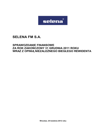 SELENA FM S.A. SPRAWOZDANIE FINANSOWE ZA ROK ZAKOŃCZONY 31 GRUDNIA 2011 ROKU WRAZ Z OPINIĄ NIEZALEŻNEGO BIEGŁEGO REWIDENTA Wrocław, 25 kwietnia 2012 roku Selena FM S.A. Sprawozdanie finansowe za rok zakończony 31 grudnia 2011 roku Spis treści RACHUNEK ZYSKÓW I STRAT .....................................................................................................3 SPRAWOZDANIE Z CAŁKOWITYCH DOCHODÓW ......................................................................3 SPRAWOZDANIE Z SYTUACJI FINANSOWEJ .............................................................................4 SPRAWOZDANIE Z PRZEPŁYWÓW PIENIĘŻNYCH .....................................................................5 SPRAWOZDANIE ZE ZMIAN W KAPITAŁACH WŁASNYCH .........................................................6 POLITYKI RACHUNKOWOŚCI I NOTY OBJAŚNIAJĄCE ..............................................................7 1. Informacje o Spółce...........................................................................................................7 2. Dane dotyczące sprawozdania finansowego ...................................................................8 3. Polityka rachunkowości ....................................................................................................9 4. Istotne wartości oparte na profesjonalnym osądzie i szacunkach................................ 21 5. Segmenty operacyjne ...................................................................................................... 22 6. Koszty operacyjne ........................................................................................................... 23 7. Przychody i koszty finansowe......................................................................................... 24 8. Podatek dochodowy ........................................................................................................ 25 9. Dywidendy wypłacone i zaproponowane do wypłaty .................................................... 27 10. Działalność zaniechana ............................................................................................... 27 11. Majątek socjalny oraz zobowiązania ZFŚS ................................................................. 27 12. Zysk przypadający na jedną akcję .............................................................................. 27 13. Rzeczowe aktywa trwałe .............................................................................................. 28 14. Wartości niematerialne ................................................................................................ 29 15. Udziały i akcje w jednostkach zależnych .................................................................... 30 16. Udzielone pożyczki i pozostałe aktywa finansowe..................................................... 34 17. Zapasy .......................................................................................................................... 37 18. Należności handlowe ................................................................................................... 37 19. Pozostałe należności ................................................................................................... 38 20. Środki pieniężne i ich ekwiwalenty ............................................................................. 38 21. Kapitał podstawowy i kapitały zapasowe oraz rezerwowe......................................... 39 22. Zobowiązania handlowe .............................................................................................. 40 23. Pozostałe zobowiązania .............................................................................................. 41 24. Pozostałe zobowiązania finansowe ............................................................................ 41 25. Kredyty i pożyczki otrzymane ..................................................................................... 41 26. Zobowiązania warunkowe i udzielone gwarancje ...................................................... 43 27. Przyczyny występowania różnic pomiędzy bilansowymi zmianami niektórych pozycji oraz zmianami wynikającymi z rachunku przepływów pieniężnych ............. 45 28. Informacje o podmiotach powiązanych ...................................................................... 45 29. Informacje o wynagrodzeniu podmiotu uprawnionego do badania .......................... 47 30. Cele i zasady zarządzania ryzykiem finansowym ....................................................... 48 31. Instrumenty finansowe ................................................................................................ 50 32. Zarządzanie kapitałem ................................................................................................. 51 33. Struktura zatrudnienia ................................................................................................. 52 34. Program opcji pracowniczych..................................................................................... 52 35. Zdarzenia następujące po dniu bilansowym .............................................................. 53 2/54 Selena FM S.A. Sprawozdanie finansowe za rok zakończony 31 grudnia 2011 roku RACHUNEK ZYSKÓW I STRAT Dane w tys. zł Nota Rok zakończony 31 grudnia 2011 Rok zakończony 31 grudnia 2010 309 237 25 356 334 593 154 10 135 10 289 302 729 31 864 9 789 500 209 13 096 16 264 4 837 -2 124 133 5 11 867 10 -11 249 Działalność kontynuowana Przychody ze sprzedaży towarów i materiałów Przychody ze sprzedaży usług Przychody ze sprzedaży Koszt własny sprzedaży Zysk (strata) brutto ze sprzedaży 6.1 Pozostałe przychody operacyjne Koszty sprzedaży Koszty ogólnego zarządu Pozostałe koszty operacyjne Zysk (strata) z działalności operacyjnej 6.1 6.1 6.4 Przychody finansowe Koszty finansowe Zysk (strata) brutto 7.1 7.2 44 930 2 713 40 093 176 630 107 880 57 501 Podatek doc