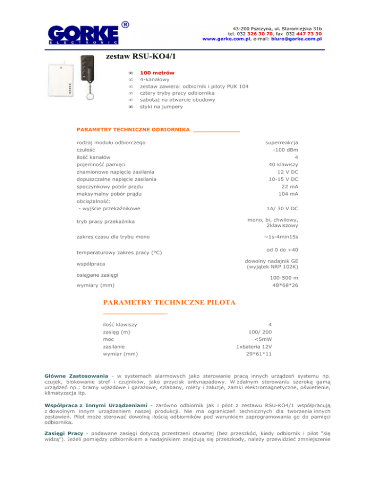 zestaw RSU-KO4/1 • • • • • • 100 metrów 4-kanałowy zestaw zawiera: odbiornik i piloty PUK 104 cztery tryby pracy odbiornika sabotaż na otwarcie obudowy styki na jumpery PARAMETRY TECHNICZNE ODBIORNIKA _____________ rodzaj modułu odbiorczego superreakcja czułość -100 dBm ilość kanałów pojemność pamięci 4 40 klawiszy znamionowe napięcie zasilania dopuszczalne napięcie zasilania 12 V DC 10-15 V DC spoczynkowy pobór prądu 22 mA maksymalny pobór prądu 104 mA obciążalność: - wyjście przekaźnikowe tryb pracy przekaźnika zakres czasu dla trybu mono temperaturowy zakres pracy (°C) współpraca osiągane zasięgi 1A/ 30 V DC mono, bi, chwilowy, 2klawiszowy ~1s-4min15s od 0 do +40 dowolny nadajnik GE (wyjątek NRP 102K) 100-500 m wymiary (mm) 48*68*26 PARAMETRY TECHNICZNE PILOTA _________________ ilość klawiszy zasięg (m) moc zasilanie wymiar (mm) 4 100/ 200 <5mW 1xbateria 12V 29*61*11 Główne Zastosowania - w systemach alarmowych jako sterowanie pracą innych urządzeń systemu np. czujek, blokowanie stref i czujników, jako przycisk antynapadowy. W zdalnym sterowaniu szeroką gamą urządzeń np.: bramy wjazdowe i garażowe, szlabany, rolety i żaluzje, zamki elektromagnetyczne, oświetlenie, klimatyzacja itp. Współpraca z Innymi Urządzeniami - zarówno odbiornik jak i pilot z zestawu RSU-KO4/1 współpracują z dowolnym innym urządzeniem naszej produkcji. Nie ma ograniczeń technicznych dla tworzenia innych zestawień. Pilot może sterować dowolną ilością odbiorników pod warunkiem zaprogramowania go do pamięci odbiornika. Zasięgi Pracy - podawane zasięgi dotyczą przestrzeni otwartej (bez przeszkód, kiedy odbiornik i pilot “się widzą”). Jeżeli pomiędzy odbiornikiem a nadajnikiem znajdują się przeszkody, należy przewidzieć zmniejszenie zasięgu pracy odpowiednio dla: drewna i gipsu o 5-20%, cegły o 20-40 %, betonu zbrojonego o 40 - 80%. Przy dużej ilości przeszkód zalecamy konfigurowanie zestawów na bazie odbiorników klasy SH, stosowanie retransmiterów lub pilotów dużej mocy. Przy przeszkodach metalowych stosowanie systemów radiowych nie jest zalecane. Należy rozważyć zainstalowanie modułu WLC 201, który pozwala na ominięcie tego typu przeszkód. Podwójna wartość podawana przy pilocie dotyczy współpracy z różnymi typami odbiorników. Pierwsza (mniejsza) z odbiornikami superreakcyjnymi typu RSU. Druga (większa) z odbiornikami klasy superheterodynowej np. IDO 500. Pojemność Pamięci Odbiornika - odbiornik z zestawu RSU-KO4/1 posiada pojemność pamięci dla 40 klawiszy. Dla systemów w których ma pracować więcej nadajników należy zastosować konfigurację modułu WLC 201 z kilkoma odbiornikami wersji LC (pojemność pamięci liczy się: ilość odbiornikówx40, konkretnie WLC 201 + 2odbiorniki RSU-KO4/LC to pojemność pamięci 2x40=80). Jednocześnie należy pamiętać, że dla tych odbiorników wykasowanie z pamięci nawet jednego pilota wiąże się z koniecznością ponownego zaprogramowania pilotów, które mają pozostać w systemie. Z tego względu dla systemów dużych (kilkadziesiąt, kilkaset pilotów) zalecamy stosowanie odbiornika IDO 500, który posiada możliwość indywidualnego kasowania nadajników z pamięci odbiornika. Tryby Pracy Odbiornika - tryb monostabilny czyli naciśnięcie klawisza pilota powoduje załączenie przekaźnika na ustawiony czas. Tryb bistabilny - każdorazowe naciśnięcie klawisza, powoduje zmianę stanu przekaźnika na przeciwny. Tryb chwilowy - przekaźnik załączony jest tak długo jak długo naciskamy klawisz pilota. Tryb dwuklawiszowy - w tym trybie przekaźnik może zostać załączony klawiszem o kodzie nieparzystym (1,3,5,7,9,11,13) przypisanym do danego kanału, natomiast wyłączenie przekaźnika następuje po odebraniu sygnału z klawisza o numerze parzystym (2,4,6,8,10,12,14). Kod Zmienny Komunikacji - transmisja radiowa pomiędzy nadajnikiem i odbiornikiem oparta jest na kodzie zmiennym (KEELOQ® firmy Microchip Technology Inc.), który zapewnia wysokie bezpieczeństwo użytkowania oraz odporność na sygnały radiowe pochodzące z innych urządzeń. Każdy nadajnik posiada swój indywidualny kod. Odbiornik reaguje tylko na te transmisje, które pochodzą z nadajników zaprogramowanych do jego pamięci. Częstotliwość 433,92 MHz - urządzenia pracują w oparciu o częstotliwość 433,92 MHz. Pasmo nie wymagające specjalnych zezwoleń i koncesji na użytkowanie.