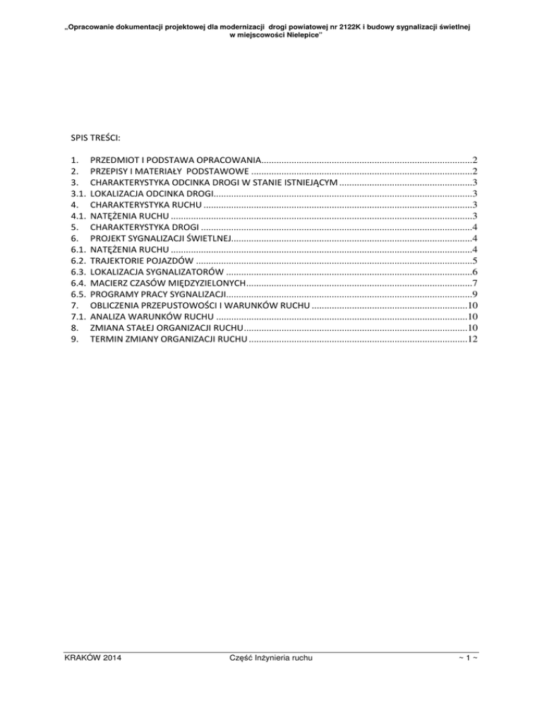 „Opracowanie dokumentacji projektowej dla modernizacji drogi powiatowej nr 2122K i budowy sygnalizacji świetlnej w miejscowości Nielepice” SPIS TREŚCI: 1. 2. 3. 3.1. 4. 4.1. 5. 6. 6.1. 6.2. 6.3. 6.4. 6.5. 7. 7.1. 8. 9. PRZEDMIOT I PODSTAWA OPRACOWANIA....................................................................................2 PRZEPISY I MATERIAŁY PODSTAWOWE ........................................................................................2 CHARAKTERYSTYKA ODCINKA DROGI W STANIE ISTNIEJĄCYM .....................................................3 LOKALIZACJA ODCINKA DROGI.......................................................................................................3 CHARAKTERYSTYKA RUCHU ...........................................................................................................3 NATĘŻENIA RUCHU ........................................................................................................................3 CHARAKTERYSTYKA DROGI ............................................................................................................4 PROJEKT SYGNALIZACJI ŚWIETLNEJ................................................................................................4 NATĘŻENIA RUCHU ........................................................................................................................4 TRAJEKTORIE POJAZDÓW ..............................................................................................................5 LOKALIZACJA SYGNALIZATORÓW ..................................................................................................6 MACIERZ CZASÓW MIĘDZYZIELONYCH ..........................................................................................7 PROGRAMY PRACY SYGNALIZACJI..................................................................................................9 OBLICZENIA PRZEPUSTOWOŚCI I WARUNKÓW RUCHU ..............................................................10 ANALIZA WARUNKÓW RUCHU ....................................................................................................10 ZMIANA STAŁEJ ORGANIZACJI RUCHU .........................................................................................10 TERMIN ZMIANY ORGANIZACJI RUCHU .......................................................................................12 KRAKÓW 2014 Część Inżynieria ruchu ~1~ „Opracowanie dokumentacji projektowej dla modernizacji drogi powiatowej nr 2122K i budowy sygnalizacji świetlnej w miejscowości Nielepice” 1. PRZEDMIOT I PODSTAWA OPRACOWANIA Przedmiotem zamówienia jest „Opracowanie dokumentacji projektowej dla modernizacji drogi powiatowej nr 2122K i budowy sygnalizacji świetlnej w miejscowości Nielepice”. W ramach przedmiotu zamówienia w części inżynierii ruchu opracowano projekt sygnalizacji świetlnej – część ruchowa wraz z projektem organizacji ruchu polegający na zaprojektowaniu dla zawężonego odcinka drogi sygnalizacji wahadłowej stałoczasowej, uwzględniającej wloty ze zjazdów indywidualnych (5 zjazdów). 2. PRZEPISY I MATERIAŁY PODSTAWOWE W pracach projektowych uwzględniono przepisy wynikające z obowiązującego prawa, norm i wytycznych do projektowania w szczególności: • Ustawa z dnia 21 marca 1985 r. o drogach publicznych – (tekst jednolity Dz. U. z 2004 r. Nr 204, poz. 2086, z późn. zmian.) – [1]. • Ustawa z dnia 20 czerwca 1997 r. – Prawo o ruchu drogowym (tekst jednolity Dz. U. z 2003r. Nr 58, poz. 515 z późn. zmian.) – [2]. • Rozporządzenie Ministra Transportu i Gospodarki Morskiej z dnia 2 marca 1999 r. w sprawie warunków technicznych, jakim powinny odpowiadać drogi publiczne i ich usytuowanie (Dz. U. Nr 43, poz. 430) – [3]. • Rozporządzenie Ministra Infrastruktury z dnia 23 września 2003 r. w sprawie szczegółowych warunków zarządzania ruchem na drogach oraz wykonywania nadzoru nad tym zarządzaniem (Dz. U. Nr 177, poz. 1729) – [4]. • Rozporządzenie Ministrów Transportu i Gospodarki Morskiej oraz Spraw Wewnętrznych i Administracji z dnia 31 lipca 2002 r. w sprawie znaków i sygnałów drogowych (Dz. U. Nr 170, poz. 1393) – [5]. • Rozporządzenie Ministra Infrastruktury z dnia 3 lipca 2003 r. w sprawie szczegółowych warunków technicznych dla znaków i sygnałów drogowych oraz urządzeń bezpieczeństwa ruchu drogowego i warunków ich umieszczania na drogach (Dz. U. Nr 220, poz. 2181) – [6]. Szczegółowe warunki techniczne dla znaków i sygnałów drogowych oraz urządzeń bezpieczeństwa ruchu drogowego i warunki ich umieszczania na drogach. Załącznik nr 1-4 do rozporządzenia z dnia 3 lipca 2003 r. w sprawie szczegółowych warunków technicznych dla znaków i sygnałów drogowych oraz urządzeń bezpieczeństwa ruchu drogowego i warunków ich umieszczania na drogach (Załącznik do nr-u 220, poz. 2181 z dnia 23 grudnia 2003 r.) – [7]. KRAKÓW 2014 Część Inżynieria ruchu ~2~ „Opracowanie dokumentacji projektowej dla modernizacji drogi powiatowej nr 2122K i budowy sygnalizacji świetlnej w miejscowości Nielepice” 3. CHARAKTERYSTYKA ODCINKA DROGI W STANIE ISTNIEJĄCYM 3.1. LOKALIZACJA ODCINKA DROGI Przedmiotowy odcinek drogi powiatowej (ul. J. Trzaskowskiego) znajduje się w m. Nielepice w obszarze zabudowanym. Początek odcinka zlokalizowany jest za zjazdem indywidualnym do posesji nr 136b (strona prawa), koniec odcinka znajduje się przed zjazdem indywidualnym do posesji nr 77 (strona lewa). Orientacyjną lokalizację skrzyżowania przedstawiono na rys 3.1. Rys. 3.1. Orientacyjna lokalizacja odcinka drogi 4. CHARAKTERYSTYKA RUCHU 4.1. NATĘŻENIA RUCHU Dla wykonania analiz ruchowych oraz identyfikacji potoków pojazdów na analizowanym odcinku drogi zostały wykonane 6h pomiary natężenia ruchu 3h rano (7.00 – 10.00) i 3h popołudniu (14.00 – 17.00). Dane te są niezbędne do opracowania programu sygnalizacji świetlnej oraz sprawdzenia warunków przepustowości przedm