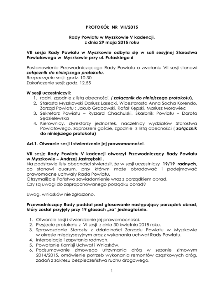 PROTOKÓŁ NR VII/2015 Rady Powiatu w Myszkowie V kadencji, z dnia 29 maja 2015 roku VII sesja Rady Powiatu w Myszkowie odbyła się w sali sesyjnej Starostwa Powiatowego w Myszkowie przy ul. Pułaskiego 6 Postanowienie Przewodniczącego Rady Powiatu o zwołaniu VII sesji stanowi załącznik do niniejszego protokołu. Rozpoczęcie sesji: godz. 10.30 Zakończenie sesji: godz. 12.55 W sesji uczestniczyli: 1. radni, zgodnie z listą obecności, ( załącznik do niniejszego protokołu), 2. Starosta Myszkowski Dariusz Lasecki, Wicestarosta Anna Socha Korendo, Zarząd Powiatu : Jakub Grabowski, Rafał Kępski, Mariusz Morawiec 3. Sekretarz Powiatu – Ryszard Chachulski, Skarbnik Powiatu – Dorota Sędzielewska 4. Kierownicy, dyrektorzy jednostek, naczelnicy wydziałów Starostwa Powiatowego, zaproszeni goście, zgodnie z listą obecności ( załącznik do niniejszego protokołu) Ad.1. Otwarcie sesji i stwierdzenie jej prawomocności. VII sesję Rady Powiatu V kadencji otworzył Przewodniczący Rady Powiatu w Myszkowie – Andrzej Jastrzębski . Na podstawie listy obecności stwierdził, że w sesji uczestniczy 19/19 radnych, co stanowi quorum, przy którym może obradować i podejmować prawomocne uchwały Rada Powiatu. Otrzymaliście Państwo zawiadomienie wraz z porządkiem obrad. Czy są uwagi do zaproponowanego porządku obrad? Uwag, wniosków nie zgłoszono. Przewodniczący Rady poddał pod głosowanie następujący porządek obrad, który został przyjęty przy 19 głosach „za” jednogłośnie. 1. Otwarcie sesji i stwierdzenie jej prawomocności. 2. Przyjęcie protokołu z VI sesji z dnia 30 kwietnia 2015 roku. 3. Sprawozdanie Starosty z działalności Zarządu Powiatu w Myszkowie w okresie międzysesyjnym oraz z wykonania uchwał Rady Powiatu. 4. Interpelacje i zapytania radnych. 5. Powołanie Komisji Uchwał i Wniosków. 6. Podsumowanie zimowego utrzymania dróg w sezonie zimowym 2014/2015, omówienie potrzeb wykonania remontów cząstkowych dróg, zadań z zakresu bezpieczeństwa ruchu drogowego. 1 7. Podjęcie uchwały w sprawie uchwalenia „Powiatowego programu zapobiegania przestępczości oraz ochrony porządku publicznego i bezpieczeństwa obywateli na lata 2015-2018” 8. Podjęcie uchwały w sprawie zmiany Uchwały Nr IV/49/2015 Rady Powiatu w Myszkowie z dnia 27 lutego 2015 roku w sprawie wyrażenia zgody na sprzedaż nieruchomości stanowiącej własność Powiatu Myszkowskiego położonej w Myszkowie. 9. Podjęcie uchwały w sprawie wyrażenia zgody na sprzedaż nieruchomości stanowiącej własność Powiatu Myszkowskiego położonej w Myszkowie. 10. Podjęcie uchwały w sprawie określenia rozkładu godzin aptek ogólnodostępnych na terenie Powiatu Myszkowskiego. 11. Podjęcie uchwały w sprawie zatwierdzenia rocznego sprawozdania finansowego SP ZOZ w Myszkowie za 2014 rok. 12. Wnioski i oświadczenia radnych. 13. Odpowiedzi na interpelacje i zapytania radnych. 14. Zamknięcie obrad sesji. Ad.2. Przyjęcie protokołu z VI sesji z dnia 30 kwietnia 2015 roku. Protokół z VI sesji Rady Powiatu z dnia 30 kwietnia 2015 roku został przyjęty bez uwag, przy 19 głosach "za", jednogłośnie. Ad. 3. Sprawozdanie Starosty z działalności Zarządu Powiatu w Myszkowie w okresie międzysesyjnym oraz z wykonania uchwał Rady Powiatu. Sprawozdanie z bieżącej działalności Zarządu Powiatu w okresie międzysesyjnym oraz sprawozdanie z wykonania uchwał Rady Powiatu przedstawił Starosta Myszkowski – Dariusz Lasecki – ww. sprawozdania stanowią załączniki do niniejszego protokołu. Do przedstawionych sprawozdań zgłoszono nst pytania: Piotr Bańka – Panie starosto nie usłyszałem w sprawozdaniu, czy zarząd zajmował się w ostatnim okresie, pomiędzy sesjami działalnością agitacyjną związaną z wyborami prezydenckimi pana Komorowskiego? Pytam dlatego, bo ukazało się w gazecie lokalnej ogłoszenie, w którym pan jako starosta i pani Korendo jako wicestarosta uczestniczą w akcji wyborczej pana prezydenta Komorowskiego. W związku z tym chciałem zapytać, czy zarząd podjął taką uchwałę , czy państwo reprezentowali Zarząd czy była to inicjatywa oddolna, czyli państwa? Jeżeli to była prywatna inicjatywa to dlaczego używał pan tytułu starosty i wicestarosty? I kolejna sprawa kto płacił za to ogłoszenie? Dariusz Lasecki - Odpowiem na to pytanie w ostatniej części . 2 Piotr Bańka - Teraz są odpowiedzi na pytania panie starosto, to było pytanie do sprawozdania. Dariusz Lasecki – Punkt 13, to nie było przedmiotem obrad zarządu. Piotr Bańka – Rozumiem, że na pozostałe pytania otrzymam odpowiedzi na koniec sesji, nie za 2 tygodnie, na piśmie? Dariusz Lasecki – Odpowiem w punkcie 13 – odpowiedziach na interpelacje. Innych pytań nie zgłoszono. Ww. sprawozdania zostały przez Radę Powiatu przyjęte przy 19 głosach „za”, 0 głosach „przeciwnych”, 0 głosach „wstrzymujących się” . Ad.4. Interpelacje i zapytania radnych. Andrzej Jastrzębski – Przewodniczący Rady Powiatu w Myszkowie – Zgodnie z § 21 i 22 Statutu Powiatu Myszkowskiego, interpelacje mogą być składane w sprawach zasadniczych dla powiatu, natomiast zapytania w sprawach dotyczących bieżących problemów powiatu, w szczególności w celu uzyskania informacji o określonym stanie faktycznym. Radni mogą składać interpelacje na sesji lub w okresie międzysesyjnym. Czas interpelacji ustnej nie może wynosić więcej niż 5 minut, natomiast zapytania nie więcej niż 3 minuty. Proszę Panie i Panów radnych o zgłaszanie interpelacji i zapytań. Mariusz Trepka – Mam dwie interpelacje, a w zasadzie interpelację i jedno zapytanie, pierwsze do zarządu i do pana starosty. Braliśmy udział wspólnie na zaproszenie burmistrza Żarek Klemensa Podlejskiego w uroczystościach związanych z obchodami 25 lecia samorządności i tam pan starosta wspólnie z burmistrzem Żarek i Myszkowa pochwalił się że będzie szansa na wcześniejsze wykonanie remontu dr