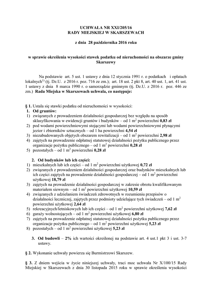 UCHWAŁA NR XXI/205/16 RADY MIEJSKIEJ W SKARSZEWACH z dnia 28 października 2016 roku w sprawie określenia wysokości stawek podatku od nieruchomości na obszarze gminy Skarszewy Na podstawie art. 5 ust. 1 ustawy z dnia 12 stycznia 1991 r. o podatkach i opłatach lokalnych1) (tj. Dz.U. z 2016 r. poz. 716 ze zm.); art. 18 ust. 2 pkt 8, art. 40 ust. 1, art. 41 ust. 1 ustawy z dnia 8 marca 1990 r. o samorządzie gminnym (tj. Dz.U. z 2016 r. poz. 446 ze zm.) Rada Miejska w Skarszewach uchwala, co następuje: § 1. Ustala się stawki podatku od nieruchomości w wysokości: 1. Od gruntów: 1) związanych z prowadzeniem działalności gospodarczej bez względu na sposób sklasyfikowania w ewidencji gruntów i budynków – od 1 m2 powierzchni 0,83 zł 2) pod wodami powierzchniowymi stojącymi lub wodami powierzchniowymi płynącymi jezior i zbiorników sztucznych – od 1 ha powierzchni 4,54 zł 3) niezabudowanych objętych obszarem rewitalizacji – od 1 m2 powierzchni 2,98 zł 4) zajętych na prowadzenie odpłatnej statutowej działalności pożytku publicznego przez organizacje pożytku publicznego – od 1 m2 powierzchni 0,28 zł 5) pozostałych – od 1 m2 powierzchni 0,28 zł 1) 2) 3) 4) 5) 6) 7) 8) 2. Od budynków lub ich części: mieszkalnych lub ich części – od 1 m2 powierzchni użytkowej 0,72 zł związanych z prowadzeniem działalności gospodarczej oraz budynków mieszkalnych lub ich części zajętych na prowadzenie działalności gospodarczej – od 1 m2 powierzchni użytkowej 18,79 zł zajętych na prowadzenie działalności gospodarczej w zakresie obrotu kwalifikowanym materiałem siewnym – od 1 m2 powierzchni użytkowej 10,59 zł związanych z udzielaniem świadczeń zdrowotnych w rozumieniu przepisów o działalności leczniczej, zajętych przez podmioty udzielające tych świadczeń – od 1 m2 powierzchni użytkowej 2,64 zł rekreacyjnych/letniskowych lub ich części – od 1 m2 powierzchni użytkowej 7,62 zł garaży wolnostojących – od 1 m2 powierzchni użytkowej 6,80 zł zajętych na prowadzenie odpłatnej statutowej działalności pożytku publicznego przez organizacje pożytku publicznego – od 1 m2 powierzchni użytkowej 5,23 zł pozostałych – od 1 m2 powierzchni użytkowej 5,23 zł 3. Od budowli – 2% ich wartości określonej na podstawie art. 4 ust.1 pkt 3 i ust. 3-7 ustawy. § 2. Wykonanie uchwały powierza się Burmistrzowi Skarszew. § 3. Z dniem wejścia w życie niniejszej uchwały, traci moc uchwała Nr X/100/15 Rady Miejskiej w Skarszewach z dnia 30 listopada 2015 roku w sprawie określenia wysokości stawek podatku od nieruchomości na obszarze gminy Skarszewy (Dziennik Urzędowy Województwa Pomorskiego z dnia 14 grudnia 2015 r. poz. 4085). § 4. Uchwała wchodzi w życie po upływie 14 dni od daty ogłoszenia w Dzienniku Urzędowym Województwa Pomorskiego z mocą obowiązującą od 1 stycznia 2017 r. ________ 1) Niniejsza ustawa dokonuje w zakresie swojej regulacji wdrożenia następujących dyrektyw Wspólnot Europejskich: 1) dyrektywy 92/106/EWG z dnia 7 grudnia 1992 r. w sprawie ustanowienia wspólnych zasad dla niektórych typów transportu kombinowanego towarów między państwami członkowskimi ( Dz. Urz. WE L 368 z 17.12.1992), 2) dyrektywy 1999/62/WE z dnia 17 czerwca 1999 r. w sprawie pobierania opłat za użytkowanie niektórych typów infrastruktury przez pojazdy ciężarowe ( Dz. Urz. WE L 187 z 20.07.1999). Dane dotyczące ogłoszenia aktów prawa Unii Europejskiej, zamieszczone w niniejszej ustawie – z dniem uzyskania przez Rzeczpospolitą Polską członkostwa w Unii Europejskiej – dotyczącą ogłoszenia tych aktów w Dzienniku Urzędowym Unii Europejskiej – wydanie specjalne. 2 UZASADNIENIE Zgodnie z art. 20 ustawy z dnia 12 stycznia 1991 r. o podatkach i opłatach lokalnych, górne stawki podatku od nieruchomości, ulegają corocznie zmianie na następny rok podatkowy w stopniu odpowiadającemu wskaźnikowi cen towarów i usług konsumpcyjnych w okresie pierwszego półrocza roku, w którym podejmowana jest uchwała, w stosunku do analogicznego okresu roku poprzedniego. Obwieszczenie Ministra Finansów z dnia 28 lipca 2016 r. w sprawie górnych stawek kwotowych podatków i opłat lokalnych w 2017 r. wyznacza górne stawki podatków. Stawki podatków określone przez Radę Miejską nie mogą przekroczyć maksymalnych stawek ogłoszonych w wyżej wymienionym obwieszczeniu. Uchwała określająca wysokość stawek podatku od nieruchomości na rok 2017 jest uchwałą okołobudżetową, mającą wpływ na dochód własny w budżecie na rok 2017. Przy określeniu wysokości stawek podatkowych, uwzględniono uwarunkowania, w jakich funkcjonują podatnicy podatku od nieruchomości. 3