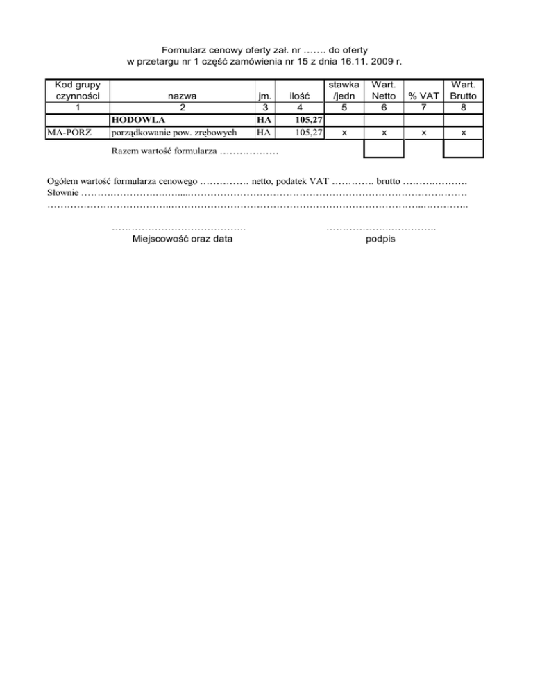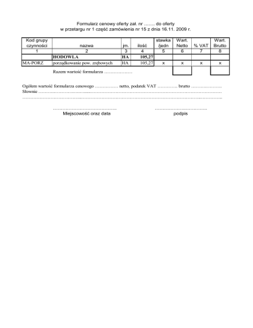 Formularz cenowy oferty zał. nr ……. do oferty w przetargu nr 1 część zamówienia nr 15 z dnia 16.11. 2009 r. Kod grupy czynności 1 MA-PORZ nazwa 2 HODOWLA porządkowanie pow. zrębowych jm. 3 HA HA ilość 4 105,27 105,27 stawka /jedn 5 Wart. Netto 6 % VAT 7 Wart. Brutto 8 x x x x Razem wartość formularza ……………… Ogółem wartość formularza cenowego …………… netto, podatek VAT …………. brutto ……….………. Słownie ……….………….….….....………………………………………………………………………… ………………………………..…………………………………………………………………..………….. ………………………………….. Miejscowość oraz data ………………..………….. podpis
