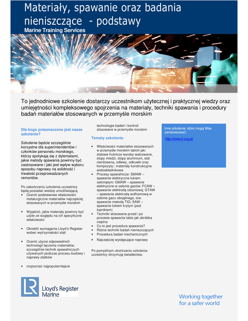 Materiały, spawanie oraz badania nieniszczące - podstawy Marine Training Services To jednodniowe szkolenie dostarczy uczestnikom użytecznej i praktycznej wiedzy oraz umiejętności kompleksowego spojrzenia na materiały, techniki spawania i procedury badań materiałów stosowanych w przemyśle morskim technologie badań i kontroli stosowane w przemyśle morskim Dla kogo przeznaczone jest nasze szkolenie? Tematy szkolenia: Szkolenie będzie szczególnie korzystne dla superintendentów i członków personelu morskiego, którzy spotykają się z dylematami, jakie metody spawania powinny być zastosowane i jaki jest wpływ wyboru sposobu naprawy na solidność i trwałość przeprowadzanych remontów. • Wyjaśnić, jakie materiały powinny być użyte ze względu na ich specyficzne właściwości • • Określić wymagania Lloyd’s Register wobec wytrzymałości stali • • • Właściwości materiałów stosowanych w przemyśle morskim takich jak: stalowe hutnicze wyroby walcowane, stopy miedzi, stopy aluminium, stal nierdzewna, odlewy, odkuwki oraz kompozyty:: materiały konstrukcyjne wieloskładnikowe Procesy spawalnicze: SMAW – spawanie elektryczne łukiem osłoniętym; GMAW – spawanie elektryczne w osłonie gazów; FCAW – spawanie elektrodą rdzeniową; GTAW – spawanie elektrodą wolframową w osłonie gazu obojętnego, tzw. spawanie metodą TIG; SAW – spawanie łukiem krytym (pod topnikiem) Techniki stosowane przed i po procesie spawania takie jak obróbka cieplna Co to jest procedura spawania? Różne techniki badań nieniszczących Procedura badań mechanicznych • Ocenić użycie odpowiednich technologii łączenia materiałów, szczególnie technik spawalniczych używanych podczas procesu budowy i naprawy statków • Najczęściej występujące naprawy • • Po zakończeniu szkolenia uczestnicy będą posiadać wiedzę umożliwiającą: • Ocenić podstawowe właściwości metalurgiczne materiałów najczęściej stosowanych w przemyśle morskim • Inne szkolenie, które mogą Was zainteresować: http://www.lr.org.pl/ Po pomyślnym ukończeniu szkolenia uczestnicy otrzymują świadectwa. rozpoznać najpopularniejsze Working together for a safer world This course has been granted official IMarEST CPD recognition. To find out more about how we can help you please visit us at: www.lr.org/training or contact us at [email protected] www.lr.org December 2013 Lloyd’s Register and variants of it are trading names of Lloyd’s Register Group Limited, its subsidiaries and affiliates. Copyright © Lloyd’s Register EMEA 2013. A member of the Lloyd’s Register group.