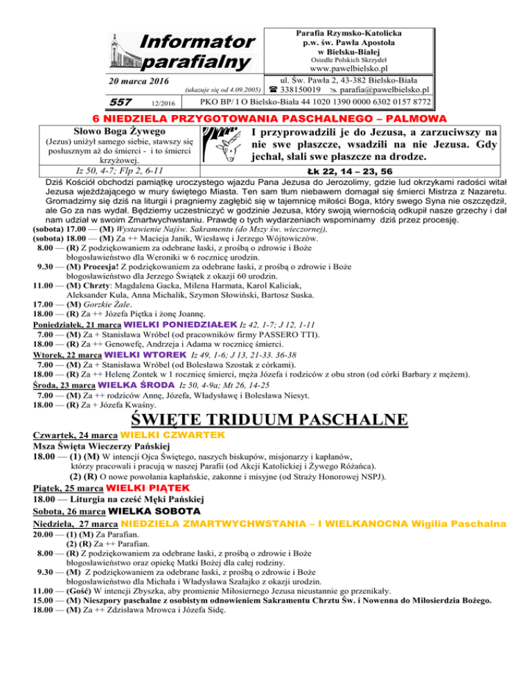 Parafia Rzymsko-Katolicka p.w. św. Pawła Apostoła w Bielsku-Białej Osiedle Polskich Skrzydeł 20 marca 2016 557 12/2016 www.pawelbielsko.pl ul. Św. Pawła 2, 43-382 Bielsko-Biała (ukazuje się od 4.09.2005) 338150019 [email protected] PKO BP/ I O Bielsko-Biała 44 1020 1390 0000 6302 0157 8772 6 NIEDZIELA PRZYGOTOWANIA PASCHALNEGO – PALMOWA Słowo Boga Żywego I przyprowadzili je do Jezusa, a zarzuciwszy na (Jezus) uniżył samego siebie, stawszy się posłusznym aż do śmierci - i to śmierci krzyżowej. nie swe płaszcze, wsadzili na nie Jezusa. Gdy jechał, słali swe płaszcze na drodze. Iz 50, 4-7; Flp 2, 6-11 Łk 22, 14 – 23, 56 Dziś Kościół obchodzi pamiątkę uroczystego wjazdu Pana Jezusa do Jerozolimy, gdzie lud okrzykami radości witał Jezusa wjeżdżającego w mury świętego Miasta. Ten sam tłum niebawem domagał się śmierci Mistrza z Nazaretu. Gromadzimy się dziś na liturgii i pragniemy zagłębić się w tajemnicę miłości Boga, który swego Syna nie oszczędził, ale Go za nas wydał. Będziemy uczestniczyć w godzinie Jezusa, który swoją wiernością odkupił nasze grzechy i dał nam udział w swoim Zmartwychwstaniu. Prawdę o tych wydarzeniach wspominamy dziś przez procesję. (sobota) 17.00 — (M) Wystawienie Najśw. Sakramentu (do Mszy św. wieczornej), (sobota) 18.00 — (M) Za ++ Macieja Janik, Wiesławę i Jerzego Wójtowiczów. 8.00 — (R) Z podziękowaniem za odebrane łaski, z prośbą o zdrowie i Boże błogosławieństwo dla Weroniki w 6 rocznicę urodzin. 9.30 — (M) Procesja! Z podziękowaniem za odebrane łaski, z prośbą o zdrowie i Boże błogosławieństwo dla Jerzego Świątek z okazji 60 urodzin. 11.00 — (M) Chrzty: Magdalena Gacka, Milena Harmata, Karol Kaliciak, Aleksander Kula, Anna Michalik, Szymon Słowiński, Bartosz Suska. 17.00 — (M) Gorzkie Żale. 18.00 — (R) Za ++ Józefa Piętka i żonę Joannę. Poniedziałek, 21 marca WIELKI PONIEDZIAŁEK Iz 42, 1-7; J 12, 1-11 7.00 — (M) Za + Stanisława Wróbel (od pracowników firmy PASSERO TTI). 18.00 — (R) Za ++ Genowefę, Andrzeja i Adama w rocznicę śmierci. Wtorek, 22 marca WIELKI WTOREK Iz 49, 1-6; J 13, 21-33. 36-38 7.00 — (M) Za + Stanisława Wróbel (od Bolesława Szostak z córkami). 18.00 — (R) Za ++ Helenę Zontek w 1 rocznicę śmierci, męża Józefa i rodziców z obu stron (od córki Barbary z mężem). Środa, 23 marca WIELKA ŚRODA Iz 50, 4-9a; Mt 26, 14-25 7.00 — (M) Za ++ rodziców Annę, Józefa, Władysławę i Bolesława Niesyt. 18.00 — (R) Za + Józefa Kwaśny. ŚWIĘTE TRIDUUM PASCHALNE Czwartek, 24 marca WIELKI CZWARTEK Msza Święta Wieczerzy Pańskiej 18.00 — (1) (M) W intencji Ojca Świętego, naszych biskupów, misjonarzy i kapłanów, którzy pracowali i pracują w naszej Parafii (od Akcji Katolickiej i Żywego Różańca). (2) (R) O nowe powołania kapłańskie, zakonne i misyjne (od Straży Honorowej NSPJ). Piątek, 25 marca WIELKI PIĄTEK 18.00 — Liturgia na cześć Męki Pańskiej Sobota, 26 marca WIELKA SOBOTA Niedziela, 27 marca NIEDZIELA ZMARTWYCHWSTANIA – I WIELKANOCNA Wigilia Paschalna 20.00 — (1) (M) Za Parafian. (2) (R) Za ++ Parafian. 8.00 — (R) Z podziękowaniem za odebrane łaski, z prośbą o zdrowie i Boże błogosławieństwo oraz opiekę Matki Bożej dla całej rodziny. 9.30 — (M) Z podziękowaniem za odebrane łaski, z prośbą o zdrowie i Boże błogosławieństwo dla Michała i Władysława Szałajko z okazji urodzin. 11.00 — (Gość) W intencji Zbyszka, aby promienie Miłosiernego Jezusa nieustannie go przenikały. 15.00 — (M) Nieszpory paschalne z osobistym odnowieniem Sakramentu Chrztu Św. i Nowenna do Miłosierdzia Bożego. 18.00 — (M) Za ++ Zdzisława Mrowca i Józefa Sidę. DIAKONIA SPRZĄTANIA Dziękujemy mieszkańcom z ul. Trzech Diamentów 36 za posprzątanie kościoła i ofiarę na kościół. Msza św. w ich intencji będzie w niedzielę 24.04. o godz. 1100. W tym tygodniu prosimy o porządki świąteczne w Wielki Czwartek o godz. 900 mieszkających w domach jednorodzinnych przy ul. Trzech Diamentów (dawna Spadzista). ZAPOWIEDZI PRZEDŚLUBNE (1) POJDA Maciej, zam. Pszczyna i SIWEK (POJDA) Marta, zam. B.B. (3) KUKLA Tomasz, zam. B.B. i MATUKIEWICZ Ewa, zam. B.B. (3) MAŁOJŁO Grzegorz, zam. B.B. i PAWŁOWSKA Justyna, zam. B.B. 1. 2. 3. 4. 5. 6. 7. 8. 9. 10. 11. 12. 13. OGŁOSZENIA DUSZPASTERSKIE W ramach akcji charytatywnej przy drzwiach kościoła Parafialny Zespół Charytatywny oferuje baranki z pieczywa oraz palmy. Polecamy życzliwości parafian tę akcję. Tam też można składać ofiary na kwiaty i dekoracje świąteczne! Kancelaria w tym Wielkim Tygodniu czynna wyłącznie w poniedziałek i środę rano!!! W czasie Triduum postarajmy się zyskać odpust zupełny - wypełniając zwykłe jego warunki, a ponadto spełniając następujące dzieła: 3.1. W Wielki Czwartek udział we Mszy św. i uroczyste odmówienie „Przed tak Wielkim Sakramentem”; 3.2. W Wielki Piątek pobożne uczestnictwo w Adoracji Krzyża i ucałowanie go w czasie uroczystego obrzędu liturgicznego; 3.3. W Wielką Sobotę udział we Mszy Św. Wigilii Paschalnej i odnowienie przyrzeczeń Chrztu. Kolekty: 4.1. W Wielki Czwartek kolekta charytatywna - ofiara miłości składana „na tacę”, także jako owoc naszych wielkopostnych wyrzeczeń; 4.2. W Wielki Piątek i Wielką Sobotę (składana przy adoracji krzyża): na „Boży Grób” w Jerozolimie i w ogóle utrzymanie miejsc świętych w Ziemi Świętej; 4.3. W Poniedziałek Wielkanocny na KUL i Uniwersytet Papieski JP II w Krakowie. W Wielki Czwartek na Mszę św. Wieczerzy Pańskiej gromadzimy się wchodząc tylko przez główne drzwi i przez Bramę Miłosierdzia – Dar Uzdrowienia. Po przejściu zanurzamy rękę w wodzie pobłogosławionej i dotykamy nią wszystkich zmysłów: oczy, uszy, język – wargi, ręce, nogi, serce, umysł z modlitwą, by Jezus uzdrowił wszystkie te sfery!!! W Wielki Piątek obowiązuje post ścisły: powstrzymyw