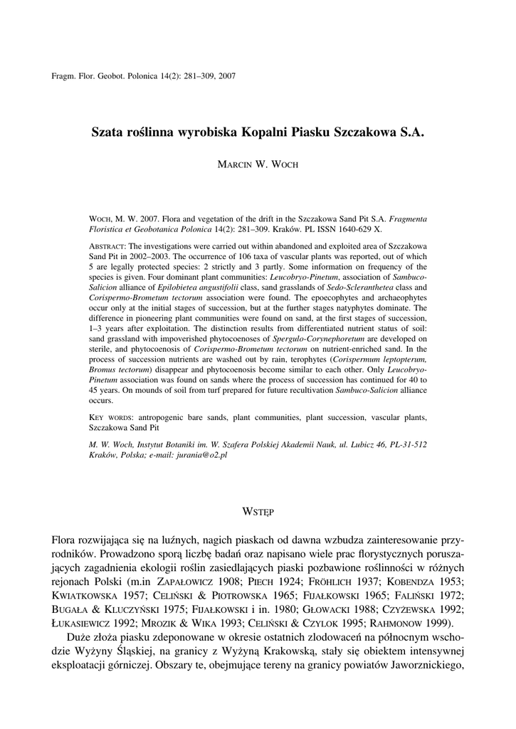 Fragm. Flor. Geobot. Polonica 14(2): 281–309, 2007 Szata roślinna wyrobiska Kopalni Piasku Szczakowa S.A. MARCIN W. WOCH WOCH, M. W. 2007. Flora and vegetation of the drift in the Szczakowa Sand Pit S.A. Fragmenta Floristica et Geobotanica Polonica 14(2): 281–309. Kraków. PL ISSN 1640-629 X. ABSTRACT: The investigations were carried out within abandoned and exploited area of Szczakowa Sand Pit in 2002–2003. The occurrence of 106 taxa of vascular plants was reported, out of which 5 are legally protected species: 2 strictly and 3 partly. Some information on frequency of the species is given. Four dominant plant communities: Leucobryo-Pinetum, association of SambucoSalicion alliance of Epilobietea angustifolii class, sand grasslands of Sedo-Scleranthetea class and Corispermo-Brometum tectorum association were found. The epoecophytes and archaeophytes occur only at the initial stages of succession, but at the further stages natyphytes dominate. The difference in pioneering plant communities were found on sand, at the first stages of succession, 1–3 years after exploitation. The distinction results from differentiated nutrient status of soil: sand grassland with impoverished phytocoenoses of Spergulo-Corynephoretum are developed on sterile, and phytocoenosis of Corispermo-Brometum tectorum on nutrient-enriched sand. In the process of succession nutrients are washed out by rain, terophytes (Corispermum leptopterum, Bromus tectorum) disappear and phytocoenosis become similar to each other. Only LeucobryoPinetum association was found on sands where the process of succession has continued for 40 to 45 years. On mounds of soil from turf prepared for future recultivation Sambuco-Salicion alliance occurs. KEY WORDS: antropogenic bare sands, plant communities, plant succession, vascular plants, Szczakowa Sand Pit M. W. Woch, Instytut Botaniki im. W. Szafera Polskiej Akademii Nauk, ul. Lubicz 46, PL-31-512 Kraków, Polska; e-mail: [email protected] WSTĘP Flora rozwijająca się na luźnych, nagich piaskach od dawna wzbudza zainteresowanie przyrodników. Prowadzono sporą liczbę badań oraz napisano wiele prac florystycznych poruszających zagadnienia ekologii roślin zasiedlających piaski pozbawione roślinności w różnych rejonach Polski (m.in ZAPAŁOWICZ 1908; PIECH 1924; FRÖHLICH 1937; KOBENDZA 1953; KWIATKOWSKA 1957; CELIŃSKI & PIOTROWSKA 1965; FIJAŁKOWSKI 1965; FALIŃSKI 1972; BUGAŁA & KLUCZYŃSKI 1975; FIJAŁKOWSKI i in. 1980; GŁOWACKI 1988; CZYŻEWSKA 1992; ŁUKASIEWICZ 1992; MROZIK & WIKA 1993; CELIŃSKI & CZYLOK 1995; RAHMONOW 1999). Duże złoża piasku zdeponowane w okresie ostatnich zlodowaceń na północnym wschodzie Wyżyny Śląskiej, na granicy z Wyżyną Krakowską, stały się obiektem intensywnej eksploatacji górniczej. Obszary te, obejmujące tereny na granicy powiatów Jaworznickiego, 282 Fragm. Flor. Geobot. Polonica 14(2), 2007 Olkuskiego i Chrzanowskiego pozbawiano pokrywy roślinnej, a po wybraniu piasku do spągu złoża przeprowadzano na nich rekultywację leśną. Wyjątkiem w tej regule stał się fragment obszaru górniczego Kopalni Piasku Szczakowa S. A., tzw., „Pole Siersza”, wysunięty najbardziej na południowy-wschód, należący początkowo do pobliskiej Kopalni Węgla Kamiennego Siersza (Ryc. 1). Był on powoli eksploatowany na potrzeby podsadzkowe tej kopalni. Zaprzestanie użytkowania przez KWK Siersza, a następnie zamknięcie tego zakładu spowodowało, że w wielu miejscach tego wyrobiska nie prowadzono prac górniczych przez około 30–45 lat, a cały teren pozostawiono bez rekultywacji. Wobec tego zaczęły zachodzić tu zjawiska spontanicznej, naturalnej sukcesji roślinnej. W 1988 r. tereny wyrobiska zostały przejęte przez Kopalnie Piasku Szczakowa S.A., która od strony północnej i zachodniej wznowiła eksploatację piasku. Przeprowadzone badania miały na celu opisanie szaty roślinnej ukształtowanej na terenie piaskowni w zależności od typu siedliska i czasu trwania sukcesji. Jednocześnie starano się określić wpływ naturalnych i antropogenicznych czynników oraz zmieniających się z czasem, warunków siedliskowych na kształtowanie się szaty roślinnej. TEREN BADAŃ Badaniami florystycznymi i fitosocjologicznymi objęto tereny w obrębie tzw. „Pola Siersza” – najbardziej wysuniętej na południowy-wschód niecki Kopalni Piasku Szczakowa S.A. (Ryc. 1). Do zakresu badań dołączono również miejsca ze wznowioną aktualnie eksploatacją piasku i tereny, gdzie po jej dokonaniu obecnie przeprowadza się leśną rekultywację wyrobiska. W siatce ATPOL (ZAJĄC & ZAJĄC 2001) badane wyrobisko leży w obrębie kwadratu DF46. Obszar „Pola Siersza” o powierzchni 1599 ha, jest kilkumetrowym (średnio 7–10 m) zagłębieniem terenu w stosunku do otaczającego terenu. W zachodniej jego części, za frontem eksploatacji, prowadzona jest jego rekultywacja o kierunku leśnym (Ryc. 1). W ciągu ostatnich 45 lat, tj. w okresie istnienia obiektu, wystąpiły tu duże wahania poziomu wód gruntowych z wyraźną tendencją do opadania. Jest to wynikiem drenowania terenu, które przeprowadzano w dwóch etapach. Początkowo, w okresie działalności KWK Siersza, wody gruntowe odprowadzano systemem szerokich kanałów o przebiegu południe – północ. Pomiędzy kanałami z rozlewiskami pozostawiono grzędy i nasypy, wysokie na 1,5–2 m, służące m.in. do kolejowego transportu piasku. Pierwotnie zamierzano zaprzestać eksploatacji na obecnym poziomie i zrekultywować teren. W tym celu w różnych jego częściach usypano pryzmy wysokości do 8 m ze ściągniętego uprzednio nadkładu darni i gleby mające służyć szybszemu odtwarzaniu pokrywy glebowej przy przyszłej rekultywacji. Po przejęciu terenu przez Kopalnie Piasku Szczakowa S.A., w celu wznowienia eksploatacji rozpoczęto drenowanie terenu od strony północnej oraz zachodniej, co spowodowało dalszy znaczny spadek poziomu wód gruntowych. Na dominującej powi