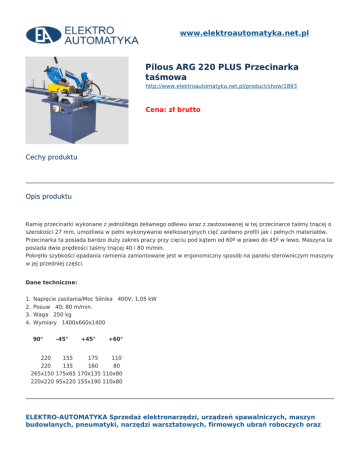 www.elektroautomatyka.net.pl Pilous ARG 220 PLUS Przecinarka taśmowa http://www.elektroautomatyka.net.pl/product/show/1893 Cena: zł brutto Cechy produktu Opis produktu Ramię przecinarki wykonane z jednolitego żeliwnego odlewu wraz z zastosowanej w tej przecinarce taśmy tnącej o szerokości 27 mm. umożliwia w pełni wykonywanie wielkoseryjnych cięć zarówno profili jak i pełnych materiałów. Przecinarka ta posiada bardzo duży zakres pracy przy cięciu pod kątem od 60º w prawo do 45º w lewo. Maszyna ta posiada dwie prędkości taśmy tnącej 40 i 80 m/min. Pokrętło szybkości opadania ramienia zamontowane jest w ergonomiczny sposób na panelu sterowniczym maszyny w jej przedniej części. Dane techniczne: 1. 2. 3. 4. Napięcie zasilania/Moc Silnika 400V, 1,05 kW Posuw 40; 80 m/min. Waga 250 kg Wymiary 1400x660x1400 90° -45° +45° +60° 220 155 175 110 220 135 160 80 265x150 175x65 170x135 110x80 220x220 95x220 155x190 110x80 ELEKTRO-AUTOMATYKA Sprzedaż elektronarzędzi, urządzeń spawalniczych, maszyn budowlanych, pneumatyki, narzędzi warsztatowych, firmowych ubrań roboczych oraz maszyn ogrodowo leśnych. Sklep Bochnia ul. Brzeska 50 32-700 Bochnia Sklep Brzesko ul. Szarych Szeregów 23 32-800 Brzesko Serwis, Magazyn ul. Św. Brata Alberta 4 32-800 Brzesko tel. 691 572 333 e-mail: [email protected] tel. 609 523 230 e-mail: [email protected] tel. 609 523 645 e-mail: [email protected]