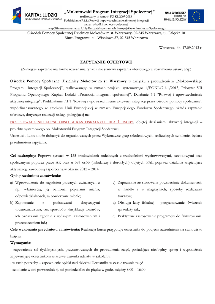 „Mokotowski Program Integracji Społecznej” realizowany w ramach PO KL 2007-2013 Poddziałanie 7.1.1.: Rozwój i upowszechnianie aktywnej integracji przez ośrodki pomocy społecznej współfinansowany przez Unię Europejską w ramach Europejskiego Funduszu Społecznego Ośrodek Pomocy Społecznej Dzielnicy Mokotów m.st. Warszawy, 02-545 Warszawa, ul. Falęcka 10 Biuro Programu: ul. Wiśniowa 37, 02-545 Warszawa Warszawa, dn. 17.09.2013 r. ZAPYTANIE OFERTOWE (Niniejsze zapytanie ma formę rozeznania rynku i nie stanowi zapytania ofertowego w rozumieniu ustawy Pzp) Ośrodek Pomocy Społecznej Dzielnicy Mokotów m st. Warszawy w związku z prowadzeniem „Mokotowskiego Programu Integracji Społecznej”, realizowanego w ramach projektu systemowego 1/POKL/7.1.1/2013, Priorytet VII Programu Operacyjnego Kapitał Ludzki „Promocja integracji społecznej”, Działanie 7.1 "Rozwój i upowszechnienie aktywnej integracji", Poddziałanie 7.1.1 "Rozwój i upowszechnienie aktywnej integracji przez ośrodki pomocy społecznej”, współfinansowanego ze środków Unii Europejskiej w ramach Europejskiego Funduszu Społecznego, składa zapytanie ofertowe, dotyczące realizacji usługi, polegającej na: PRZEPROWADZENIU KURSU OBSŁUGI KAS FISKALNYCH DLA 1 OSOBY, objętej działaniami aktywnej integracji – projektu systemowego pn. Mokotowski Program Integracji Społecznej. Uczestnik kursu może dołączyć do organizowanych przez Wykonawcę grup szkoleniowych, realizujących szkolenie, będące przedmiotem zapytania. Cel nadrzędny: Poprawa sytuacji w 135 środowiskach rodzinnych z trudnościami wychowawczymi, zawodowymi oraz społecznymi poprzez pracę AR oraz u 387 osób (młodzieży i dorosłych) objętych PAL poprzez działania wspierające aktywizację zawodową i społeczną w okresie 2012 – 2014. Opis przedmiotu zamówienia: a) Wprowadzenie do zagadnień prawnych związanych z c) Zapoznanie ze stosowaną powszechnie dokumentacją np. własnością, jej ochroną, pojęciami mienia; w handlu i w magazynach; sposoby rozliczania odpowiedzialnością za powierzone mienie; towarów; b) Zapoznanie z podstawami dotyczącymi towaroznawstwa, tzn. sposobów klasyfikacji towarów, ich oznaczania zgodnie z rodzajem, zastosowaniem i d) Obsługa kasy fiskalnej – programowanie, ćwiczenia sprzedaży itd.; e) Praktyczne zastosowanie programów do fakturowania. przeznaczeniem itd.; Cele wykonania przedmiotu zamówienia: Realizacja kursu przygotuje uczestnika do podjęcia zatrudnienia na stanowisku kasjera. Wymagania: - zapewnienie sal dydaktycznych, przystosowanych do prowadzenia zajęć, posiadające niezbędny sprzęt i wyposażenie zapewniające uczestnikom właściwe warunki udziału w szkoleniu; - w razie potrzeby – zapewnienie opieki nad dziećmi Uczestnika w czasie trwania zajęć - szkolenie w dni powszednie tj. od poniedziałku do piątku w godz. między 8:00 – 16:00 „Mokotowski Program Integracji Społecznej” realizowany w ramach PO KL 2007-2013 Poddziałanie 7.1.1.: Rozwój i upowszechnianie aktywnej integracji przez ośrodki pomocy społecznej współfinansowany przez Unię Europejską w ramach Europejskiego Funduszu Społecznego Ośrodek Pomocy Społecznej Dzielnicy Mokotów m.st. Warszawy, 02-545 Warszawa, ul. Falęcka 10 Biuro Programu: ul. Wiśniowa 37, 02-545 Warszawa - przekazanie Uczestnikowi na własność materiałów szkoleniowych, zawierających minimum: skrypty / podręczniki do nauki, zeszyt w twardej oprawie formatu A-4, długopis oraz harmonogram szkolenia. Po ukończeniu szkolenia Wykonawca wystawi uczestnikowi zaświadczenie o ukończeniu szkolenia i zdobytych kwalifikacjach z rozporządzeniem Ministra Edukacji i Nauki z dnia 3 lutego 2006 r. w sprawie uzyskania i uzupełninia przez osoby dorosłe wiedzy ogólnej, umiejętności i kwalifikacji zawodowych w formie pozaszkolnej. Zajęcia prowadzone będą: - 2 lub 3 razy w tygodniu - Łącznie 30 h Miejsce: Warszawa Wstępny termin zakończenia wykonania przedmiotu umowy: 13.12.2013 r. Termin nadesłania odpowiedzi na zapytanie ofertowe: 25.09.2013 r. Informacja dodatkowa: Do oferty, przedstawionej na załączonym do zapytania wzorze, powinny być załączone: 1. plan pracy / zakres merytoryczny każdego spotkania, 2. koszt przeprowadzenia 1 h zajęć, 3. łączną kwotę realizacji usługi, 4. wykaz osób, które będą uczestniczyć w realizacji usługi posiadających odpowiednie kwalifikacje do jej realizacji wraz z informacjami na temat ich kwalifikacji zawodowych, doświadczenia i wykształcenia niezbędnych do wykonania przedmiotowej usługi, 5. dokument poświadczający uprawnienia do realizowania zajęć. Dane kontaktowe: Ośrodek Pomocy Społecznej Dzielnicy Mokotów m.st. Warszawy, ul. Falęcka 10, 02-545 Warszawa Mokotowski Program Integracji Społecznej, Bartosz Domański – koordynator projektu Tel. (22) 848 09 24 e-mail: [email protected]; o projekcie - www.opsmokotow.ehost.pl „Mokotowski Program Integracji Społecznej” realizowany w ramach PO KL 2007-2013 Poddziałanie 7.1.1.: Rozwój i upowszechnianie aktywnej integracji przez ośrodki pomocy społecznej współfinansowany przez Unię Europejską w ramach Europejskiego Funduszu Społecznego Ośrodek Pomocy Społecznej Dzielnicy Mokotów m.st. Warszawy, 02-545 Warszawa, ul. Falęcka 10 Biuro Programu: ul. Wiśniowa 37, 02-545 Warszawa ___________________________________ (pieczęć z nazwą i adresem Wykonawcy) FORMULARZ OFERTOWY Nazwa Wykonawcy ………………...……………………………………………………………………………………………... Siedziba Wykonawcy ………………………..………………………………………………………………………...……………. ………………………………………………………………...……………………………………………... NIP ……………………………………………… REGON ………………..….……………