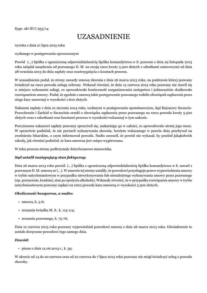 Sygn. akt III C 933/14 UZASADNIENIE wyroku z dnia 21 lipca 2015 roku wydanego w postępowaniu uproszczonym Powód (...) Spółka z ograniczoną odpowiedzialnością Spółka komandytowa w S. pozwem z dnia 29 listopada 2013 roku zażądał zasądzenia od pozwanego D. M. na swoją rzecz kwoty 5.500 złotych z odsetkami ustawowymi od dnia 28 września 2013 do dnia zapłaty oraz rozstrzygnięcia o kosztach procesu. W uzasadnieniu podał, że strony zawarły umowę zlecenia z dnia 26 marca 2013 roku, na podstawie której pozwany świadczył na rzecz powoda usługę ochrony. Wskazał również, że dnia 13 czerwca 2013 roku pozwany nie stawił się w miejscu wykonania usługi, co spowodowało konieczność zorganizowania zastępstwa i jednocześnie skutkowało rozwiązaniem umowy. Podał, że zgodnie z umową takie postępowanie pozwanego rodziło obowiązek zapłacenia przez niego kary umownej w wysokości 1.600 złotych. Nakazem zapłaty z dnia 21 stycznia 2014 roku, wydanym w postępowaniu upominawczym, Sąd Rejonowy SzczecinPrawobrzeże i Zachód w Szczecinie orzekł o obowiązku zapłacenia przez pozwanego na rzecz powoda kwoty 5.500 złotych wraz z odsetkami oraz kosztami procesu w wysokości wskazanej w tym nakazie. Powyższemu nakazowi zapłaty pozwany sprzeciwił się, zaskarżając go w całości, co spowodowało utratę jego mocy. W sprzeciwie podniósł, że nie porzucił wykonywania zlecenia, bowiem wskazanego w pozwie dnia przebywał na zwolnieniu lekarskim, o czym informował powoda. Nadto zarzucił, że powód nie wykazał, by poniósł jakąkolwiek szkodę, jak również podniósł, że kara umowna jest rażąco wygórowana. W toku procesu strony podtrzymały dotychczasowe stanowiska. Sąd ustalił następujący stan faktyczny: Dnia 26 marca 2013 roku powód (...) Spółka z ograniczoną odpowiedzialnością Spółka komandytowa w S. zawarł z pozwanym D. M. umowę nr (...). W umowie tej strony ustaliły, że powodowi przysługuje prawo wypowiedzenia umowy w trybie natychmiastowym w przypadku niewykonywania lub nienależytego wykonywania umowy przez pozwanego (np. porzucenie, kradzież, stan po spożyciu alkoholu). Wskazały również, że w przypadku rozwiązania umowy w trybie natychmiastowym pozwany zapłaci na rzecz powoda karę umowną w wysokości 5.500 złotych. Okoliczność bezsporna, a nadto: • umowa, k. 5-6; • zeznania świadka M. S.. k. 113-114; • zeznania pozwanego, k. 75-76; Dnia 12 czerwca 2013 roku pozwany wypowiedział powodowi umowę z dnia 26 marca 2013 roku. Oświadczenie to zostało doręczone powodowi tego samego dnia. Dowód: • pismo z dnia 12.06.2013 r., k. 59; W okresie od 14 do 20 czerwca oraz od 22 czerwca do 7 lipca 2013 roku pozwany nie mógł świadczyć usług z powodu choroby. Dowód: • zaświadczenia lekarskie, k. 60-62, 72-74; • historia choroby, k. 69-71; Dnia 1 lipca 2013 roku M. S. wniósł do powoda o rozwiązanie umowy z pozwanym bez zachowania okresu wypowiedzenia. Wskazał w nim, że pozwany nie świadczył usług w okresie od 13 czerwca do 3 lipca 2013 roku oraz przedstawił trzy zwolnienia lekarskie oraz nie usprawiedliwił nieobecności 21 czerwca 2013 roku. Następnego dnia powód wypowiedział pozwanemu stosunek zlecenia w trybie natychmiastowym w związku z niewykonaniem umowy poprzez zaprzestanie świadczenia usług bez zachowania wypowiedzenia. Oświadczenie to zostało doręczone pozwanemu dnia 9 lipca 2013 roku. Dowód: • wniosek o rozwiązanie umowy, k. 7; • wypowiedzenie umowy, k. 8-9; • zeznania świadka M. S.. k. 113-114; Pismem z dnia 9 września 2013 roku powód wezwał pozwanego do zapłaty kwoty 5.500 złotych w terminie 14 dni od dnia doręczenia wezwania. Dowód: • wezwanie do zapłaty, k. 10-11; Sąd zważył, co następuje: Powództwo okazało się nieuzasadnione. Zostało oparte na dyspozycji wynikającej z art. 483 § 1 k.c. Zgodnie z jego treścią można zastrzec w umowie, że naprawienie szkody wynikającej z niewykonania lub nienależytego wykonania zobowiązania niepieniężnego nastąpi przez zapłatę określonej sumy. Mając na uwadze powyższe regulacje, powód główny winien był wykazać, że strony zawarły umowę, w której określiły swoje zobowiązania oraz to, że doszło do powstania warunków, których spełnienie powodowało obowiązek pozwanego głównego do zapłaty kary umownej. W przedmiotowej sprawie powód wykazał, że strony zawarły umowę dnia 26 marca 2013 roku. Wbrew jej nazwie umowa ta nie stanowiła zlecenia, której istotnym elementem jest dokonywanie określonych czynności prawnych, lecz umowę o świadczenie usług, do której – zgodnie z treścią art. 750 k.c. – stosuje się odpowiednio przepisy o zleceniu. Powód wykazał także, że strony uzgodniły, że pozwany zapłaci na rzecz powoda karę umowną w razie rozwiązania przez powoda umowy w przypadku niewykonywania lub nienależytego wykonywania umowy przez pozwanego przejawiającej się w szczególności przez porzucenie, kradzież, stan po spożyciu alkoholu, stan nietrzeźwości, stan po zażyciu środków odurzających. Z pisma z dnia 2 lipca 2013 roku wynika, że powód złożył pozwanemu oświadczenie o wypowiedzeniu umowy w tym trybie. Zważyć jednak należy, że zgodnie z treścią art. 483 § 1 k.c. kara umowna należy się w razie niewykonania lub nienależytego wykonania zobowiązania. Oznacza to, że do oceny, czy doszło do niewykonania lub nienależytego wykonania zobowiązania należy stosować normy wynikające z art. 471 i 472 k.c. Wynika z nich, że dłużnik obowiązany jest do naprawienia szkody wynikłej z niewykonania lub nienależytego wykonania zobowiązania, chyba że niewykonanie lub nienależyte wykonanie jest następstwem okoliczności, za które dłużnik odpowiedzialności nie ponosi. Zgodnie zaś z treścią art. 472 k.c. jeżeli ze szczególnego przepisu ustawy albo z czynności prawnej nie wynika nic innego, dłużnik odpowiedzialny jest za niezachowanie należ