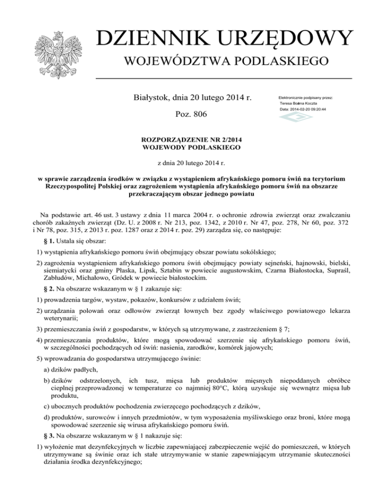 DZIENNIK URZĘDOWY WOJEWÓDZTWA PODLASKIEGO Białystok, dnia 20 lutego 2014 r. Elektronicznie podpisany przez: Teresa Bożena Koczta Poz. 806 Data: 2014-02-20 09:20:44 ROZPORZĄDZENIE NR 2/2014 WOJEWODY PODLASKIEGO z dnia 20 lutego 2014 r. w sprawie zarządzenia środków w związku z wystąpieniem afrykańskiego pomoru świń na terytorium Rzeczypospolitej Polskiej oraz zagrożeniem wystąpienia afrykańskiego pomoru świń na obszarze przekraczającym obszar jednego powiatu Na podstawie art. 46 ust. 3 ustawy z dnia 11 marca 2004 r. o ochronie zdrowia zwierząt oraz zwalczaniu chorób zakaźnych zwierząt (Dz. U. z 2008 r. Nr 213, poz. 1342, z 2010 r. Nr 47, poz. 278, Nr 60, poz. 372 i Nr 78, poz. 315, z 2013 r. poz. 1287 oraz z 2014 r. poz. 29) zarządza się, co następuje: § 1. Ustala się obszar: 1) wystąpienia afrykańskiego pomoru świń obejmujący obszar powiatu sokólskiego; 2) zagrożenia wystąpieniem afrykańskiego pomoru świń obejmujący powiaty sejneński, hajnowski, bielski, siemiatycki oraz gminy Płaska, Lipsk, Sztabin w powiecie augustowskim, Czarna Białostocka, Supraśl, Zabłudów, Michałowo, Gródek w powiecie białostockim. § 2. Na obszarze wskazanym w § 1 zakazuje się: 1) prowadzenia targów, wystaw, pokazów, konkursów z udziałem świń; 2) urządzania polowań oraz odłowów zwierząt łownych bez zgody właściwego powiatowego lekarza weterynarii; 3) przemieszczania świń z gospodarstw, w których są utrzymywane, z zastrzeżeniem § 7; 4) przemieszczania produktów, które mogą spowodować szerzenie się afrykańskiego pomoru świń, w szczególności pochodzących od świń: nasienia, zarodków, komórek jajowych; 5) wprowadzania do gospodarstwa utrzymującego świnie: a) dzików padłych, b) dzików odstrzelonych, ich tusz, mięsa lub produktów mięsnych niepoddanych obróbce cieplnej przeprowadzonej w temperaturze co najmniej 80°C, którą uzyskuje się wewnątrz mięsa lub produktu, c) ubocznych produktów pochodzenia zwierzęcego pochodzących z dzików, d) produktów, surowców i innych przedmiotów, w tym wyposażenia myśliwskiego oraz broni, które mogą spowodować szerzenie się wirusa afrykańskiego pomoru świń. § 3. Na obszarze wskazanym w § 1 nakazuje się: 1) wyłożenie mat dezynfekcyjnych w liczbie zapewniającej zabezpieczenie wejść do pomieszczeń, w których utrzymywane są świnie oraz ich stałe utrzymywanie w stanie zapewniającym utrzymanie skuteczności działania środka dezynfekcyjnego; Dziennik Urzędowy Województwa Podlaskiego –2– Poz. 806 2) trzymanie świń w zamknięciu w pomieszczeniach gospodarskich; 3) bieżące poddawanie oczyszczaniu i dezynfekcji narzędzi oraz sprzętów wykorzystywanych do obsługi świń; 4) zaopatrywanie, z zastrzeżeniem § 6, świń przemieszczanych do rzeźni zgodnie z § 7 w świadectwo zdrowia wystawiane przez organ Inspekcji Weterynaryjnej lub wyznaczonego przez ten organ urzędowego lekarza weterynarii na podstawie art. 16 lub 18 ustawy z dnia 29 stycznia 2004 r. o Inspekcji Weterynaryjnej (Dz. U. z 2010 r. Nr 112, poz. 744 z późn. zm.), które zawiera co najmniej: a) nazwę organu wydającego świadectwo, b) numer świadectwa, c) liczbę świń, d) numery identyfikacyjne świń, e) pochodzenie świń, f) miejsca przeznaczenia świń, g) środek transportu świń i jego numer rejestracyjny, h) poświadczenie o spełnianiu wymagań zdrowotnych dotyczących świń ustalonych w przepisach ustawy z dnia 11 marca 2004 r. o ochronie zdrowia zwierząt oraz zwalczaniu chorób zakaźnych zwierząt i przepisach wykonawczych wydanych na jej podstawie, i) informację o występowaniu choroby Aujeszky’ego w stadzie pochodzenia świń, j) datę, pieczęć i podpis właściwego urzędowego lekarza weterynarii; 5) skarmianie świń paszą zabezpieczoną przed dostępem zwierząt wolno żyjących. § 4. Na obszarze wskazanym w § 1: 1) każdego odstrzelonego dzika niezwłocznie dostarcza się wraz z patrochami i narogami do położonego na obszarze wskazanym w § 1: a) punktu skupu dziczyzny lub zakładu przetwórstwa dziczyzny lub b) innego zakładu nadzorowanego przez organ Inspekcji Weterynaryjnej, w którym mogą być przechowywane tusze i skóry dzików; 2) tusze oraz skóry odstrzelonych dzików mogą być przemieszczane z punktów i zakładów, o których mowa w pkt 1, wyłącznie po otrzymaniu potwierdzenia ujemnego wyniku badania laboratoryjnego w kierunku wykrycia afrykańskiego pomoru świń; 3) padłe świnie mogą być wywożone do zakładów utylizacyjnych po wcześniejszym zgłoszeniu padnięć świń do powiatowego lekarza weterynarii; 4) podmiot, któremu dostarczono odstrzelone dziki jest zobowiązany do zbierania i zagospodarowania ubocznych produktów pochodzenia zwierzęcego, w tym patrochów i narogów, zgodnie z rozporządzeniem Parlamentu Europejskiego i Rady (WE) nr 1069/2009 z dnia 21 października 2009 r. określającym przepisy sanitarne dotyczące produktów ubocznych pochodzenia zwierzęcego, nieprzeznaczonych do spożycia przez ludzi, i uchylającym rozporządzenie (WE) nr 1774/2002 (rozporządzenie o produktach ubocznych pochodzenia zwierzęcego) (Dz. Urz. UE L 300 z 14.11.2009, str. 1 — 33); 5) powiatowy lekarz weterynarii pobiera próby do badań w kierunku wykrycia afrykańskiego pomoru świń, w przypadku: a) zgłoszeń padłych świń przy przekroczeniu odsetka padnięć w stadzie powyżej: prosięta – 20%, warchlaki - 10%, tuczniki - 5%; b) każdego odstrzelonego dzika dostarczonego do punktu skupu dziczyzny lub zakładów, o których mowa w § 4 pkt 1; c) każdego padłego dzika; Dziennik Urzędowy Województwa Podlaskiego –3– Poz. 806 6) wszystkie osoby mające kontakt z dzikami, ich tuszami, skórami lub mięsem oraz produktami mięsnymi niepoddanymi obróbce cieplnej w temperaturze co najmniej 80°C, którą należy uzyskać wewnątrz mięsa lub produktu, muszą przed wejściem do pomieszczeń gospodarskich, w których utrzymywane są