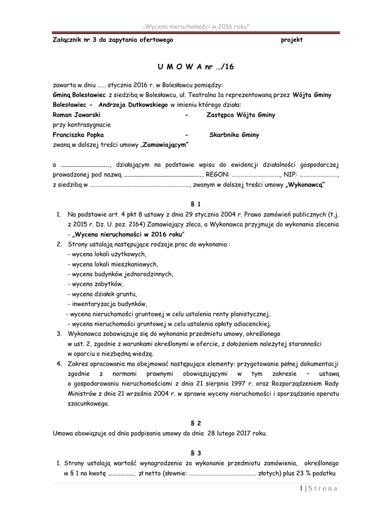 „Wycena nieruchomości w 2016 roku” Załącznik nr 3 do zapytania ofertowego projekt U M O W A nr …/16 zawarta w dniu …… stycznia 2016 r. w Bolesławcu pomiędzy: Gminą Bolesławiec z siedzibą w Bolesławcu, ul. Teatralna 1a reprezentowaną przez Wójta Gminy Bolesławiec - Andrzeja Dutkowskiego w imieniu którego działa: Roman Jaworski - Zastępca Wójta Gminy przy kontrasygnacie Franciszka Popka - Skarbnika Gminy zwaną w dalszej treści umowy „Zamawiającym” a ……………………………., działającym na podstawie wpisu do ewidencji działalności gospodarczej prowadzonej pod nazwą ………………………………………………., REGON: ……………………………., NIP: ………………………, z siedzibą w …………………………………………………………….., zwanym w dalszej treści umowy „Wykonawcą” § 1 1. Na podstawie art. 4 pkt 8 ustawy z dnia 29 stycznia 2004 r. Prawo zamówień publicznych (t.j. z 2015 r. Dz. U. poz. 2164) Zamawiający zleca, a Wykonawca przyjmuje do wykonania zlecenia - „Wycena nieruchomości w 2016 roku” 2. Strony ustalają następujące rodzaje prac do wykonania : - wycena lokali użytkowych, - wycena lokali mieszkaniowych, - wycena budynków jednorodzinnych, - wycena zabytków, - wycena działek gruntu, - inwentaryzacja budynków, - wycena nieruchomości gruntowej w celu ustalenia renty planistycznej, - wycena nieruchomości gruntowej w celu ustalenia opłaty adiacenckiej. 3. Wykonawca zobowiązuje się do wykonania przedmiotu umowy, określonego w ust. 2, zgodnie z warunkami określonymi w ofercie, z dołożeniem należytej staranności w oparciu o niezbędną wiedzę. 4. Zakres opracowania ma obejmować następujące elementy: przygotowanie pełnej dokumentacji zgodnie z normami prawnymi obowiązującymi w tym zakresie – ustawą o gospodarowaniu nieruchomościami z dnia 21 sierpnia 1997 r. oraz Rozporządzeniem Rady Ministrów z dnia 21 września 2004 r. w sprawie wyceny nieruchomości i sporządzania operatu szacunkowego. § 2 Umowa obowiązuje od dnia podpisania umowy do dnia 28 lutego 2017 roku. § 3 1. Strony ustalają wartość wynagrodzenia za wykonanie przedmiotu zamówienia, określonego w § 1 na kwotę ………………. zł netto (słownie: ………………………………………… złotych) plus 23 % podatku 1|Strona „Wycena nieruchomości w 2016 roku” VAT w kwocie …………………………. zł (słownie: …………………………..), to jest ………………………………… zł brutto (słownie: …………………………………………………………………………………………). 2. Ustala się obowiązujące przez cały czas trwania umowy jednostkowe stawki za wykonanie usług w zakresie wycen, zgodnie z poniższą tabelą. Cena jednostkowa netto w zł Cena Jednostkowa brutto w zł Przewidywa na ilość prac Lp Wyszczególnienie 1. Wycena lokalu użytkowego wraz z przynależnościami i udziałem w gruncie, podaniem powierzchni lokalu i rozkładem pomieszczeń 2 2. Wycena 1 lokalu mieszkalnego wraz z przynależnościami i udziałem w gruncie, ze szkicem, podaniem powierzchni lokali i rozkładem pomieszczeń 2 3. Wycena budynku jednorodzinnego wraz z przynależnościami 1 4 Wycena nieruchomości zabudowanej 4 5. Wycena działki gruntu 20 Wycena działek w kompleksie od 3 do 5 dziełek (cena za jedną działkę) 6 7. Wycena działek w kompleksie powyżej 5 dziełek (cena za jedną działkę) 15 8. Inwentaryzacja budynku za 1m2 1000 9. Wycena nieruchomości gruntowej w celu ustalenia opłaty adiacenckiej 3 10 Wycena nieruchomości gruntowej w celu ustalenia renty planistycznej 20 6 Suma X X Cena (netto) danej usługi ogółem VAT Cena ( brutto) danej usługi ogółem X 2|Strona „Wycena nieruchomości w 2016 roku” 3. Zamawiający zastrzega, iż określone w ustępie 2, ilości usług mogą ulec zmianie. 4. Zamawiający każdorazowo będzie zlecał wykonanie określonej wyceny na podstawie zleceń jednostkowych, przyjmując jako podstawę, jednostkowe stawki określone w powyższej tabeli. § 4 1. Termin wykonania poszczególnych prac zostanie określony każdorazowo w zleceniu jednostkowym. 2. Bieg terminu wykonania prac rozpoczyna się od daty otrzymania zlecenia przez Wykonawcę. § 5 1. Podstawą zapłaty wynagrodzenia będzie faktura wystawiona przez Wykonawcę, którego płatność strony ustalają nie później niż 14 dni od daty jej doręczenia Zamawiającemu. 2. W razie opóźnienia w zapłacie Zamawiający zobowiązuje się do zapłaty ustawowych odsetek za opóźnienie. § 6 1. Strony postanawiają, że obowiązującą je formą odszkodowania będą kary umowne. 2. Kary te będą naliczane w następujących wysokościach: 1) Wykonawca zapłaci Zamawiającemu kary umowne a) za zwłokę w wykonywaniu określonego w jednostkowym zleceniu przedmiotu zamówienia w wysokości 0,2 % wynagrodzenia umownego netto jednostkowej stawki, określonej w § 3 ust. 2, za każdy dzień zwłoki; b) za odstąpienie od umowy z przyczyn zależnych od Wykonawcy w wysokości 10 % wynagrodzenia umownego netto, określonego w § 3 ust.1. c) za nienależyte wykonanie określonego w jednostkowym zleceniu przedmiotu zamówienia w wysokości 10 % wynagrodzenia umownego netto jednostkowej stawki, określonej w § 3 ust. 2. 2) z Zamawiający zapłaci przyczyn zależnych Wykonawcy od kary umowne Zamawiającego za wysokości odstąpienie 10 od umowy % wynagrodzenia trzecich wierzytelności umownego netto, określonego w § 3 ust. 1. § 7 Wykonawca nie ma prawa przenosić na rzecz osób wynikających z niniejszej umowy bez zgody Zamawiającego. § 8 Wykonawca ponosi pełną odpowiedzialność za prawidłowość sporządzonej dokumentacji. § 9 Zamawiający ma prawo odstąpić od umowy w przypadku, gdy Wykonawca nie wykonuje należycie swoich obowiązków wynikających z umowy. 3|Strona „Wycena nieruchomości w 2016 roku” § 10 Zmiany post
