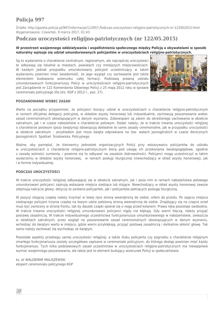 Policja 997 Źródło: http://gazeta.policja.pl/997/informacje/112957,Podczas-uroczystosci-religijno-patriotycznych-nr-122052015.html Wygenerowano: Czwartek, 9 marca 2017, 01:43 Podczas uroczystości religijno-patriotycznych (nr 122/05.2015) W przestrzeń wzajemnego oddziaływania i współistnienia społecznego między Policją a obywatelami w sposób naturalny wpisuje się udział umundurowanych policjantów w uroczystościach religijno-patriotycznych. Są to wydarzenia o charakterze centralnym, regionalnym, ale najczęściej uroczystości te odbywają się lokalnie w miastach, powiatach czy mniejszych miejscowościach. W każdym jednak przypadku umundurowany policjant uczestniczący w takim wydarzeniu powinien mieć świadomość, że jego wygląd czy zachowanie jest także elementem budowania wizerunku całej formacji. Podstawą prawną udziału umundurowanych funkcjonariuszy Policji w uroczystościach religijno-patriotycznych jest Zarządzenie nr 122 Komendanta Głównego Policji z 25 maja 2012 roku w sprawie ceremoniału policyjnego (Dz.Urz. KGP z 2012 r., poz. 27). POSZANOWANIE WOBEC ZASAD Warto na początku przypomnieć, że policjanci biorący udział w uroczystościach o charakterze religijno-patriotycznym w ramach oficjalnej delegacji policyjnej, w składzie asysty honorowej lub indywidualnie, zachowują poszanowanie wobec zasad ceremonialnych obowiązujących w danym wyznaniu. Zobowiązani są zatem do określonego zachowania w obiekcie sakralnym, jak i w czasie nabożeństw o charakterze polowym. Dodać należy, że w trakcie trwania uroczystości religijnej o charakterze polowym (poza świątynią) obowiązują dokładnie te same zasady ceremonialne, jak w przypadku uroczystości w obiekcie sakralnym – przykładem jest msza święta odprawiana na tzw. wałach jasnogórskich w czasie dorocznych Jasnogórskich Spotkań Środowiska Policyjnego. Ważne, aby pamiętać, że kierownicy jednostek organizacyjnych Policji przy wskazywaniu policjantów do udziału w uroczystościach o charakterze religijno-patriotycznym biorą pod uwagę ich przekonania światopoglądowe, zgodnie z zasadą wolności sumienia, i powinno się to odbywać na zasadzie dobrowolności. Policjanci mogą uczestniczyć w takim wydarzeniu w składzie asysty honorowej, w ramach posługi liturgicznej (niewchodzący w skład asysty honorowej), jak i w formie indywidualnej. PODCZAS UROCZYSTOŚCI W trakcie uroczystości religijnej odbywającej się w obiekcie sakralnym, jak i poza nim w ramach nabożeństwa polowego umundurowani policjanci zajmują wskazane miejsca siedzące lub stojące. Niewchodzący w skład asysty honorowej zawsze zdejmują nakrycie głowy; dotyczy to zarówno policjantek, jak i policjantów pełniących posługę liturgiczną. W pozycji stojącej czapkę należy trzymać w lewej ręce stroną wewnętrzną do siebie, orłem do przodu. Po zajęciu miejsca siedzącego policjant trzyma czapkę na lewym udzie położoną stroną wewnętrzną do siebie. Znajdujący się na czapce orzeł musi być zwrócony w stronę frontu, tak by daszek czapki opierał się o nogę przed kolanem. Prawa ręka pozostaje swobodna. W trakcie trwania uroczystości religijnej umundurowani policjanci nigdy nie klękają. Gdy wierni klęczą, należy przyjąć postawę zasadniczą. W trakcie indywidualnego uczestnictwa funkcjonariusza umundurowanego w nabożeństwie, zwłaszcza w obiektach sakralnych, przez wzgląd na poszanowanie zasad ceremonialnych obowiązujących w danym wyznaniu, wchodząc do świątyni warto w miejscu, gdzie wierni przyklękają, przyjąć postawę zasadniczą i delikatnie skłonić głowę. Tak samo należy zachować się wychodząc ze świątyni. Pozostałe aspekty przebiegu samej uroczystości religijnej, a także ślubu policjanta czy pogrzebu o charakterze religijnym zmarłego funkcjonariusza zostały szczegółowo zapisane w ceremoniale policyjnym, do którego dostęp powinien mieć każdy funkcjonariusz. Tych kilka podstawowych zasad uczestnictwa w uroczystościach religijno-patriotycznych ma niewątpliwie wymiar wzajemnego poszanowania, ale także jest to element budujący wizerunek Policji w społeczeństwie. ks. dr WALDEMAR MALISZEWSKI ekspert ceremoniału policyjnego KGP Ocena: 5/5 (1) Data publikacji 03.06.2015