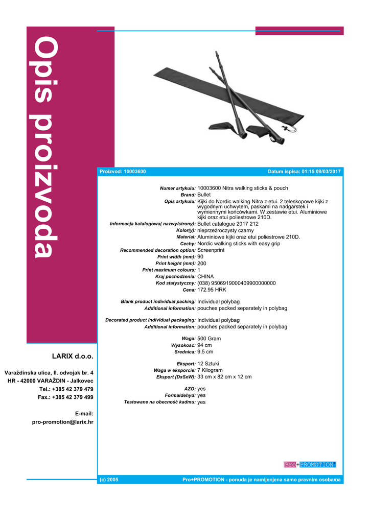 Opis proizvoda Proizvod: 10003600 Datum ispisa: 01:15 09/03/2017 Numer artykulu: 10003600 Nitra walking sticks & pouch Brand: Bullet Opis artykulu: Kijki do Nordic walking Nitra z etui. 2 teleskopowe kijki z Informacja katalogowa( nazwy/strony): Kolor(y): Material: Cechy: Recommended decoration option: Print width (mm): Print height (mm): Print maximum colours: Kraj pochodzenia: Kod statystyczny: Cena: wygodnym uchwytem, paskami na nadgarstek i wymiennymi końcówkami. W zestawie etui. Aluminiowe kijki oraz etui poliestrowe 210D. Bullet catalogue 2017 212 nieprzeźroczysty czarny Aluminiowe kijki oraz etui poliestrowe 210D. Nordic walking sticks with easy grip Screenprint 90 200 1 CHINA (038) 9506919000409900000000 172.95 HRK Blank product individual packing: Individual polybag Additional information: pouches packed separately in polybag Decorated product individual packaging: Individual polybag Additional information: pouches packed separately in polybag Waga: 500 Gram Wysokosc: 94 cm Srednica: 9,5 cm LARIX d.o.o. Eksport: 12 Sztuki Waga w eksporcie: 7 Kilogram Eksport (DxSxW): 33 cm x 82 cm x 12 cm Varaždinska ulica, II. odvojak br. 4 HR - 42000 VARAŽDIN - Jalkovec AZO: yes Formaldehyd: yes Testowane na obecność kadmu: yes Tel.: +385 42 379 479 Fax.: +385 42 379 499 E-mail: [email protected] (c) 2005 Pro+PROMOTION - ponuda je namijenjena samo pravnim osobama