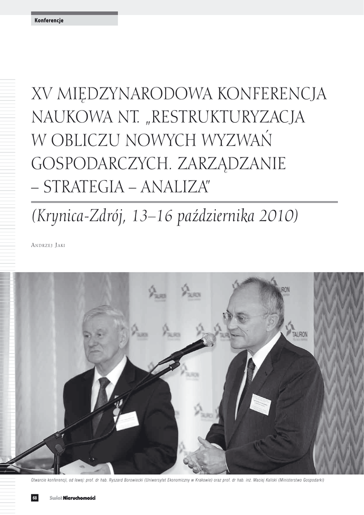 Konferencje XV Międzynarodowa Konferencja Naukowa nt. „Restrukturyzacja w obliczu nowych wyzwań gospodarczych. Zarządzanie – Strategia – Analiza” (Krynica-Zdrój, 13–16 października 2010) Andrzej Jaki Otwarcie konferencji, od lewej: prof. dr hab. Ryszard Borowiecki (Uniwersytet Ekonomiczny w Krakowie) oraz prof. dr hab. inż. Maciej Kaliski (Ministerstwo Gospodarki) 68 Świat Nieruchomości Konferencje W dniach od 13 do 16 października 2010 roku Krynica-Zdrój, już po raz piętnasty, gościła uczestników cyklicznej międzynarodowej konferencji naukowej poświęconej szeroko rozumianej problematyce restrukturyzacji i transformacji gospodarczej. Organizatorzy konferencji: Katedra Ekonomiki i Organizacji Przedsiębiorstw Uniwersytetu Ekonomicznego w Krakowie oraz Fundacja Uniwersytetu Ekonomicznego w Krakowie, poświęcili ją w bieżącym roku nowym wyzwaniom w zakresie zarządzania, restrukturyzacji oraz analizy działalności przedsiębiorstw, implikowanym przez przyczyny i konsekwencje globalnego kryzysu gospodarczego. Wymienione problemy trafnie wpisują się w tytuł konferencji: „Restrukturyzacja w obliczu nowych wyzwań gospodarczych. Zarządzanie – Strategia – Analiza”. Nowe wyzwania z jakimi przychodzi się obecnie zmierzyć przedsiębiorstwom są przy tym z jednej strony determinowane przez naturalne przeobrażenia w funkcjonowaniu współczesnych gospodarek, z drugiej zaś przez nagłe i niespodziewane sytuacje kryzysowe, zakłócające przebieg procesów gospodarczych i stwarzające zagrożenia dla funkcjonowania podmiotów gospodarczych. Procesy globalizacji i postępującej integracji gospodarczej, jak również zapoczątkowany w 2008 roku globalny kryzys gospodarczy zdają się aktualnie stanowić kluczowe wyznaczniki determinujące skuteczność działania i efektywność przedsiębiorstw oraz kierunki doskonalenia systemów zarządzania. Globalny kryzys gospodarczy, którego symbolem stał się upadek banku Lehman Brothers, spowodował konieczność zweryfikowania wielu dotychczasowych paradygmatów nowoczesnego zarządzania. Sytuacja ta stała się doskonałą okazją do udoskonalenia stosowanych dotychczas narzędzi zarządzania, restrukturyzacji i analizy działalności przedsiębiorstw, jak również do poszukiwania nowych rozwiązań w wymienionych obszarach. Doświadczenia kryzysu gospodarczego stanowią obecnie okazję do doskonalenia rozwiązań zarządczych i analitycznych, umożliwiających skuteczne funk- cjonowanie i rozwój przedsiębiorstw w zmienionych uwarunkowaniach zewnętrznych. Obecnie gospodarka ciągle stoi w obliczu niepewności odnośnie kształtowania się najbliższej przyszłości, jak również zakresu działań naprawczych, jakie należy podjąć w celu poprawy obecnej sytuacji oraz zapobieżeniu podobnym zjawiskom w przyszłości. Zadanie to jawi się jako niezwykle trudne, zważywszy na fakt, iż kryzysy stanowią nieunikniony element funkcjonowania gospodarki i pomimo ich regularności, przewidzenie momentu ich pojawienia się, formy i przyczyny, staje się niemożliwe do określenia. Jak zauważył J. M. Keynes: „To, co nieuniknione, nigdy się nie zdarza. Zawsze nadchodzi nieoczekiwane”. Wydaje się więc, iż próby antycypowania kryzysów, są skazane na porażkę, a rolą współczesnego zarządzania jest jedynie szukanie dróg wyjścia z sytuacji powstałych w ich wyniku. Niejako na przekór tej tezie, ambicją tegorocznej konferencji było zmierzenie się z wyzwaniami wynikającymi z obecnej rzeczywistości gospodarczej, zarówno w zakresie przewidywania zagrożeń, kompleksowej diagnozy sytuacji, jak również zdefiniowania optymalnych rozwiązań w sferze zarządzania, formułowania i implementacji strategii oraz analizy uzyskanych efektów. Wyjątkowość tegorocznej konferencji wynika z faktu, że odbyła się ona w roku Jubileuszu 85-lecia Uniwersytetu Ekonomicznego w Krakowie i została wpisana w cykl przedsięwzięć uświetniających ten jubileusz. Z tej racji Honorowy Patronat na obradami konferencji objęli: Wiceprezes Rady Ministrów, Minister Gospodarki – Waldemar Pawlak, Prezydent Miasta Krakowa – Jacek M. Majchrowski, Burmistrz Krynicy-Zdroju – Emil Bodziony oraz Komitet Nauk Organizacji i Zarządzania PAN, natomiast Honorowym Patronem połączonego z konferencją Konkursu o Nagrodę „Lidera Restrukturyzacji” była Małopolska Agencja Rozwoju Regionalnego SA. W konferencji udział wzięło blisko 170 osób reprezentujących wszystkie krajowe ośrodki naukowe – w tym uczelnie ekonomiczne, wydziały nauk ekonomicznych i zarządzania uniwersytetów oraz uczelni technicznych, zagraniczne ośrodki naukowe z Ukrainy (Kijowski Narodowy Uniwersytet Handlu i Ekonomii, Uniwersytet Bankowości Narodowego Banku Ukrainy w Kijowie, Tarnopolski Instytut Technologii Społecznych i Informacyjnych), Włoch (Uniwersytet w Mesynie), Francji (Uniwersytet Paryski na Sorbonie) oraz Czech (Uniwersytet Ekonomiczny w Pradze), a także liczne grono przedstawicieli praktyki gospodarczej oraz administracji rządowej i samorządowej. Obrady konferencji otworzył prof. dr hab. Ryszard Borowiecki – kierownik Katedry Ekonomiki i Organizacji Przedsiębiorstw Uniwersytetu Ekonomicznego w Krakowie, który dziękując wszystkim za przyjęcie zaproszenia i przybycie na konferencję, powitał w pierwszej kolejności Honorowych Gości konferencji: Dyrektora Departamentu Ropy i Gazu Ministerstwa Gospodarki – prof. dr. hab. inż. Macieja Kaliskiego, Burmistrza Krynicy-Zdroju – Emila Bodzionego, Głównego Ekonomistę Raiffeisen Bank Polska, Członka Rady Gospodarczej przy Prezesie Rady Ministrów RP – Jacka Wiśniewskiego, Prorektora Uniwersytetu Ekonomicznego w Krakowie – prof. dr. hab. inż. Andrzeja Chochoła, Dziekana Wydziału Zarządzania Uniwersytetu Ekonomicznego w Krakowie – prof. dr. hab. Pawła Lulę oraz Prezesa Zarządu Enion Energia – Ireneusza Perkowskiego, reprezentującego Generalnego Spons