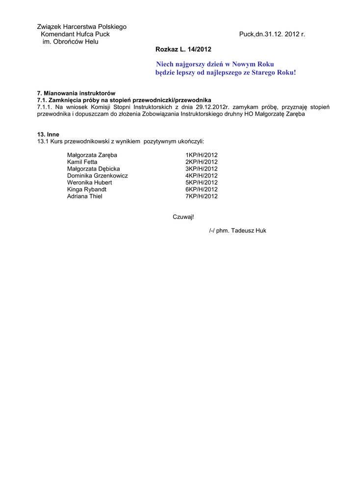 Związek Harcerstwa Polskiego Komendant Hufca Puck im. Obrońców Helu Puck,dn.31.12. 2012 r. Rozkaz L. 14/2012 Niech najgorszy dzień w Nowym Roku będzie lepszy od najlepszego ze Starego Roku! 7. Mianowania instruktorów 7.1. Zamknięcia próby na stopień przewodniczki/przewodnika 7.1.1. Na wniosek Komisji Stopni Instruktorskich z dnia 29.12.2012r. zamykam próbę, przyznaję stopień przewodnika i dopuszczam do złożenia Zobowiązania Instruktorskiego druhny HO Małgorzatę Zaręba 13. Inne 13.1 Kurs przewodnikowski z wynikiem pozytywnym ukończyli: Małgorzata Zaręba Kamil Fetta Małgorzata Dębicka Dominika Grzenkowicz Weronika Hubert Kinga Rybandt Adriana Thiel 1KP/H/2012 2KP/H/2012 3KP/H/2012 4KP/H/2012 5KP/H/2012 6KP/H/2012 7KP/H/2012 Czuwaj! /-/ phm. Tadeusz Huk