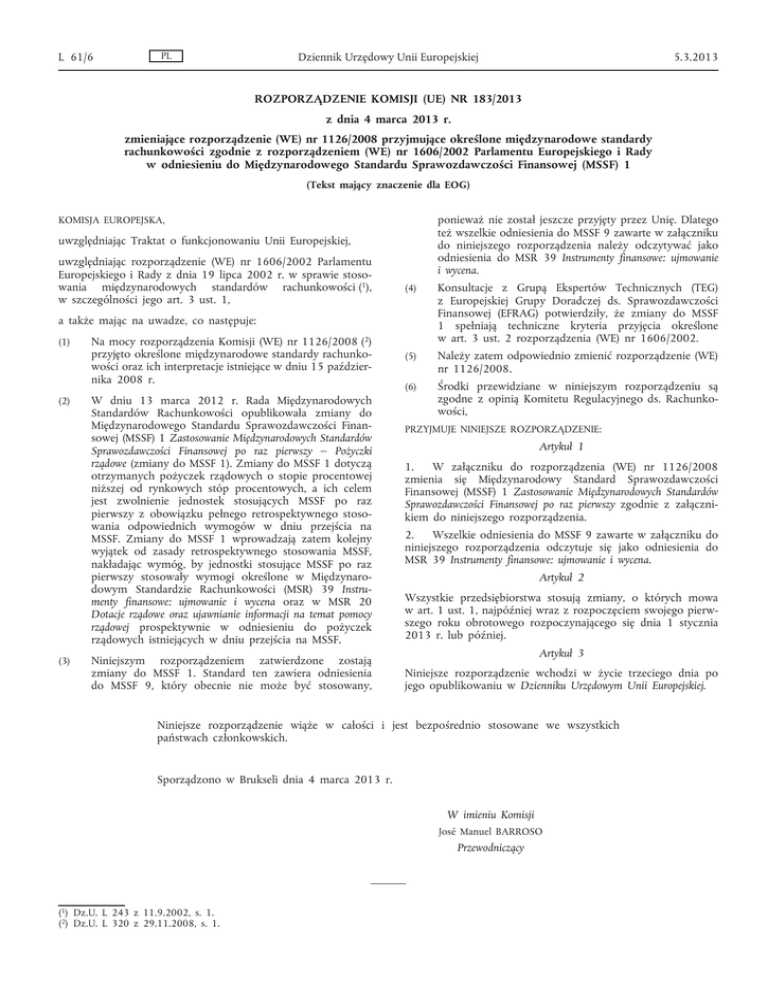 L 61/6 PL Dziennik Urzędowy Unii Europejskiej 5.3.2013 ROZPORZĄDZENIE KOMISJI (UE) NR 183/2013 z dnia 4 marca 2013 r. zmieniające rozporządzenie (WE) nr 1126/2008 przyjmujące określone międzynarodowe standardy rachunkowości zgodnie z rozporządzeniem (WE) nr 1606/2002 Parlamentu Europejskiego i Rady w odniesieniu do Międzynarodowego Standardu Sprawozdawczości Finansowej (MSSF) 1 (Tekst mający znaczenie dla EOG) ponieważ nie został jeszcze przyjęty przez Unię. Dlatego też wszelkie odniesienia do MSSF 9 zawarte w załączniku do niniejszego rozporządzenia należy odczytywać jako odniesienia do MSR 39 Instrumenty finansowe: ujmowanie i wycena. KOMISJA EUROPEJSKA, uwzględniając Traktat o funkcjonowaniu Unii Europejskiej, uwzględniając rozporządzenie (WE) nr 1606/2002 Parlamentu Europejskiego i Rady z dnia 19 lipca 2002 r. w sprawie stoso wania międzynarodowych standardów rachunkowości (1), w szczególności jego art. 3 ust. 1, (4) Konsultacje z Grupą Ekspertów Technicznych (TEG) z Europejskiej Grupy Doradczej ds. Sprawozdawczości Finansowej (EFRAG) potwierdziły, że zmiany do MSSF 1 spełniają techniczne kryteria przyjęcia określone w art. 3 ust. 2 rozporządzenia (WE) nr 1606/2002. (5) Należy zatem odpowiednio zmienić rozporządzenie (WE) nr 1126/2008. (6) Środki przewidziane w niniejszym rozporządzeniu są zgodne z opinią Komitetu Regulacyjnego ds. Rachunko wości, a także mając na uwadze, co następuje: (1) (2) (3) Na mocy rozporządzenia Komisji (WE) nr 1126/2008 (2) przyjęto określone międzynarodowe standardy rachunko wości oraz ich interpretacje istniejące w dniu 15 paździer nika 2008 r. W dniu 13 marca 2012 r. Rada Międzynarodowych Standardów Rachunkowości opublikowała zmiany do Międzynarodowego Standardu Sprawozdawczości Finan sowej (MSSF) 1 Zastosowanie Międzynarodowych Standardów Sprawozdawczości Finansowej po raz pierwszy – Pożyczki rządowe (zmiany do MSSF 1). Zmiany do MSSF 1 dotyczą otrzymanych pożyczek rządowych o stopie procentowej niższej od rynkowych stóp procentowych, a ich celem jest zwolnienie jednostek stosujących MSSF po raz pierwszy z obowiązku pełnego retrospektywnego stoso wania odpowiednich wymogów w dniu przejścia na MSSF. Zmiany do MSSF 1 wprowadzają zatem kolejny wyjątek od zasady retrospektywnego stosowania MSSF, nakładając wymóg, by jednostki stosujące MSSF po raz pierwszy stosowały wymogi określone w Międzynaro dowym Standardzie Rachunkowości (MSR) 39 Instru menty finansowe: ujmowanie i wycena oraz w MSR 20 Dotacje rządowe oraz ujawnianie informacji na temat pomocy rządowej prospektywnie w odniesieniu do pożyczek rządowych istniejących w dniu przejścia na MSSF. Niniejszym rozporządzeniem zatwierdzone zostają zmiany do MSSF 1. Standard ten zawiera odniesienia do MSSF 9, który obecnie nie może być stosowany, PRZYJMUJE NINIEJSZE ROZPORZĄDZENIE: Artykuł 1 1. W załączniku do rozporządzenia (WE) nr 1126/2008 zmienia się Międzynarodowy Standard Sprawozdawczości Finansowej (MSSF) 1 Zastosowanie Międzynarodowych Standardów Sprawozdawczości Finansowej po raz pierwszy zgodnie z załączni kiem do niniejszego rozporządzenia. 2. Wszelkie odniesienia do MSSF 9 zawarte w załączniku do niniejszego rozporządzenia odczytuje się jako odniesienia do MSR 39 Instrumenty finansowe: ujmowanie i wycena. Artykuł 2 Wszystkie przedsiębiorstwa stosują zmiany, o których mowa w art. 1 ust. 1, najpóźniej wraz z rozpoczęciem swojego pierw szego roku obrotowego rozpoczynającego się dnia 1 stycznia 2013 r. lub później. Artykuł 3 Niniejsze rozporządzenie wchodzi w życie trzeciego dnia po jego opublikowaniu w Dzienniku Urzędowym Unii Europejskiej. Niniejsze rozporządzenie wiąże w całości i jest bezpośrednio stosowane we wszystkich państwach członkowskich. Sporządzono w Brukseli dnia 4 marca 2013 r. W imieniu Komisji José Manuel BARROSO Przewodniczący (1) Dz.U. L 243 z 11.9.2002, s. 1. (2) Dz.U. L 320 z 29.11.2008, s. 1. PL 5.3.2013 Dziennik Urzędowy Unii Europejskiej ZAŁĄCZNIK MIĘDZYNARODOWE STANDARDY RACHUNKOWOŚCI MSSF 1 MSSF 1 Zastosowanie Międzynarodowych Standardów Sprawozdawczości Finansowej po raz pierwszy – Pożyczki rządowe „Powielanie dozwolone w obrębie Europejskiego Obszaru Gospodarczego. Wszystkie istniejące prawa są zastrzeżone poza EOG, z wyjątkiem prawa do powielania na użytek własny lub w innych uczciwych celach. Więcej informacji można uzyskać na stronie RMSR www.iasb.org” L 61/7 PL L 61/8 Dziennik Urzędowy Unii Europejskiej Zmiany do MSSF 1 Zastosowanie Międzynarodowych Standardów Sprawozdawczości Finansowej po raz pierwszy Pożyczki rządowe Dodaje się paragrafy 39N i 39O oraz zmienia się paragraf B1. 39N Zgodnie z dokumentem Pożyczki rządowe (zmiany do MSSF 1), wydanym w marcu 2012 r., dodano paragraf B1 pkt f) oraz paragrafy B10-B12. Jednostka stosuje te paragrafy w odniesieniu do okresów rocznych rozpoczynających się 1 stycznia 2013 r. i później. Wcześniejsze zastosowanie jest dozwolone. 39O Paragrafy B10 i B11 odnoszą się do MSSF 9. Jeżeli jednostka stosuje niniejszy MSSF, lecz nie stosuje jeszcze MSSF 9, wszelkie odniesienia w paragrafach B10 i B11 do MSSF 9 należy rozumieć jako odniesienia do MSR 39 Instrumenty finansowe: ujmowanie i wycena. B1 Jednostka stosuje następujące wyjątki: (a) usuwanie z bilansu aktywów finansowych i zobowiązań finansowych (paragrafy B2 i B3); (b) rachunkowość zabezpieczeń (paragrafy B4-B6); (c) udziały niekontrolujące (paragraf B7); (d) klasyfikacja i wycena aktywów finansowych (paragraf B8); (e) wbudowane instrumenty pochodne (paragraf B9) oraz (f) pożyczki rządowe (paragrafy B10-B12). Po paragrafie B9 dodaje się nagłówek i paragrafy B10–B12. Pożyczki rządowe B10 Jednostka stosująca MSSF po raz pierwszy klasyfikuje wszystkie otrzymane pożyczki rządowe otrzymane jako zobowiązanie finansowe lub instrument kapitałowy zgodnie z MSR 32 Instrumenty fi