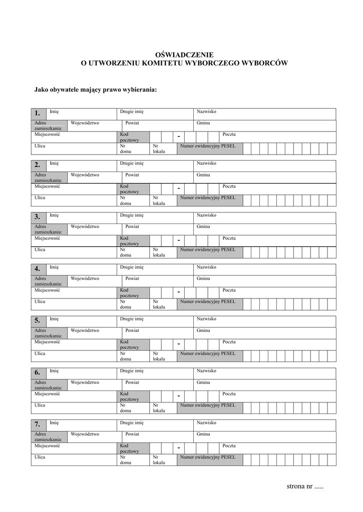OŚWIADCZENIE O UTWORZENIU KOMITETU WYBORCZEGO WYBORCÓW Jako obywatele mający prawo wybierania: 1. Imię Adres zamieszkania: Miejscowość Drugie imię Województwo 2. Imię Adres zamieszkania: Miejscowość Województwo Imię Adres zamieszkania: Miejscowość Województwo Województwo Imię Adres zamieszkania: Miejscowość Województwo Ulica Nazwisko Gmina Nr lokalu Numer ewidencyjny PESEL Nazwisko Gmina Nr lokalu Numer ewidencyjny PESEL Nazwisko Gmina Poczta Nr lokalu Numer ewidencyjny PESEL Nazwisko Gmina Poczta Nr lokalu Numer ewidencyjny PESEL Nazwisko Powiat Kod pocztowy Nr domu Poczta - Drugie imię Województwo Poczta - Powiat Kod pocztowy Nr domu Imię Adres zamieszkania: Miejscowość Numer ewidencyjny PESEL Drugie imię Ulica 7. Nr lokalu Powiat Kod pocztowy Nr domu Poczta - Drugie imię Ulica 6. Gmina Powiat Kod pocztowy Nr domu Imię Adres zamieszkania: Miejscowość Nazwisko Drugie imię Ulica 5. Numer ewidencyjny PESEL Powiat Kod pocztowy Nr domu Ulica 4. Nr lokalu Drugie imię Województwo Poczta - Powiat Kod pocztowy Nr domu Imię Adres zamieszkania: Miejscowość Gmina Drugie imię Ulica 3. Powiat Kod pocztowy Nr domu Ulica Nazwisko Gmina Nr lokalu Poczta Numer ewidencyjny PESEL strona nr ..... 8. Imię Adres zamieszkania: Miejscowość Drugie imię Województwo 9. Imię Adres zamieszkania: Miejscowość Województwo Imię Adres zamieszkania: Miejscowość Województwo Województwo Imię Adres zamieszkania: Miejscowość Województwo Województwo Ulica Nr lokalu Numer ewidencyjny PESEL Nazwisko Gmina Nr lokalu Numer ewidencyjny PESEL Nazwisko Gmina Poczta Nr lokalu Numer ewidencyjny PESEL Nazwisko Gmina Poczta Nr lokalu Numer ewidencyjny PESEL Nazwisko Gmina Poczta Nr lokalu Numer ewidencyjny PESEL Nazwisko Powiat Kod pocztowy Nr domu Poczta - Drugie imię Województwo Poczta - Powiat Kod pocztowy Nr domu Imię Adres zamieszkania: Miejscowość Gmina Drugie imię Ulica 15. Nazwisko Powiat Kod pocztowy Nr domu Imię Adres zamieszkania: Miejscowość Numer ewidencyjny PESEL Drugie imię Ulica 14. Nr lokalu Powiat Kod pocztowy Nr domu Poczta - Drugie imię Ulica 13. Gmina Powiat Kod pocztowy Nr domu Imię Adres zamieszkania: Miejscowość Nazwisko Drugie imię Ulica 12. Numer ewidencyjny PESEL Powiat Kod pocztowy Nr domu Ulica 11. Nr lokalu Drugie imię Województwo Poczta - Powiat Kod pocztowy Nr domu Imię Adres zamieszkania: Miejscowość Gmina Drugie imię Ulica 10. Powiat Kod pocztowy Nr domu Ulica Nazwisko Gmina Nr lokalu Poczta Numer ewidencyjny PESEL strona nr ..... Imię ... Adres zamieszkania: Miejscowość Drugie imię Województwo Nazwisko Powiat Gmina Kod pocztowy Nr domu Ulica Poczta Nr lokalu Numer ewidencyjny PESEL oświadczamy, że tworzymy Komitet Wyborczy Wyborców w celu zgłoszenia kandydata na senatora w wyborach uzupełniających do Senatu Rzeczypospolitej Polskiej w okręgu wyborczym nr 59, zarządzonych na dzień 6 marca 2016 r. Nazwa komitetu wyborczego Uwaga! Nazwa komitetu wyborczego wyborców zawiera wyrazy „Komitet Wyborczy Wyborców” oraz nazwę komitetu wyborczego lub skrót jego nazwy odróżniające się wyraźnie od nazw i skrótów nazw innych komitetów wyborczych. Nazwa i skrót nazwy komitetu wyborczego wyborców muszą być różne od nazw lub skrótu nazw partii politycznych lub organizacji, wpisanych odpowiednio do ewidencji lub rejestru, prowadzonych przez właściwy organ. Skrót nazwy komitetu wyborczego Uwaga! Skrót nazwy komitetu wyborczego może składać się z nie więcej niż 45 znaków drukarskich, wliczając spacje Adres siedziby komitetu wyborczego Województwo Powiat Ulica Nr domu Miejscowość Gmina Nr lokalu Poczta Kod pocztowy - Spośród osób wchodzących w skład komitetu wyborczego Na pełnomocnika wyborczego komitetu wyborczego wyborców powołano Imię Drugie imię Nazwisko Numer ewidencyjny PESEL Na pełnomocnika finansowego komitetu wyborczego wyborców powołano Imię Drugie imię Nazwisko Numer ewidencyjny PESEL Podpisy członków komitetu wyborczego wyborców L.p. 1 Imię - imiona Nazwisko Podpis 2 3 4 1. 2. 3. 4. 5. strona nr ..... 1 2 3 4 6. 7. 8. 9. 10. 11. 12. 13. 14. 15. ... ..............................................................., dnia ....................................................20..... r. (miejscowość) strona nr .....