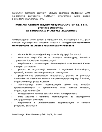 KONTAKT Centrum Języków Obcych zaprasza studentów UAM na praktyki zawodowe. KONTAKT gwarantuje wiele zadań z dziedziny marketingu i PR. KONTAKT Centrum Języków ObcychEDUSYSTEM Sp. z o.o. przyjmie studentów na STUDENCKIE PRAKTYKI ZAWODOWE Gwarantujemy wiele zadań z dziedziny PR, marketingu i in., przy których wykorzystana zostanie wiedza i umiejętności studentów Uniwersytetu im. Adama Mickiewicza w Poznaniu • • • • • • • • • działania PR promujące ideę uczenia się języków obcych tworzenie artykułów PR o tematyce edukacyjnej, kontakty z gazetami i portalami internetowymi współpraca z uczelnianymi Samorządami oraz Biurami Karier i innymi partnerami pomoc w organizacji eventów i wydarzeń kulturalnych, spotkań, wystaw oraz ich promocja i obsługa PR pozyskiwanie patronatów medialnych, pomoc w promocji i obsłudze PR Festiwalu Kultury Hiszpańskojęzycznej ¿QUÉ PASA?, organizowanego przez KONTAKT administracja stron internetowych szkoły oraz mediów społecznościowych – opracowanie i/lub korekta tekstów, organizacja konkursów redagowanie i korekta tekstów, ofert, korespondencji inne zadania i działania marketingowe, ze szczególnym uwzględnieniem Internetu współpraca z uniwersytetami zagranicznymi w ramach programu Erasmus+ Lokalizacja: Plac Bernardyński 1a/1, Poznań Godziny pracy szkoły: 9:00-20:30 Praktyka ma charakter bezpłatny MoŜliwość uzyskania Referencji ze szkołą, po ukończeniu praktyki www.kontakt.cjo.pl www.kontaktespanol.pl Osoba do kontaktu: Aleksandra Pacyńska 662 958 944; [email protected] i podjęcia dalszej współpracy