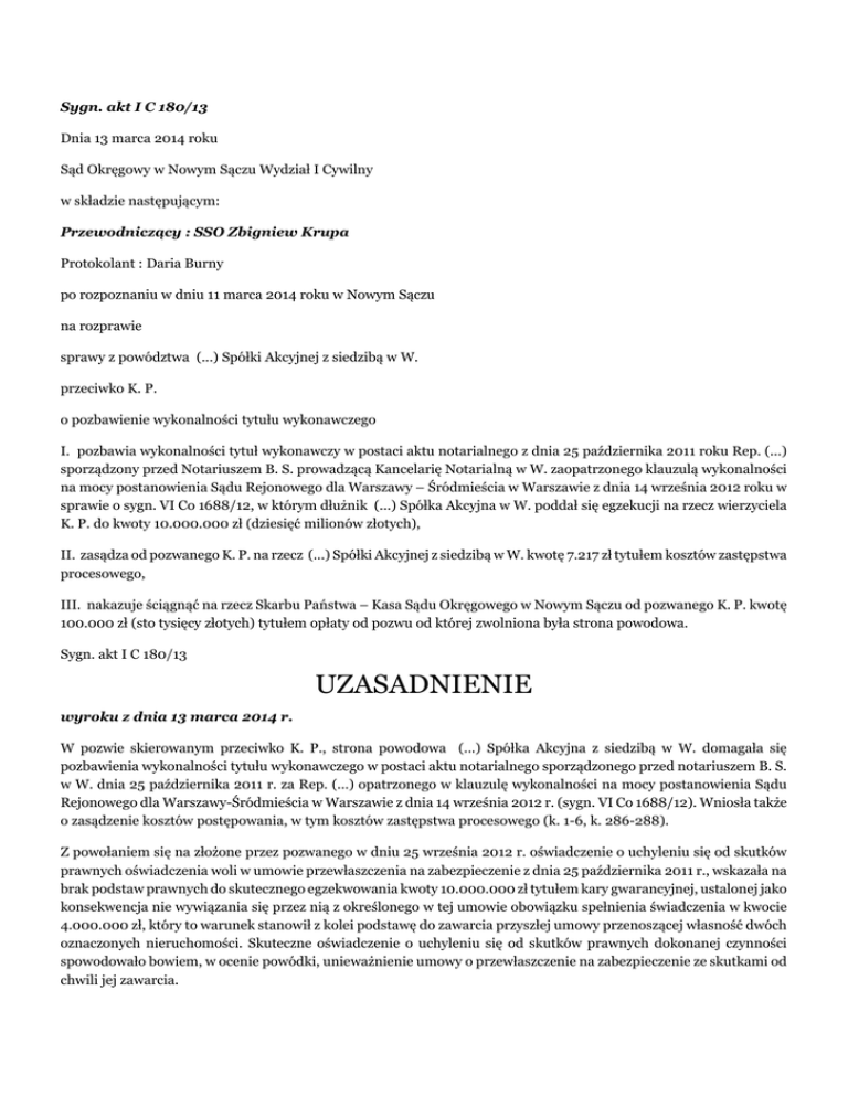 Sygn. akt I C 180/13 Dnia 13 marca 2014 roku Sąd Okręgowy w Nowym Sączu Wydział I Cywilny w składzie następującym: Przewodniczący : SSO Zbigniew Krupa Protokolant : Daria Burny po rozpoznaniu w dniu 11 marca 2014 roku w Nowym Sączu na rozprawie sprawy z powództwa (...) Spółki Akcyjnej z siedzibą w W. przeciwko K. P. o pozbawienie wykonalności tytułu wykonawczego I. pozbawia wykonalności tytuł wykonawczy w postaci aktu notarialnego z dnia 25 października 2011 roku Rep. (...) sporządzony przed Notariuszem B. S. prowadzącą Kancelarię Notarialną w W. zaopatrzonego klauzulą wykonalności na mocy postanowienia Sądu Rejonowego dla Warszawy – Śródmieścia w Warszawie z dnia 14 września 2012 roku w sprawie o sygn. VI Co 1688/12, w którym dłużnik (...) Spółka Akcyjna w W. poddał się egzekucji na rzecz wierzyciela K. P. do kwoty 10.000.000 zł (dziesięć milionów złotych), II. zasądza od pozwanego K. P. na rzecz (...) Spółki Akcyjnej z siedzibą w W. kwotę 7.217 zł tytułem kosztów zastępstwa procesowego, III. nakazuje ściągnąć na rzecz Skarbu Państwa – Kasa Sądu Okręgowego w Nowym Sączu od pozwanego K. P. kwotę 100.000 zł (sto tysięcy złotych) tytułem opłaty od pozwu od której zwolniona była strona powodowa. Sygn. akt I C 180/13 UZASADNIENIE wyroku z dnia 13 marca 2014 r. W pozwie skierowanym przeciwko K. P., strona powodowa (...) Spółka Akcyjna z siedzibą w W. domagała się pozbawienia wykonalności tytułu wykonawczego w postaci aktu notarialnego sporządzonego przed notariuszem B. S. w W. dnia 25 października 2011 r. za Rep. (...) opatrzonego w klauzulę wykonalności na mocy postanowienia Sądu Rejonowego dla Warszawy-Śródmieścia w Warszawie z dnia 14 września 2012 r. (sygn. VI Co 1688/12). Wniosła także o zasądzenie kosztów postępowania, w tym kosztów zastępstwa procesowego (k. 1-6, k. 286-288). Z powołaniem się na złożone przez pozwanego w dniu 25 września 2012 r. oświadczenie o uchyleniu się od skutków prawnych oświadczenia woli w umowie przewłaszczenia na zabezpieczenie z dnia 25 października 2011 r., wskazała na brak podstaw prawnych do skutecznego egzekwowania kwoty 10.000.000 zł tytułem kary gwarancyjnej, ustalonej jako konsekwencja nie wywiązania się przez nią z określonego w tej umowie obowiązku spełnienia świadczenia w kwocie 4.000.000 zł, który to warunek stanowił z kolei podstawę do zawarcia przyszłej umowy przenoszącej własność dwóch oznaczonych nieruchomości. Skuteczne oświadczenie o uchyleniu się od skutków prawnych dokonanej czynności spowodowało bowiem, w ocenie powódki, unieważnienie umowy o przewłaszczenie na zabezpieczenie ze skutkami od chwili jej zawarcia. Pozwany K. P. wniósł o oddalenie powództwa oraz zasądzenie kosztów postępowania. W uzasadnieniu wskazał, iż kwestionowana umowa przewłaszczenia na zabezpieczenie stanowiła konsekwencję dokonania przez powodową spółkę zapłaty przeważającej części ceny jej akcjami nowej emisji - z zapewnieniem, iż akcje te zostaną niezwłocznie dopuszczone do obrotu giełdowego, a tym samym będzie mógł on swobodnie nimi dysponować. Przewłaszczenie przedmiotowych nieruchomości miało równocześnie doprowadzić do pozyskania przez powódkę środków niezbędnych do sfinansowania ich zakupu. Ostatecznie, w związku z brakiem zapłaty kwoty 4.000.000 zł, oświadczeniem z dnia 2 lipca 2012 r. pozwany dokonał odstąpienia od umowy przedwstępnej, również z tego względu, iż przedstawiciele powódki opóźniali procedurę dopuszczenia objętych przez niego akcji do obrotu giełdowego, co odbyło się ostatecznie w sierpniu 2012 r. po znacznie zaniżonej cenie 2 zł za jedną akcję. Podał, iż przedstawiciele powódki mieli pełną świadomość kondycji finansowej firmy, w tym tego, że nie będzie ona w stanie zrealizować umowy z pozwanym, stąd też oświadczeniem z dnia 25 września 2012 r. uchylił się od skutków prawnych oświadczeń woli w przedmiocie przeniesienia na spółkę (...) Spółka z o.o. własności dwóch nieruchomości. Okoliczności te przemawiały zdaniem pozwanego, za uznaniem roszczenia powódki za sprzeczne z zasadami współżycia społecznego. Wskazał również, iż złożone przez niego oświadczenie o uchyleniu się od skutków prawnych oświadczeń woli w przedmiocie przewłaszczenia na zabezpieczenie na rzecz spółki (...) stanowiło w istocie trójstronne porozumienie pomiędzy wymienioną spółką, spółką powodową i nim samym, kreujące szereg niezależnych od siebie stosunków prawnych, a jego oświadczenie w przedmiocie uchylenia się od skutków prawnych oświadczenia woli dotyczyło jedynie oświadczeń dotyczących przeniesienia na rzecz spółki (...) własności nieruchomości; pozostałe postanowienia pozostały w mocy, w tym postanowienie zastrzegające karę gwarancyjną (k. 131-140). W zakresie istotnym dla rozstrzygnięcia, Sąd ustalił następujący stan faktyczny: W dniu 21 września 2011 r. przed notariuszem B. S., K. P. jako sprzedający, i (...) S.A. z siedzibą w W. jako kupująca, zawarły przedwstępną umowę sprzedaży nieruchomości położonych w miejscowości Ł., w tym nieruchomości utworzonej z działek ew. nr (...), objętej księgą wieczystą nr (...) prowadzoną przez Sąd Rejonowy w N. Wydział Ksiąg Wieczystych (Nieruchomość 1) oraz nieruchomości utworzonej z działek ew. o nr (...), (...) oraz działek ew. nr (...), objętej księgą wieczystą nr (...) prowadzoną przez Sąd Rejonowy wN. Wydział Ksiąg Wieczystych (Nieruchomość 2) - za łączną cenę 18.000.000 zł (§ 4 ust. 1 umowy), ewentualnie niższą odpowiadającą kwocie 15.000.000 zł - gdy do 15 lutego 2014 r. nie zostanie uchwalony miejscowy plan zagospodarowania przestrzennego, zaś 14.000.000 zł, gdy nie zostanie w tym terminie uchwalone studium zagospodarowania przestrzennego. Równocześnie strony ustaliły, iż umowa przyrzeczona zawarta