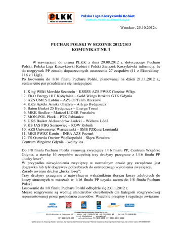 Wrocław, 25.10.2012r. PUCHAR POLSKI W SEZONIE 2012/2013 KOMUNIKAT NR 1 W nawiązaniu do pisma PLKK z dnia 29.08.2012 r. dotyczącego Pucharu Polski, Polska Liga Koszykówki Kobiet i Polski Związek Koszykówki informują, że do rozgrywek PP zostało dopuszczonych ostatecznie 27 zespołów (11 z Ekstraklasy i 16 z I Ligi). Po losowaniu do 1/16 finału Pucharu Polski, planowanej na dzień 21.11.2012 r., zestawienie par przedstawia się następująco: 1. King Wilki Morskie Szczecin – KSSSE AZS PWSZ Gorzów Wlkp. 2. EKO Energy HIT Kobylnica – Gold Wings Brokers GTK Gdynia 3. AZS UMCS Lublin – AZS OPTeam Rzeszów 4. KKS Apteki Arnika Olsztyn – Artego Bydgoszcz 5. Baton Basket 25 Bydgoszcz – Energa Toruń 6. MKK Siedlce – Matizol LIDER Pruszków 7. MON-POL Płock – PTK Pabianice 8. UKS Basket Aleksandrów Łódzki – Widzew Łódź 9. KS JAS FBG Sosnowiec – ROW Rybnik 10. AZS Uniwersytet Warszawski – SMS PZKosz Łomianki 11. MKS PWSZ Konin – INEA AZS Poznań 12. TS Ostrovia Ostrów Wielkopolski – Ślęza Wrocław Centrum Wzgórze Gdynia – wolny los Do 1/8 finału Pucharu Polski awansują zwycięzcy 1/16 finału PP, Centrum Wzgórze Gdynia, a stawkę 16 zespołów uzupełnią trzy drużyny przegrane z 1/16 finału PP „lucky loser”. W przypadku niewyłonienia zwycięzcy w normalnym czasie gry zarządzana jest dogrywka lub tyle dogrywek potrzebnych do ostatecznego wyłonienia zwycięzcy. Zasady awansu drużyn „lucky loser”: Trzy drużyny przegrane z najwyższym wskaźnikiem ilorazu koszy zdobytych do koszy straconych w meczach w 1/16 finału PP uzyska awans do 1/8 finału Pucharu Polski. Losowanie do 1/8 finału Pucharu Polski odbędzie się 23.11.2012 r. Mecze rozgrywane są według standardów określonych dla kategorii rozgrywkowej reprezentowanej przez gospodarza zawodów. Wszelkie przepisy i regulacje związane z drużynami obowiązują jak w rozgrywkach ligowych poszczególnych szczebli (dla I Ligi RWS PZKosz, dla Ekstraklasy Regulamin PLKK). Gospodarzy meczów prosimy o powiadomienie drużyny przeciwnej, PZKosz i PLKK (poprzez ESOR) o miejscu i godzinie spotkania. Stawki sędziowsko-komisarskie według tabeli PZKosz, 75% stawki ligowej gospodarza meczu. Wiceprezes Zarządu /-/ Grzegorz Ziemblicki