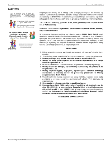 Gmina Kolbuszowa Data wydruku: 09-03-2017 01:44 BABI TARG Pasjonujesz się modą, ale w Twojej szafie brakuje już miejsca? Nie możesz się rozstać z ulubionymi sukienkami, dostałaś kolejny sweterek w okropnym kolorze? Zapraszamy na BABI TARG! To spotkanie, podczas którego pozbędziesz się ubrań zalegających na dnie Twojej szafy oraz za grosze upolujesz niepowtarzalną okazję. 12.12.2015r. (sobota), godzina 9-11, sala gimnastyczna Zespołu Szkół nr1 w Kolbuszowej Na BABIM TARGU możesz wymieniać, sprzedawać i kupować odzież, torebki, buty i inne akcesoria. W programie imprezy znajdzie się również sekcja MAMI BABI TARG, czyli wymiana, sprzedaż lub kupno ciuszków dziecięcych i ciążowych. Przy dźwiękach spokojnej muzyczki możesz za grosze kupić, wymienić na lepszy model, czy sprzedać, to co Ci się znudziło lub było nietrafionym prezentem. Pamiętaj, że jeśli transakcja wymiany nie dojdzie do skutku, zawsze można negocjować cenę towaru. Łap okazję i przychodź, a nie pożałujesz!!!!! BABI TARG REGULAMIN: 1. Każda uczestniczka może wymieniać, sprzedawać lub kupować ubrania, buty, dodatki. 2. Przyniesiony towar powinien być w dobrym stanie tzn. czysty, nieuszkodzony. 3. Brama parkingu przy szkole zostanie otwarta o godzinie 8.00. 4. Wstęp na salę gimnastyczną uczestników wystawiających swoje ubrania o godzinie 8.15. 5. Uczestnicy BABAIEGO TARGU rozkładają przyniesione rzeczy i je wyceniają. 6. Osoby chętne do zakupu, czy wymiany zapraszamy od godziny 9.00 do godziny 11.00. 7. Osoby wymieniające, kupujące, sprzedające ubrania składają darowiznę w wolnej kwoty na potrzeby placówki, w której zorganizowano BABI TARG. 8. Uczestniczki nie muszą przynosić ze sobą stolików, krzeseł, które będą pomocne w wyeksponowaniu przyniesionych ubrań. Tym zajmują się organizatorzy. 9. Organizatorzy nie odpowiadają za zgubiony towar. 10. Zgłoszenia na BABI TARG należy złożyć osobiście lub telefonicznie do dnia 04.12.2015r. w sekretariacie Zespołu Szkół nr1 w Kolbuszowej, ulica Kościuszki 1, tel. 172271950. W powyższym zgłoszeniu powinna znaleźć się informacja o ilości potrzebnych stolików, krzeseł, imię i nazwisko osoby przynoszącej towar oraz jego rodzaj. SERDECZNIE ZAPRASZAMY!!!! Obrońców Pokoju 21, 36-100 Kolbuszowa 1