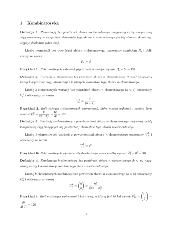 Definicja 4. Kombinacją k-elementową bez powtórzeń zbioru n-elementowego (k ¬ n) nazywamy każdy k-elementowy podzbiór tego zbioru n-elementowego.