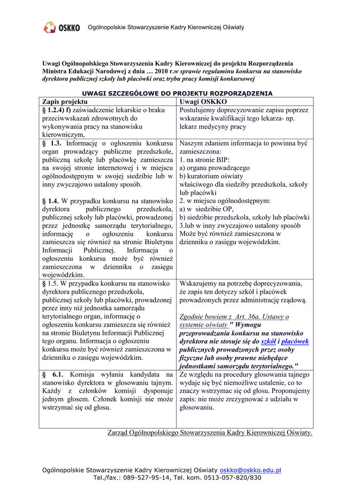 Ogólnopolskie Stowarzyszenie Kadry Kierowniczej Oświaty Uwagi Ogólnopolskiego Stowarzyszenia Kadry Kierowniczej do projektu Rozporządzenia Ministra Edukacji Narodowej z dnia … 2010 r.w sprawie regulaminu konkursu na stanowisko dyrektora publicznej szkoły lub placówki oraz trybu pracy komisji konkursowej UWAGI SZCZEGÓŁOWE DO PROJEKTU ROZPORZĄDZENIA Zapis projektu § 1.2.4) f) zaświadczenie lekarskie o braku przeciwwskazań zdrowotnych do wykonywania pracy na stanowisku kierowniczym, § 1.3. Informację o ogłoszeniu konkursu organ prowadzący publiczne przedszkole, publiczną szkołę lub placówkę zamieszcza na swojej stronie internetowej i w miejscu ogólnodostępnym w swojej siedzibie lub w inny zwyczajowo ustalony sposób. § 1.4. W przypadku konkursu na stanowisko dyrektora publicznego przedszkola, publicznej szkoły lub placówki, prowadzonej przez jednostkę samorządu terytorialnego, informację o ogłoszeniu konkursu zamieszcza się również na stronie Biuletynu Informacji Publicznej. Informacja o ogłoszeniu konkursu może być również zamieszczona w dzienniku o zasięgu wojewódzkim. § 1.5. W przypadku konkursu na stanowisko dyrektora publicznego przedszkola, publicznej szkoły lub placówki, prowadzonej przez inny niż jednostka samorządu terytorialnego organ, informację o ogłoszeniu konkursu zamieszcza się również na stronie Biuletynu Informacji Publicznej tego organu. Informacja o ogłoszeniu konkursu może być również zamieszczona w dzienniku o zasięgu wojewódzkim. § 6.1. Komisja wyłania kandydata na stanowisko dyrektora w głosowaniu tajnym. Każdy z członków komisji dysponuje jednym głosem. Członek komisji nie może wstrzymać się od głosu. Uwagi OSKKO Postulujemy doprecyzowanie zapisu poprzez wskazanie kwalifikacji tego lekarza- np. lekarz medycyny pracy Naszym zdaniem informacja to powinna być zamieszczona: 1. na stronie BIP: a) organu prowadzącego b) kuratorium oświaty właściwego dla siedziby przedszkola, szkoły lub placówki 2. w miejscu ogólnodostępnym: a) w siedzibie OP, b) siedzibie przedszkola, szkoły lub placówki 3.lub w inny zwyczajowo ustalony sposób Może być również zamieszczona w dzienniku o zasięgu wojewódzkim. Wskazujemy na potrzebę doprecyzowania, że zapis ten dotyczy szkół i placówek prowadzonych przez administrację rządową. Zgodnie bowiem z Art. 36a. Ustawy o systemie oświaty " Wymogu przeprowadzania konkursu na stanowisko dyrektora nie stosuje się do szkół i placówek publicznych prowadzonych przez osoby fizyczne lub osoby prawne niebędące jednostkami samorządu terytorialnego." Ze względu na procedury głosowania tajnego wydaje się być niemożliwe ustalenie, co to znaczy wstrzymac się od głosu. Proponujemy zapis: nie może zrezygnować z udziału w głosowaniu. Zarząd Ogólnopolskiego Stowarzyszenia Kadry Kierowniczej Oświaty. Ogólnopolskie Stowarzyszenie Kadry Kierowniczej Oświaty [email protected] Tel./fax.: 089-527-95-14, Tel. kom. 0513-057-820/830