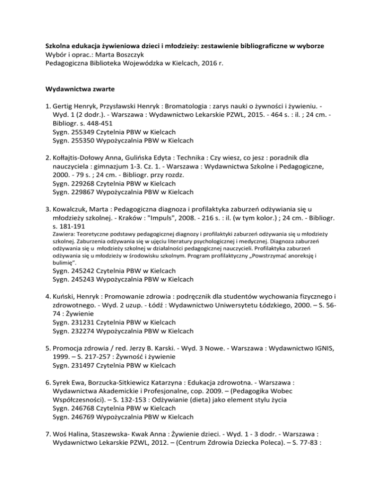 1. Gertig Henryk, Przysławski Henryk : Bromatologia : zarys nauki o żywności i żywieniu. Wyd. 1 (2 dodr.). - Warszawa : Wydawnictwo Lekarskie PZWL, 2015. - 464 s. : il. ; 24 cm. Bibliogr. s. 448-451