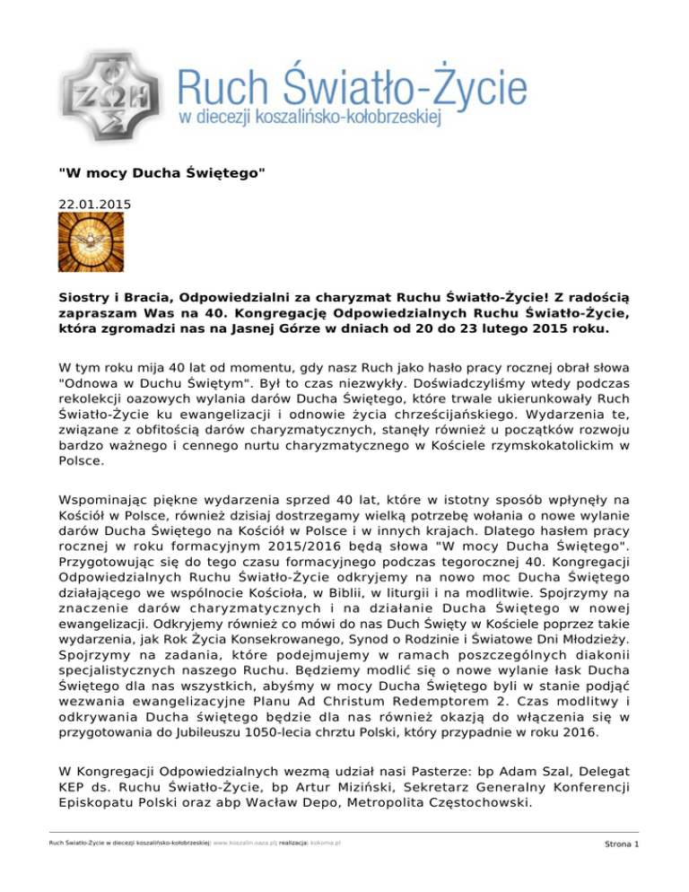 "W mocy Ducha Świętego" 22.01.2015 Siostry i Bracia, Odpowiedzialni za charyzmat Ruchu Światło-Życie! Z radością zapraszam Was na 40. Kongregację Odpowiedzialnych Ruchu Światło-Życie, która zgromadzi nas na Jasnej Górze w dniach od 20 do 23 lutego 2015 roku. W tym roku mija 40 lat od momentu, gdy nasz Ruch jako hasło pracy rocznej obrał słowa "Odnowa w Duchu Świętym". Był to czas niezwykły. Doświadczyliśmy wtedy podczas rekolekcji oazowych wylania darów Ducha Świętego, które trwale ukierunkowały Ruch Światło-Życie ku ewangelizacji i odnowie życia chrześcijańskiego. Wydarzenia te, związane z obfitością darów charyzmatycznych, stanęły również u początków rozwoju bardzo ważnego i cennego nurtu charyzmatycznego w Kościele rzymskokatolickim w Polsce. Wspominając piękne wydarzenia sprzed 40 lat, które w istotny sposób wpłynęły na Kościół w Polsce, również dzisiaj dostrzegamy wielką potrzebę wołania o nowe wylanie darów Ducha Świętego na Kościół w Polsce i w innych krajach. Dlatego hasłem pracy rocznej w roku formacyjnym 2015/2016 będą słowa "W mocy Ducha Świętego". Przygotowując się do tego czasu formacyjnego podczas tegorocznej 40. Kongregacji Odpowiedzialnych Ruchu Światło-Życie odkryjemy na nowo moc Ducha Świętego działającego we wspólnocie Kościoła, w Biblii, w liturgii i na modlitwie. Spojrzymy na znaczenie darów charyzmatycznych i na działanie Ducha Świętego w nowej ewangelizacji. Odkryjemy również co mówi do nas Duch Święty w Kościele poprzez takie wydarzenia, jak Rok Życia Konsekrowanego, Synod o Rodzinie i Światowe Dni Młodzieży. Spojrzymy na zadania, które podejmujemy w ramach poszczególnych diakonii specjalistycznych naszego Ruchu. Będziemy modlić się o nowe wylanie łask Ducha Świętego dla nas wszystkich, abyśmy w mocy Ducha Świętego byli w stanie podjąć wezwania ewangelizacyjne Planu Ad Christum Redemptorem 2. Czas modlitwy i odkrywania Ducha świętego będzie dla nas również okazją do włączenia się w przygotowania do Jubileuszu 1050-lecia chrztu Polski, który przypadnie w roku 2016. W Kongregacji Odpowiedzialnych wezmą udział nasi Pasterze: bp Adam Szal, Delegat KEP ds. Ruchu Światło-Życie, bp Artur Miziński, Sekretarz Generalny Konferencji Episkopatu Polski oraz abp Wacław Depo, Metropolita Częstochowski. Ruch Światło-Życie w diecezji koszalińsko-kołobrzeskiej: www.koszalin.oaza.pl; realizacja: kokoma.pl Strona 1 Wśród zaproszonych na Kongregację Odpowiedzialnych prelegentów usłyszymy: ks. Grzegorza Strzelczyka – dogmatyka, ks. Tomasza Tomaszewskiego – biblistę i moderatora diecezjalnego diecezji koszalińsko-kołobrzeskiej, ks. Tomasza Bacia – liturgistę, przełożonego w Wyższym Seminarium Duchownym w Rzeszowie, ks. Grzegorza Suchodolskiego – Sekretarza generalnego komitetu organizacyjnego Światowych Dni Młodzieży w roku 2016, ks. Wojciecha Nowackiego – dogmatyka i proboszcza oraz pp. Joannę i Roberta Dawidczyków – koordynatorów krajowych Odnowy w Duchu Świętym, ks. Ryszarda Nowaka – moderatora diecezjalnego archidiecezji katowickiej, proboszcza, ks. Zbigniewa Snarskiego – proboszcza i teologa duchowości ze wspólnoty Kairos w Białymstoku, członka Komisji Teologiczno-Programowej Ruchu Światło-Życie, Katarzynę i Pawła Maciejewskich – Parę Krajową Domowego Kościoła, Jolantę Szpilarewicz – Odpowiedzialną Główna Instytutu Niepokalanej Matki Kościoła oraz s. Małgorzatę Glanc – Przełożoną Wspólnoty Dzieci Łaski Bożej. Głos zabiorą także odpowiedzialni za centralne diakonie specjalistyczne: Dorota Domańska, Marek Filar, ks. Wojciech Ignasiak, Wojciech Kosmowski, Dorota i Łukasz Kozyrowie, Marcin Łęczycki, Grażyna Miąsik, Anna Pełka, Marcin Skłodowski, Wioletta i Michał Szepietowscy, a także Iwona i Jacek Wolscy oraz Mirosława Chmielewicz. Podczas Kongregacji będziemy radować się charyzmatem spotkania z siostrami i braćmi z Polski i z innych krajów, którzy, wraz z członkami Diakonii Misyjnej, już dzień przed 40. Kongregacją Odpowiedzialnych zgromadzą się w gościnnym Domu Ruchu Światło-Życie archidiecezji częstochowskiej na 20. Międzynarodowym Spotkaniu "Parresia". Podczas tego spotkania będą modlić się i zastanawiać nad tym, jak w mocy Ducha Świętego rozszerzać charyzmat naszego Ruchu w swoich krajach dla ewangelizacyjnej odnowy Kościoła. Tegoroczna, jubileuszowa 40. Kongregacja Odpowiedzialnych na Jasnej Górze będzie również niezwykła, ponieważ po raz pierwszy w historii Ruchu Światło-Życie spotkanie to poprowadzi Moderator Generalny, który równocześnie podejmuje posługę biskupa pomocniczego w archidiecezji katowickiej. Niech czas tegorocznej 40. Kongregacji Odpowiedzialnych pozwoli nam wszystkim nabrać duchowych sił do wszelkich zadań, które podejmiemy w mocy Ducha Świętego w Ruchu Światło-Życie. Do zobaczenia na Jasnej Górze! Zapraszam do licznego udziału w 40. Kongregacji Odpowiedzialnych Ruchu Światło-Życie! Niech zstąpi Duch Twój i odnowi oblicze ziemi! Tej ziemi! Pan niech będzie z Wami! bp Adam Wodarczyk moderator generalny Ruchu Światło-Życie MATERIAŁY PRZYGOTOWUJĄCE DO UDZIAŁU W KONGREGACJI Ruch Światło-Życie w diecezji koszalińsko-kołobrzeskiej: www.koszalin.oaza.pl; realizacja: kokoma.pl Strona 2 PROGRAM Piątek, 20 lutego 18:30 Możliwość uczestniczenia w Eucharystii 20:00 Modlitwa rozpoczynająca Kongregację Sobota, 21 lutego 8:00 Jutrznia – ks. Tomasz Opaliński, moderator krajowy Domowego Kościoła 9:00 Otwarcie Kongregacji, zawiązanie wspólnoty i prezentacja piosenki roku OŻK 2015 9:30 Słowo programowe – bp Adam Wodarczyk, moderator generalny Ruchu Światło-Życie 10:15 Moc Ducha Świętego w Kościele. Jedna osoba w wielu osobach – ks. dr Grzegorz Strzelczyk 10:45 Moc Ducha Świętego w Biblii – ks. dr Tomasz Tomaszewski 11:15 Moc Ducha Świętego w liturgii – ks. dr Tomasz 