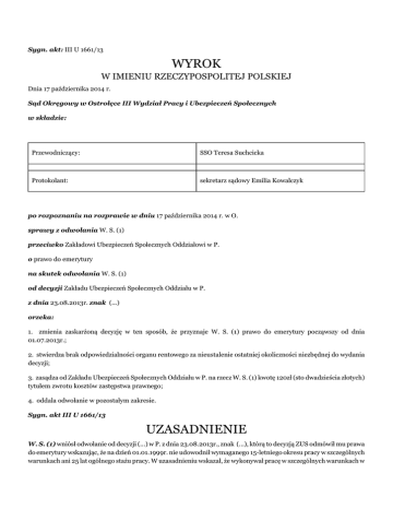 Sygn. akt: III U 1661/13 WYROK W IMIENIU RZECZYPOSPOLITEJ POLSKIEJ Dnia 17 października 2014 r. Sąd Okręgowy w Ostrołęce III Wydział Pracy i Ubezpieczeń Społecznych w składzie: Przewodniczący: SSO Teresa Suchcicka Protokolant: sekretarz sądowy Emilia Kowalczyk po rozpoznaniu na rozprawie w dniu 17 października 2014 r. w O. sprawy z odwołania W. S. (1) przeciwko Zakładowi Ubezpieczeń Społecznych Oddziałowi w P. o prawo do emerytury na skutek odwołania W. S. (1) od decyzji Zakładu Ubezpieczeń Społecznych Oddziału w P. z dnia 23.08.2013r. znak (...) orzeka: 1. zmienia zaskarżoną decyzję w ten sposób, że przyznaje W. S. (1) prawo do emerytury począwszy od dnia 01.07.2013r.; 2. stwierdza brak odpowiedzialności organu rentowego za nieustalenie ostatniej okoliczności niezbędnej do wydania decyzji; 3. zasądza od Zakładu Ubezpieczeń Społecznych Oddziału w P. na rzecz W. S. (1) kwotę 120zł (sto dwadzieścia złotych) tytułem zwrotu kosztów zastępstwa prawnego; 4. oddala odwołanie w pozostałym zakresie. Sygn. akt III U 1661/13 UZASADNIENIE W. S. (1) wniósł odwołanie od decyzji (...) w P. z dnia 23.08.2013r., znak (...), którą to decyzją ZUS odmówił mu prawa do emerytury wskazując, że na dzień 01.01.1999r. nie udowodnił wymaganego 15-letniego okresu pracy w szczególnych warunkach ani 25 lat ogólnego stażu pracy. W uzasadnieniu wskazał, że wykonywał pracę w szczególnych warunkach w okresach: od 15.11.1975r. do 30.06.1981r., od 11.04.1989r. do 30.06.1998r. i od 01.07.1998r. do 30.11.2001r. Wskazał też, że w okresach od 28.02.1969r. do 17.10.1972r. i od 17.07.1981r. do 31.12.1982r. pracował w gospodarstwie rolnym. W odpowiedzi na odwołanie Zakład Ubezpieczeń Społecznych Oddział w P. wniósł o jego oddalenie. W uzasadnieniu podniósł, że W. S. (1) na dzień 01.01.1999r. udowodnił okres pracy wynoszący 22 lata i 22 dni okresów składkowych oraz 6 miesięcy i 13 dni okresów nieskładkowych, tj. łącznie 22 lata, 7 miesięcy i 5 dni. Odwołujący nie udokumentował zatem wymaganych 25 lat pracy. W stażu pracy nie uwzględniono okresu od 10.10.1975r. do 14.11.1975r., ponieważ okres od zwolnienia ze służby wojskowej do dnia podjęcia pracy u pracodawcy nie jest wymieniony w ustawie o emeryturach i rentach z FUS, jako okres składkowy łub nieskładkowy. Nie uwzględniono także okresów przebywania na urlopie bezpłatnym w okresach od 08.06.1987r. do 13.06.1987r., od 22.06.1987r. do 30.06.1987r. i od 06.07.1987r. do 30.09.1987r. Ponadto do ogólnego stażu pracy Oddział ZUS nie uwzględnił okresu pracy w gospodarstwie rolnym rodziców od 28.05.1969r. do 17.10.1972r, i od 17.07.1981r. do 31.12.1982r., ponieważ na okoliczność tej pracy odwołujący przedstawił jedynie własne oświadczenie. Brak jest zeznań co najmniej dwóch świadków oraz dokumentów potwierdzających, że w okresie objętym zeznaniami rodzice odwołującego posiadali gospodarstwo rolne i o jakiej powierzchni, a także poświadczenia zameldowania odwołującego w miejscowości, w której było gospodarstwo rolne oraz, czy w okresie od 17.07.1981r. do 31.12.1982r. rodzice odwołującego opłacali składki na ubezpieczenie społeczne rolników. Poza tym brak jest informacji, czy odwołujący uczęszczał do szkoły i w jakiej odległości znajdowała się szkoła od miejsca zamieszkania oraz gdzie odwołujący zamieszkiwał w okresie kontynuowania nauki. Zdaniem ZUS, na dzień 01.01.1999r. odwołujący nie udokumentował żadnego okresu pracy w szczególnych warunkach. Do pracy w szczególnych warunkach Oddział ZUS nie uwzględnił następujących okresów pracy: • od 15.11.1975r. do 30.06.1981r. w Miejskim Przedsiębiorstwie (...) w W., ponieważ w świadectwie pracy z dnia 01.07.1981r. zakład pracy podał, że odwołujący pracował na stanowisku kierowcy, które nie jest stanowiskiem uprawniającym do nabycia wcześniejszych uprawnień emerytalnych. Oprócz ww. świadectwa odwołujący przedstawił także świadectwo wykonywania pracy w szczególnych warunkach z dnia 14.11.2001r. wydane przez Przedsiębiorstwo Produkcyjno- Usługowo- Handlowe (...) S.A. w W., w którym wykazano, że odwołujący w ww. okresie wykonywał prace na stanowisku kierowcy samochodu ciężarowego o ciężarze całkowitym powyżej 3,5 tony wymienionym w wykazie A, dziale VIII Transport, poz. 2 zawartym w załączniku do rozporządzenia RM z dnia 07.02.1983r. W świadectwie tym zakład pracy nie powołał się na przepisy resortowe, a poza tym brak jest informacji, czy ww. PPUH (...) S.A. w W. jest następcą prawnym po byłym Przedsiębiorstwie (...) w W.; • od 11.04.1989r. do 30.06.1998r. i od 01.07.1998r. do 31.12.1998r. w (...) Sp. z o.o. w O., ponieważ w świadectwach wykonywania prac w szczególnych warunkach (karty 50 i 51 a. e. nr (...) - (...)) brak jest określenia charakteru wykonywanej przez odwołującego pracy na stanowisku obsługa zespołu przenośników pływających od 11.04.1989r. do 30.06.1998r. i na stanowisku obsługa maszyn do robót ziemnych od 01.07.1998r. do 30.11.2001r., ściśle według wykazu, działu i pozycji rozporządzenia RM z dnia 07.02.1983r. Biorąc powyższe pod uwagę Oddział ZUS stwierdził, że odwołujący W. S. (1) na dzień wydania zaskarżonej decyzji nie spełnił przesłanek do nabycia prawa do emerytury według przepisów art. 184 powołanej ustawy o emeryturach i rentach z Funduszu Ubezpieczeń Społecznych, ponieważ do dnia 01.01.1999r. nie udokumentował 15 lat pracy w szczególnych warunkach wykonywanej stale i w pełnym wymiarze czasu pracy oraz nie udokumentował 25 lat ogólnego stażu pracy. Dlatego też Oddział ZUS decyzją z dnia 23.08.2013r. odmówił odwołującemu prawa do wcześniejszej emerytury. Z powyższą decyzją W. S. (1) nie zgodził się i wniósł odwołanie do Sądu Okręgowego w Ostrołęce, do którego dołączył kopie dokumentów na okoliczność pracy w gospodarstwie rolnym rodziców, tj. z