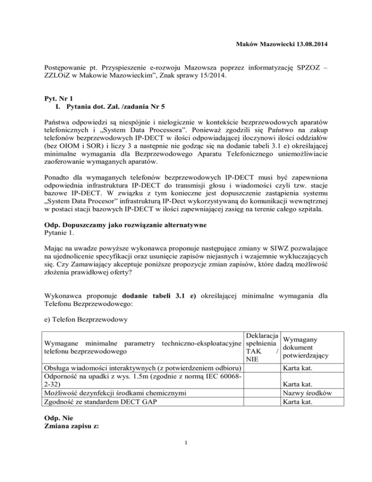 Maków Mazowiecki 13.08.2014 Postępowanie pt. Przyspieszenie e-rozwoju Mazowsza poprzez informatyzację SPZOZ – ZZLOiZ w Makowie Mazowieckim”, Znak sprawy 15/2014. Pyt. Nr 1 I. Pytania dot. Zał. /zadania Nr 5 Państwa odpowiedzi są niespójnie i nielogicznie w kontekście bezprzewodowych aparatów telefonicznych i „System Data Processora”. Ponieważ zgodzili się Państwo na zakup telefonów bezprzewodowych IP-DECT w ilości odpowiadającej iloczynowi ilości oddziałów (bez OIOM i SOR) i liczy 3 a następnie nie godząc się na dodanie tabeli 3.1 e) określającej minimalne wymagania dla Bezprzewodowego Aparatu Telefonicznego uniemożliwiacie zaoferowanie wymaganych aparatów. Ponadto dla wymaganych telefonów bezprzewodowych IP-DECT musi być zapewniona odpowiednia infrastruktura IP-DECT do transmisji głosu i wiadomości czyli tzw. stacje bazowe IP-DECT. W związku z tym konieczne jest dopuszczenie zastąpienia systemu „System Data Procesor” infrastrukturą IP-Dect wykorzystywaną do komunikacji wewnętrznej w postaci stacji bazowych IP-DECT w ilości zapewniającej zasięg na terenie całego szpitala. Odp. Dopuszczamy jako rozwiązanie alternatywne Pytanie 1. Mając na uwadze powyższe wykonawca proponuje następujące zmiany w SIWZ pozwalające na ujednolicenie specyfikacji oraz usunięcie zapisów niejasnych i wzajemnie wykluczających się. Czy Zamawiający akceptuje poniższe propozycje zmian zapisów, które dadzą możliwość złożenia prawidłowej oferty? Wykonawca proponuje dodanie tabeli 3.1 e) określającej minimalne wymagania dla Telefonu Bezprzewodowego: e) Telefon Bezprzewodowy Deklaracja Wymagany Wymagane minimalne parametry techniczno-eksploatacyjne spełnienia dokument telefonu bezprzewodowego TAK / potwierdzający NIE Obsługa wiadomości interaktywnych (z potwierdzeniem odbioru) Karta kat. Odporność na upadki z wys. 1.5m (zgodnie z normą IEC 600682-32) Karta kat. Możliwość dezynfekcji środkami chemicznymi Nazwy środków Zgodność ze standardem DECT GAP Karta kat. Odp. Nie Zmiana zapisu z: 1 „System komunikacji wewnętrznej w standardzie SDP (Signal Data Procesor) zintegrowany w pełni z systemem przywoławczym będącym częścią systemu przyzywowego, musi zapewnić zasięg umożliwiający komunikację przewodową na terenie całego budynku szpitala i musi składać się co najmniej z następujących elementów: System Data Procesor –2 szt. Deklaracja Wymagany Wymagane minimalne parametry techniczno-eksploatacyjne spełnienia dokument dot. stacji bazowej IP-DECT TAK / potwierdzający NIE 2 szyny główne –każda po 96 łóżek w systemie Karta kat. 2 szyny główne (RS232C) do podłączenia central Karta kat. przywoławczych Konfiguracja i administracja poprzez centralę przywoławczą Karta kat. Złączne RS232C do podłączenia korytarzowych wyświetlaczy LED Karta kat. Złączne RS232C do podłączenia komputera PC Karta kat. Zasilanie 15 DCV Karta kat. Złącze RJ12do podłączenia tablicy z listą chorych Karta kat. Zewnętrzna dioda LED sygnalizująca status urządzenia Karta kat. Zewnętrzna dioda LED sygnalizująca awarię systemu Karta kat. Temperatura pracy od 0°C do +50°C Karta kat. ” Na: „System komunikacji wewnętrznej w standardzie SDP (Signal Data Procesor) zintegrowany w pełni z systemem przywoławczym będącym częścią systemu przyzywowego, musi zapewnić zasięg umożliwiający komunikację przewodową na terenie całego budynku szpitala i musi składać się co najmniej z następujących elementów: System Data Procesor –2 szt. Deklaracja Wymagane minimalne parametry techniczno-eksploatacyjne spełnienia dot. stacji bazowej IP-DECT TAK / NIE 2 szyny główne –każda po 96 łóżek w systemie 2 szyny główne (RS232C) do podłączenia central przywoławczych Konfiguracja i administracja poprzez centralę przywoławczą Złączne RS232C do podłączenia korytarzowych wyświetlaczy LED Złączne RS232C do podłączenia komputera PC Zasilanie 15 DCV Złącze RJ12do podłączenia tablicy z listą chorych Zewnętrzna dioda LED sygnalizująca status urządzenia Zewnętrzna dioda LED sygnalizująca awarię systemu 2 Wymagany dokument potwierdzający Karta kat. Karta kat. Karta kat. Karta kat. Karta kat. Karta kat. Karta kat. Karta kat. Karta kat. Temperatura pracy od 0°C do +50°C Karta kat. lub System komunikacji wewnętrznej w standardzie DECT zintegrowany w pełni z systemem przywoławczym będącym częścią systemu przyzywowego, musi zapewnić zasięg umożliwiający komunikację bezprzewodową na terenie całego budynku szpitala i musi składać się co najmniej z następujących elementów: Stacja bazowa IP-DECT w ilości zapewniającej zasięg na terenie całego budynku szpitala. Deklaracja Wymagane minimalne parametry techniczno-eksploatacyjne dot. spełnienia stacji bazowej IP-DECT TAK / NIE Zgodność ze standardem DECT GAP Konfiguracja i administracja przez przeglądarkę www Złącze RJ45 do podłączenia do sieci LAN Min. 8 kanałów rozmównych Min. 1 dedykowany kanał do przesyłania wiadomości przywoławczych „ Odp. Tak zgoda jako rozwiązanie alternatywne Wymagany dokument potwierdzający Karta kat. Karta kat. Karta kat. Karta kat. Karta kat. Pyt Nr 2 1. Dotyczy: Specyfikacja Istotnych Warunków Zamówienia z dnia 25.07.2014 - WYMAGANIA DOTYCZĄCE SZKOLEŃ Pytanie 1. Prosimy o podanie szczegółowych informacji ile osób musi być przeszkolonych z konkretnego zakresu. W obecnej formie Informacje udostępnione przez Zamawiającego są zbyt ogólne, a jasnym jest, że nie będzie konieczności szkolenia całości personelu medycznego np. z modułu „Pogotowie”, „Blok Operacyjny” lub „Sterylizatornia”. Podane przez Zamawiającego ilości osób będą miały duży wpływ na wartość kalkulowanej oferty. Odp. Cały personel ( 500 osób ) ze wszystkich zakresów co jest związane z mobilnością personelu. 3 Pyt Nr 3 W Załączniku 13 do SIWZ „Umowa” w paragrafie 8, pkt.3 Gw