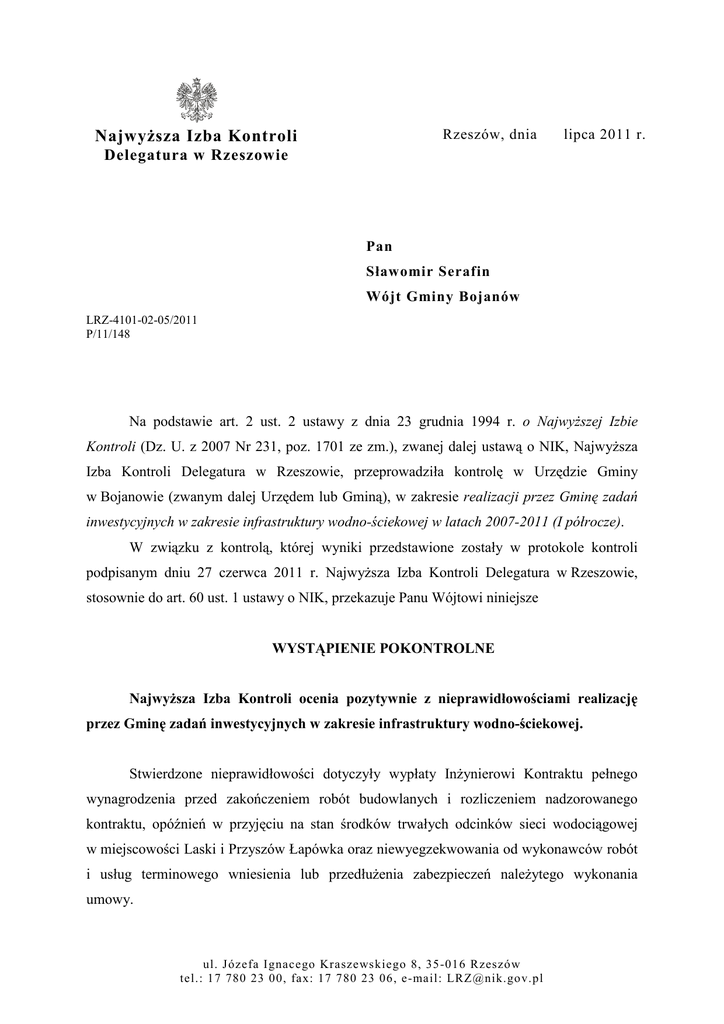 Rzeszów, dnia NajwyŜsza Izba Kontroli lipca 2011 r. Delegatura w Rzeszowie Pan Sławomir Serafin Wójt Gminy Bojanów LRZ-4101-02-05/2011 P/11/148 Na podstawie art. 2 ust. 2 ustawy z dnia 23 grudnia 1994 r. o NajwyŜszej Izbie Kontroli (Dz. U. z 2007 Nr 231, poz. 1701 ze zm.), zwanej dalej ustawą o NIK, NajwyŜsza Izba Kontroli Delegatura w Rzeszowie, przeprowadziła kontrolę w Urzędzie Gminy w Bojanowie (zwanym dalej Urzędem lub Gminą), w zakresie realizacji przez Gminę zadań inwestycyjnych w zakresie infrastruktury wodno-ściekowej w latach 2007-2011 (I półrocze). W związku z kontrolą, której wyniki przedstawione zostały w protokole kontroli podpisanym dniu 27 czerwca 2011 r. NajwyŜsza Izba Kontroli Delegatura w Rzeszowie, stosownie do art. 60 ust. 1 ustawy o NIK, przekazuje Panu Wójtowi niniejsze WYSTĄPIENIE POKONTROLNE NajwyŜsza Izba Kontroli ocenia pozytywnie z nieprawidłowościami realizację przez Gminę zadań inwestycyjnych w zakresie infrastruktury wodno-ściekowej. Stwierdzone nieprawidłowości dotyczyły wypłaty InŜynierowi Kontraktu pełnego wynagrodzenia przed zakończeniem robót budowlanych i rozliczeniem nadzorowanego kontraktu, opóźnień w przyjęciu na stan środków trwałych odcinków sieci wodociągowej w miejscowości Laski i Przyszów Łapówka oraz niewyegzekwowania od wykonawców robót i usług terminowego wniesienia lub przedłuŜenia zabezpieczeń naleŜytego wykonania umowy. ul. Józefa Ignacego Kraszewskiego 8, 35-016 Rzeszów tel.: 17 780 23 00, fax: 17 780 23 06, e-mail: [email protected] NajwyŜsza Izba Kontroli pozytywnie ocenia przygotowanie organizacyjno-finansowe Gminy do realizacji zadań inwestycyjnych w zakresie infrastruktury wodno-ściekowej. Kontrola wykazała, Ŝe w Gminie planowano na lata 2007-2015 realizację 6 zadań inwestycyjnych w zakresie wykonania infrastruktury wodno-ściekowej, z których do dnia kontroli zrealizowano 5 na łączną kwotę 18.175.088,68 zł. W trakcie realizacji pozostawało zadanie pn. budowa kanalizacji sanitarnej w miejscowości Bojanów ul. Kolbuszowska i ul. Rzeszowska o wartości 2.194.840,49 zł. Umowa z wykonawcą zawarta została w dniu 6 maja 2011 r. Planowany termin zakończenia realizacji zadania określono na dzień 30 lipca 2012 r. Według stanu na dzień 31 maja 2011 r. długość istniejącej na ternie Gminy sieci wodociągowej wynosiła 128,23 km i obejmowała wszystkie miejscowości Gminy, a sieci kanalizacyjnej wynosiła 32,644 km i obejmowała dwie z dziewięciu miejscowości Gminy. Na dzień 31 grudnia 2010 r. nastąpił wzrost liczby mieszkańców korzystających z sieci wodociągowej, w porównaniu do dnia 1 stycznia 2007 r. o 1.038, tj. o 16,8%. Według stanu na 31 grudnia 2010 r. z sieci wodociągowej korzystało 7.220 mieszkańców Gminy, tj. 97% mieszkańców (7.437). Pierwszy odcinek sieci kanalizacyjnej Gminy o długości 32,644 km oddany został na podstawie protokołu odbioru końcowego z dnia 29 kwietnia 2011 r. Liczba mieszkańców korzystających z sieci kanalizacyjnej na koniec maja 2011 r. wynosiła 1.515 i była niŜsza od planowanej o 356 osób, tj. o19 %. Spowodowane to było tym, Ŝe pomimo zakończenia realizacji projektu, nie zakończono jeszcze realizacji przyłączy do sieci kanalizacyjnej. Obecnie trwa wykonywanie przyłączy do nowych nieruchomości. Realizacją przełączy zajmują się dwa, zawiązane w tym celu, stowarzyszenia. NajwyŜsza Izba Kontroli stwierdza, Ŝe Gmina realizowała zadania wynikające z Krajowego Programu Oczyszczania Ścieków Komunalnych (KPOŚK). Zakres rzeczowy zadań zgłoszonych do KPOŚK i terminy ich realizacji dla aglomeracji Bojanów (PLPK 131) na lata 2007-2015, obejmował budowę 45 km sieci kanalizacyjnej oraz budowę nowej oczyszczalni ścieków o przepustowości 800 m3/d (dla całej aglomeracji). Do dnia 31 maja 2011 r. wybudowano 32,644 km sieci kanalizacyjnej, tj. 72,5% planowanej (45 km) oraz oddano do uŜytkowania nową oczyszczalnię ścieków o średniej przepustowości 566 m3/d. PowyŜsze zadania były zgodne z Wieloletnimi Programami Inwestycyjnymi zatwierdzonymi przez Radę Gminy. 2 Ustalono, Ŝe Gmina w latach 2007-2011 (do dnia 31 maja) zrealizowała 5 zadań inwestycyjnych w zakresie budowy infrastruktury wodno-ściekowej na łączną kwotę 18.175.088,68 zł, w tym 4 zadania w zakresie budowy infrastruktury wodociągowej na kwotę 155.125,95 zł oraz 1 zadanie w zakresie budowy infrastruktury kanalizacyjnej na kwotę 18.019.962,74 zł. NajwyŜsza Izba Kontroli ocenia pozytywnie z nieprawidłowościami przygotowanie i realizację przez Gminę 3 poddanych kontroli zadań inwestycyjnych, w tym: budowę kanalizacji sanitarnej Gminy Bojanów w miejscowościach Stany i Bojanów wraz z gminną oczyszczalnią ścieków w miejscowości Stany (zwanej dalej budową kanalizacji sanitarnej i oczyszczalni ścieków) na kwotę 18.019.962,74 zł oraz budowę 2 odcinków sieci wodociągowej dla osiedli budownictwa jednorodzinnego w miejscowości Laski i Przyszów Łapówka na łączną kwotę 86.367,60 zł. Gmina posiadała kompletną i aktualną dokumentację budowlaną realizowanych zadań inwestycyjnych, w tym projekty budowlane, pozwolenia na budowę, decyzje o środowiskowych uwarunkowaniach zgody na budowę sieci kanalizacyjnej i oczyszczalni ścieków oraz pozwolenie wodnoprawne na wprowadzanie ścieków oczyszczonych do rzeki Łęg, z datą waŜności do dnia 9 marca 2019 r. Przed wydaniem decyzji określających środowiskowe uwarunkowania zgody na realizację ww. zadań przeprowadzone zostały konsultacje społeczne. Gmina posiadała prawo do dysponowania nieruchomościami przeznaczonymi na cele budowlane, w tym prawo własności działek wykorzystywanych pod inwestycje oraz umowy cywilno-prawne z właścicielami pozostałych działek, na wejście w teren, w celu wykonania robót związanych z wykonaniem kanalizacji sanitarnej. Inwestycje sieci kanalizacyjnej i oczyszczalni ścieków prowadzone były n