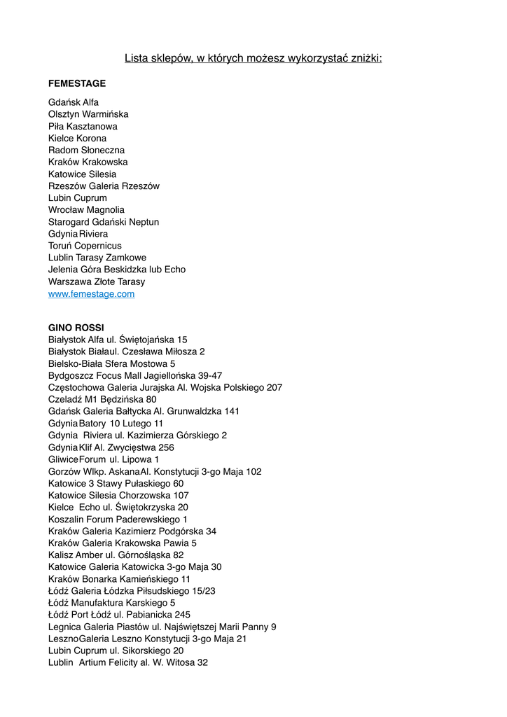 Lista sklepów, w których możesz wykorzystać zniżki: FEMESTAGE Gdańsk Alfa Olsztyn Warmińska Piła Kasztanowa Kielce Korona Radom Słoneczna Kraków Krakowska Katowice Silesia Rzeszów Galeria Rzeszów Lubin Cuprum Wrocław Magnolia Starogard Gdański Neptun Gdynia Riviera Toruń Copernicus Lublin Tarasy Zamkowe Jelenia Góra Beskidzka lub Echo Warszawa Złote Tarasy www.femestage.com GINO ROSSI Białystok Alfa ul. Świętojańska 15 Białystok Białaul. Czesława Miłosza 2 Bielsko-Biała Sfera Mostowa 5 Bydgoszcz Focus Mall Jagiellońska 39-47 Częstochowa Galeria Jurajska Al. Wojska Polskiego 207 Czeladź M1 Będzińska 80 Gdańsk Galeria Bałtycka Al. Grunwaldzka 141 Gdynia Batory 10 Lutego 11 Gdynia Riviera ul. Kazimierza Górskiego 2 Gdynia Klif Al. Zwycięstwa 256 GliwiceForum ul. Lipowa 1 Gorzów Wlkp. AskanaAl. Konstytucji 3-go Maja 102 Katowice 3 Stawy Pułaskiego 60 Katowice Silesia Chorzowska 107 Kielce Echo ul. Świętokrzyska 20 Koszalin Forum Paderewskiego 1 Kraków Galeria Kazimierz Podgórska 34 Kraków Galeria Krakowska Pawia 5 Kalisz Amber ul. Górnośląska 82 Katowice Galeria Katowicka 3-go Maja 30 Kraków Bonarka Kamieńskiego 11 Łódź Galeria Łódzka Piłsudskiego 15/23 Łódź Manufaktura Karskiego 5 Łódź Port Łódź ul. Pabianicka 245 Legnica Galeria Piastów ul. Najświętszej Marii Panny 9 LesznoGaleria Leszno Konstytucji 3-go Maja 21 Lubin Cuprum ul. Sikorskiego 20 Lublin Artium Felicity al. W. Witosa 32 Lublin Plaza ul.Lipowa 13 Olsztyn Warmińska ul. Tuwima 26 Opole Rynek 27 Rynek 27 Nowy Sącz Trzy Korony ul. Lwowska 80 Płock MazoviaWyszogrodzka 127 Poznań Malta Abpa A. Baraniaka 8 Poznań Stary Browar Półwiejska 42 Piła Galeria VIVO 14 lutego 26 Poznań Poznań City Center ul. Stanisława Matyi 2 RadomGaleria Słoneczna Chrobrego 1 Rybnik Plaza Raciborska 16 Rzeszów City Center Marszałka J. Piłsudskiego 44 RadomM1 Grzecznarowskiego 28 Szczecin Galaxy Al. Wyzwolenia 18 Szczecin Galeria Kaskada Al. Niepodległości 36 Siedlce Galeria Siedlce ul. Piłsudskiego 74 Stare Miasto/k Konin Ferio Ogrodowa 31a TarnówGemini Nowodąbrowska 127 Toruń Copernicus Żółkiewskiego 15 Toruń Plaza Broniewskiego 90 Warszawa Arkadia Jana Pawła II 82 Warszawa Blue City Al. Jerozolimskie 179 Warszawa Klif Okopowa 58/72 Warszawa Mokotów Wołoska 12 Warszawa Promenada Ostrobramska 75c Warszawa Wola Park ul. Górczewska 124 Warszawa Targówek Głębocka 15 Warszawa Złote Tarasy Złota 59 Warszawa Freta ul. Freta 9/11 Warszawa Janki Mszczonowska 3 Warszawa Sadyba Powśińska 31 Wrocław Bielany Czekoladowa 9 Wrocław Galeria Dominikańska Plac Dominikański 3 Wrocław Magnolia Park Legnicka 58 Wrocław Pasaż Grunwaldzki Pl. Grunwaldzki 22 Zielona Góra Focus Park Wrocławska 17 www.gino-rossi.com GOSHICO www.goshico.com