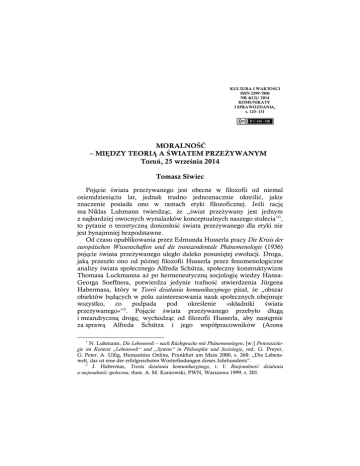 KULTURA I WARTOŚCI ISSN 2299-7806 NR 4(12)/ 2014 KOMUNIKATY I SPRAWOZDANIA, s. 125–131 MORALNOŚĆ – MIĘDZY TEORIĄ A ŚWIATEM PRZEŻYWANYM Toruń, 25 września 2014 Tomasz Siwiec Pojęcie świata przeżywanego jest obecne w filozofii od niemal osiemdziesięciu lat, jednak trudno jednoznacznie określić, jakie znaczenie posiada ono w ramach etyki filozoficznej. Jeśli rację ma Niklas Luhmann twierdząc, że „świat przeżywany jest jednym z najbardziej owocnych wynalazków konceptualnych naszego stulecia”1, to pytanie o teoretyczną doniosłość świata przeżywanego dla etyki nie jest bynajmniej bezpodstawne. Od czasu opublikowania przez Edmunda Husserla pracy Die Krisis der europäischen Wissenschaften und die transzendentale Phänomenologie (1936) pojęcie świata przeżywanego uległo daleko posuniętej ewolucji. Droga, jaką przeszło ono od późnej filozofii Husserla przez fenomenologiczne analizy świata społecznego Alfreda Schütza, społeczny konstruktywizm Thomasa Luckmanna aż po hermeneutyczną socjologię wiedzy HansaGeorga Soeffnera, potwierdza jedynie trafność stwierdzenia Jürgena Habermasa, który w Teorii działania komunikacyjnego pisał, że „obszar obiektów będących w polu zainteresowania nauk społecznych obejmuje wszystko, co podpada pod określenie »składniki świata przeżywanego«”2. Pojęcie świata przeżywanego przebyło długą i meandryczną drogę, wychodząc od filozofii Husserla, aby następnie za sprawą Alfreda Schütza i jego współpracowników (Arona 1 N. Luhmann, Die Lebenswelt – nach Rücksprache mit Phänomenologen, [w:] Protosoziologie im Kontext „Lebenswelt“ und „System“ in Philosophie und Soziologie, red. G. Preyer, G. Peter, A. Ulfig, Humanities Online, Frankfurt am Main 2000, s. 268: „Die Lebenswelt, das ist eine der erfolgreichsten Worterfindungen dieses Jahrhunderts”. 2 J. Habermas, Teoria działania komunikacyjnego, t. I: Racjonalność działania a racjonalność społeczna, tłum. A. M. Kaniowski, PWN, Warszawa 1999, s. 201. 126 Tomasz Siwiec, Moralność – między teorią a światem przeżywanym Gurwitscha, Thomasa Luckmanna, Petera L. Bergera, Richarda Grathoffa) z nowojorskiej New School for Social Research zadomowić się na obszarze nauk społecznych. W ostatnich latach również wśród filozofów wyraźnie widać ponowne zainteresowanie pojęciem świata przeżywanego. W 2008 roku w Essen odbył się XXI. Niemiecki Kongres Filozoficzny (Deutsche Kongreß für Philosophie) zatytułowany „Lebenswelt und Wissenschaft”, który stanowił silny impuls dla rozwoju niemieckojęzycznych badań nad różnymi aspektami świata przeżywanego3. Wkrótce potem Julian Nida-Rümelin opublikowałe pracę Philosophie und Lebensform, w której usiłował dokonać uzasadnienia racjonalno-normatywnych struktur świata przeżywanego, zaś Rahel Jaeggi z frakfurckiego Instytutu Badań Społecznych w książce Kritik von Lebensformen przedstawiła krytykę sposobów życia w perspektywie politycznych struktur liberalnego państwa prawa4. W Polsce koncepcja świata przeżywanego stała się znana na przełomie lat osiemdziesiątych i dziewięćdziesiątych dzięki publikacjom pod redakcją Zdzisława Krasnodębskiego5. Całkiem niedawno zaś ponownie przypomniał ją Sławomir Mandes w monografii Świat przeżywany w socjologii6. Dla etyki rozumianej jako teoria moralności, pojęcia Lebensweltu posiada kapitalne znaczenie. W tradycyjnym pytaniu „co powinienem czynić”, dochodzi do głosu nie tylko praktyczność etyki, ale także konieczność powiązania ze sobą wiedzy i działania z jednoczesnym uwzględnieniem ich wzajemnej niesprowadzalności do siebie. Jak zauważa Günter Abel „wiedza i działanie […], to ludzkie aktywności, które wypływają ze świata przeżywanego i w nim się realizują”7. Stąd też każda próba teoretycznego ujęcia ich wzajemnej relacji oznacza jednocześnie konieczność zbudowania jakiejś teorii świata przeżywanego, która powinna zmierzać w kierunku krytycznej rekonstrukcji jego normatywnych struktur. Tym samym nieuniknione 3 Por. Lebenswelt und Wissenschaft - XXI. Deutscher Kongress für Philosophie 15. – 19. September 2008. Universität Duisburg-Essen, Campus Essen, http://www.dgphil2008.de [dostęp: 2 marca 2015 r.]. 4 Por. J. Nida-Rümelin, Philosophie und Lebensform, Suhrkamp, Frankfurt am Main 2009; R. Jaeggi, Kritik von Lebensformen, Suhrkamp, Frankfurt am Main 2013. 5 Por. Fenomenologia i socjologia: zbiór tekstów, red. Z. Krasnodębski, PWN, Warszawa 1989; Świat przeżywany: fenomenologia i nauki społeczne, red. Z. Krasnodębski, PIW, Warszawa 1993. 6 S. Mandes, Świat przeżywany w socjologii, Wyd. UW, Warszawa 2012. 7 G. Abel, Sprache, Zeichen, Interpretation, Suhrkamp, Frankfurt am Main 1999, s. 300, cyt. za: A. Przyłebski, Etyka w świetle hermeneutyki, Oficyna Naukowa, Warszawa 2010, s. 146. 127 Tomasz Siwiec, Moralność – między teorią a światem przeżywanym staje się pytanie o uzasadnienie etyki oraz sposób ufundowania ważności (Geltungsfundierung) moralnego doświadczenia. Wypada bowiem zgodzić się z Bernhardem Waldenfelsem, że „gdy nie zważa się na doświadczenie, z którego wyrastają konstrukcje, te ostatnie stają się substrukcjami, podsuwanymi pod dane doświadczenia. [...] W ten sposób doświadczenia stają się ekspertyzami, działania – procedurami, a formy – formułami”8. Poszukując odpowiedzi na pytanie o możliwość etyki świata przeżywanego9, toruńskie środowisko filozoficzne zorganizowało w dniu 25 września 2014 roku konferencję naukową Moralność – między teorią a światem przeżywanym. Celem konferencji była próba udzielenia odpowiedzi na trzy podstawowe pytania: (1) czy pojęcie świata przeżywanego w etyce filozoficznej jest teoretycznie istotne, (2) czy i w jakim stopni zawiera ono potencjał zdolny do wygenerowania spójnej teorii moralności, (3) czy zmienia coś ono w uta