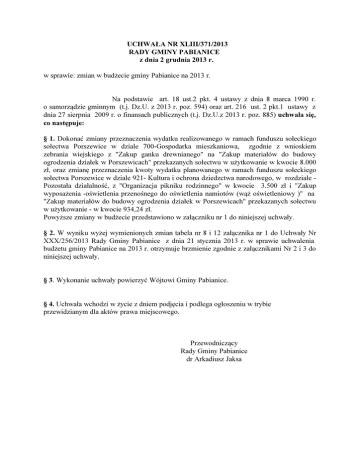 UCHWAŁA NR XLIII/371/2013 RADY GMINY PABIANICE z dnia 2 grudnia 2013 r. w sprawie: zmian w budżecie gminy Pabianice na 2013 r. Na podstawie art. 18 ust.2 pkt. 4 ustawy z dnia 8 marca 1990 r. o samorządzie gminnym (t.j. Dz.U. z 2013 r. poz. 594) oraz art. 216 ust. 2 pkt.1 ustawy z dnia 27 sierpnia 2009 r. o finansach publicznych (t.j. Dz.U.z 2013 r. poz. 885) uchwala się, co następuje: § 1. Dokonać zmiany przeznaczenia wydatku realizowanego w ramach funduszu sołeckiego sołectwa Porszewice w dziale 700-Gospodarka mieszkaniowa, zgodnie z wnioskiem zebrania wiejskiego z "Zakup ganku drewnianego" na "Zakup materiałów do budowy ogrodzenia działek w Porszewicach" przekazanych sołectwu w użytkowanie w kwocie 8.000 zł, oraz zmianę przeznaczenia kwoty wydatku planowanego w ramach funduszu sołeckiego sołectwa Porszewice w dziale 921- Kultura i ochrona dziedzctwa narodowego, w rozdziale Pozostała działalność, z "Organizacja pikniku rodzinnego" w kwocie 3.500 zł i "Zakup wyposażenia -oświetlenia przenośnego do oświetlenia namiotów (wąż oświetleniowy )" na "Zakup materiałów do budowy ogrodzenia działek w Porszewicach" przekazanych sołectwu w użytkowanie - w kwocie 934,24 zł. Powyższe zmiany w budżecie przedstawiono w załączniku nr 1 do niniejszej uchwały. § 2. W wyniku wyżej wymienionych zmian tabela nr 8 i 12 załącznika nr 1 do Uchwały Nr XXX/256/2013 Rady Gminy Pabianice z dnia 21 stycznia 2013 r. w sprawie uchwalenia budżetu gminy Pabianice na 2013 r. otrzymuje brzmienie zgodnie z załącznikami Nr 2 i 3 do niniejszej uchwały. § 3. Wykonanie uchwały powierzyć Wójtowi Gminy Pabianice. § 4. Uchwała wchodzi w życie z dniem podjęcia i podlega ogłoszeniu w trybie przewidzianym dla aktów prawa miejscowego. Przewodniczący Rady Gminy Pabianice dr Arkadiusz Jaksa Załącznik nr 1 do Uchwały Nr XLIII/371/2013 Rady Gminy Pabianice z dnia 2 grudnia 2013 r. Zmiany w budżecie gminy Pabianice na 2013 r. w wydatkach w ramach funduszu sołeckiego. Dział 700 Rozdz. § 70005 6060 921 92195 4300 4210 Treść Gospodarka mieszkaniowa Gospodarka gruntami i nieruchomościami grupa wydatków: majątkowe Wydatki na zakupy inwestycyjne zadanie: zakup ganku drewnianego zadanie: zakup materiałów do budowy ogrodzenia działek w Porszewicach Zmniejszyć 8.000 8.000 8.000 8.000 8.000 - Kultura i ochrona dziedzictwa narodowego 4.434,24 Pozostała działalność 4.434,24 grupa wydatków : bieżące statutowe 4.434,24 organizacja pikniku rodzinnego-3.500 zł zakup wyposażenia-oświetlenia przenośnego do oświetlenia namiotów (wąż oświetleniowy)- 934,24 zł Zakup usług pozostałych 3.500,00 Zakup materiałów i wyposazenia 934,24 Łącznie: Zwiększyć 12.434,24 12.434,24 12.434,24 12.434,24 12.434,24 - - 12.434,24 12.434,24