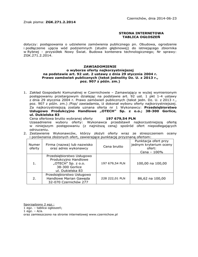 Czernichów, dnia 2014-06-23 Znak pisma: ZGK.271.2.2014 STRONA INTERNETOWA TABLICA OGŁOSZEŃ dotyczy: postępowania o udzielenie zamówienia publicznego pn. Obudowa, ogrodzenie i podłączenie ujęcia wód podziemnych (studni głębinowej) do istniejącego zbiornika w Rybnej - przysiółek Nowy Świat. Budowa kontenera technologicznego; Nr sprawy: ZGK.271.2.2014. ZAWIADOMIENIE o wyborze oferty najkorzystniejszej na podstawie art. 92 ust. 2 ustawy z dnia 29 stycznia 2004 r. Prawo zamówień publicznych (tekst jednolity Dz. U. z 2013 r., poz. 907 z późn. zm.) 1. Zakład Gospodarki Komunalnej w Czernichowie – Zamawiający w wyżej wymienionym postępowaniu przetargowym działając na podstawie art. 92 ust. 1 pkt 1-4 ustawy z dnia 29 stycznia 2004 r. Prawo zamówień publicznych (tekst jedn. Dz. U. z 2013 r., poz. 907 z późn. zm.) /Pzp/ zawiadamia, iż dokonał wyboru oferty najkorzystniejszej. Za najkorzystniejszą została uznana oferta nr 1 Wykonawcy: Przedsiębiorstwo Usługowo Produkcyjno Handlowe „OTECH” Sp. z o.o.; 38-300 Gorlice, ul. Dukielska 83 Cena ofertowa brutto wybranej oferty 197 679,54 PLN Uzasadnienie wyboru oferty: Wykonawca przedstawił najkorzystniejszą ofertę w niniejszym postępowaniu (z najniższą ceną) spośród ofert niepodlegających odrzuceniu. 2. Zestawienie Wykonawców, którzy złożyli oferty wraz ze streszczeniem oceny i porównania złożonych ofert, zawierające punktację przyznaną ofertom: Punktacja ofert przy jednym kryterium oceny Numer Firma (nazwa) lub nazwisko Cena brutto ofert: oferty oraz adres wykonawcy Cena – 100% Przedsiębiorstwo Usługowo Produkcyjno Handlowe 197 679,54 PLN 1. „OTECH” Sp. z o.o. 100,00 na 100,00 38-300 Gorlice ul. Dukielska 83 Przedsiębiorstwo Usługowo 228 222,01 PLN Handlowe Marian Gawęda 2. 86,62 na 100,00 32-070 Czernichów 277 Sporządzono 2 egz.: 1 egz. – tablica ogłoszeń; 1 egz. – A/a. oraz zamieszczono na stronie internetowej www.czernichow.pl